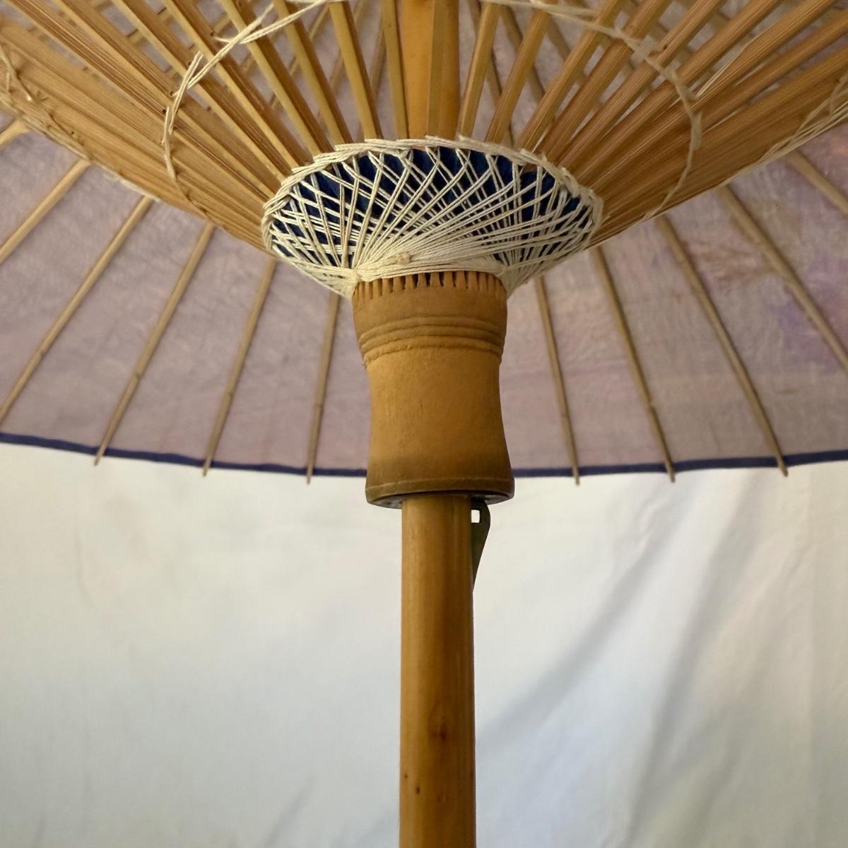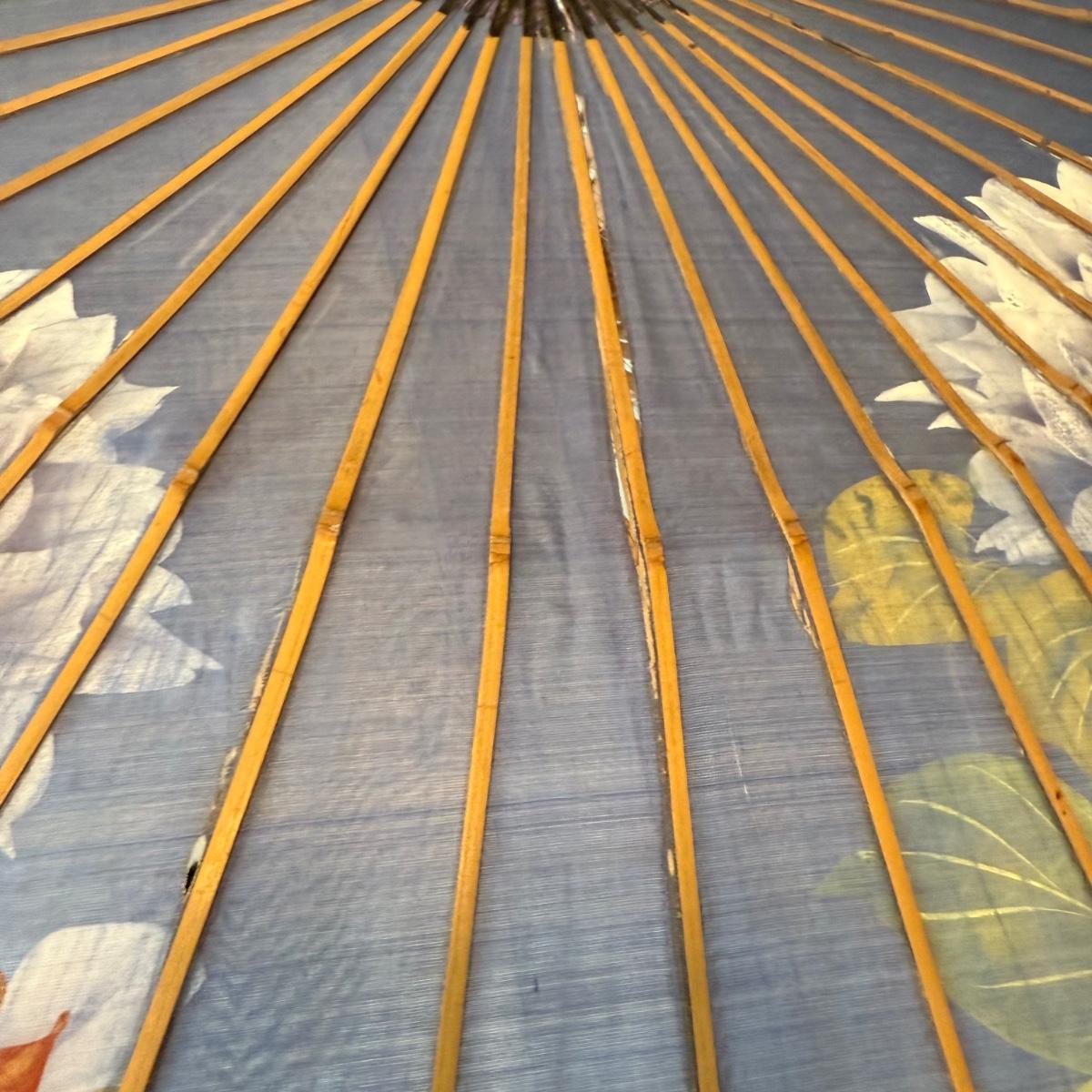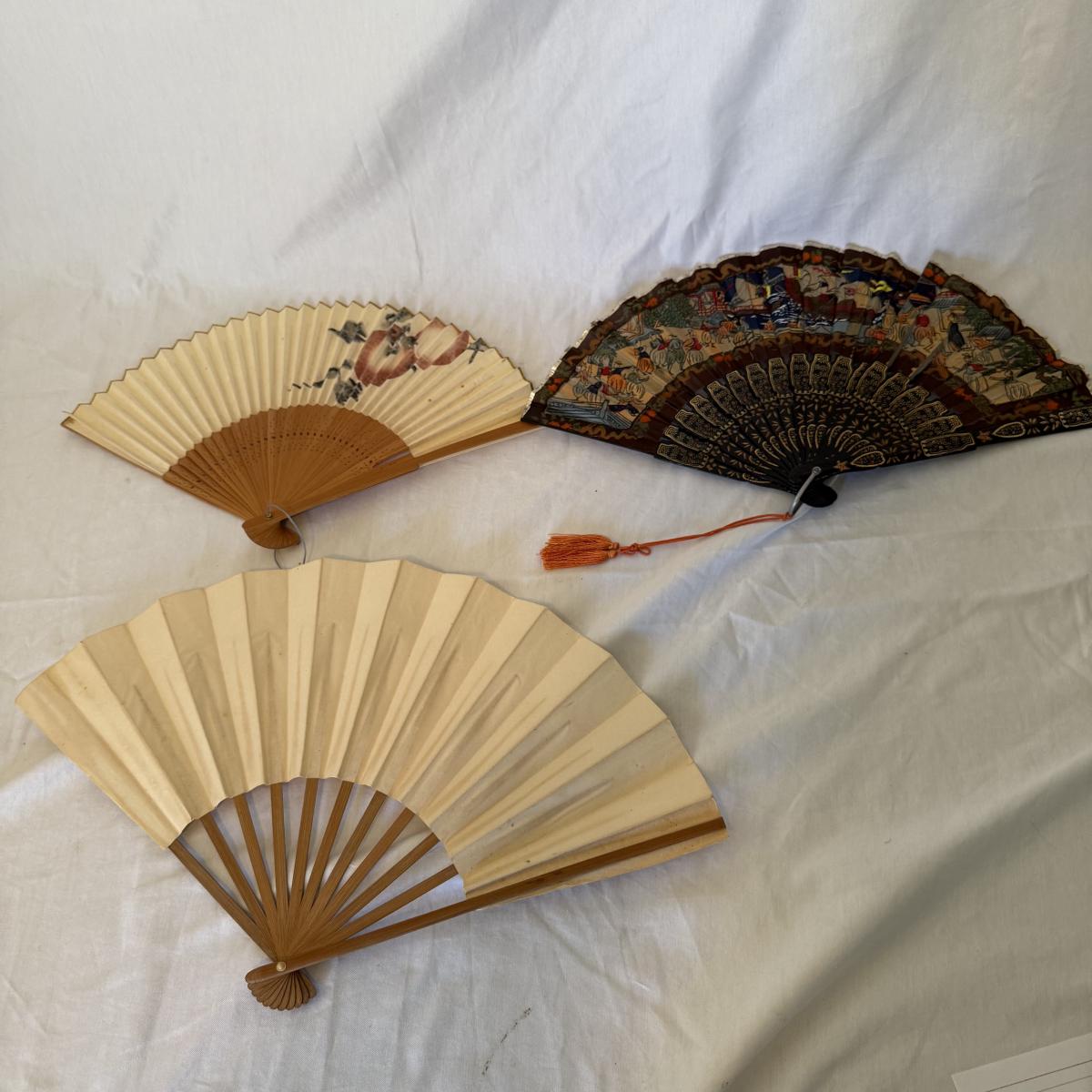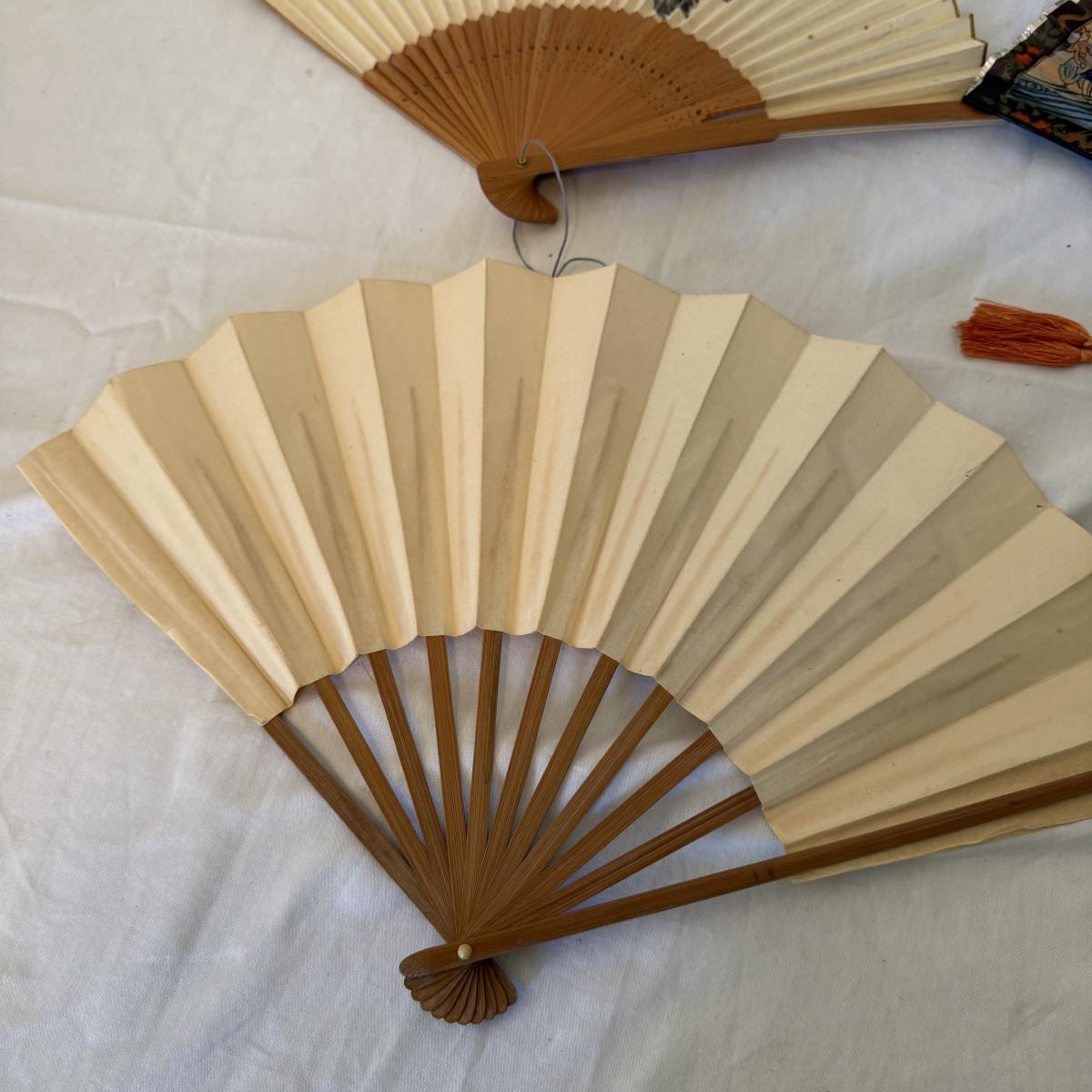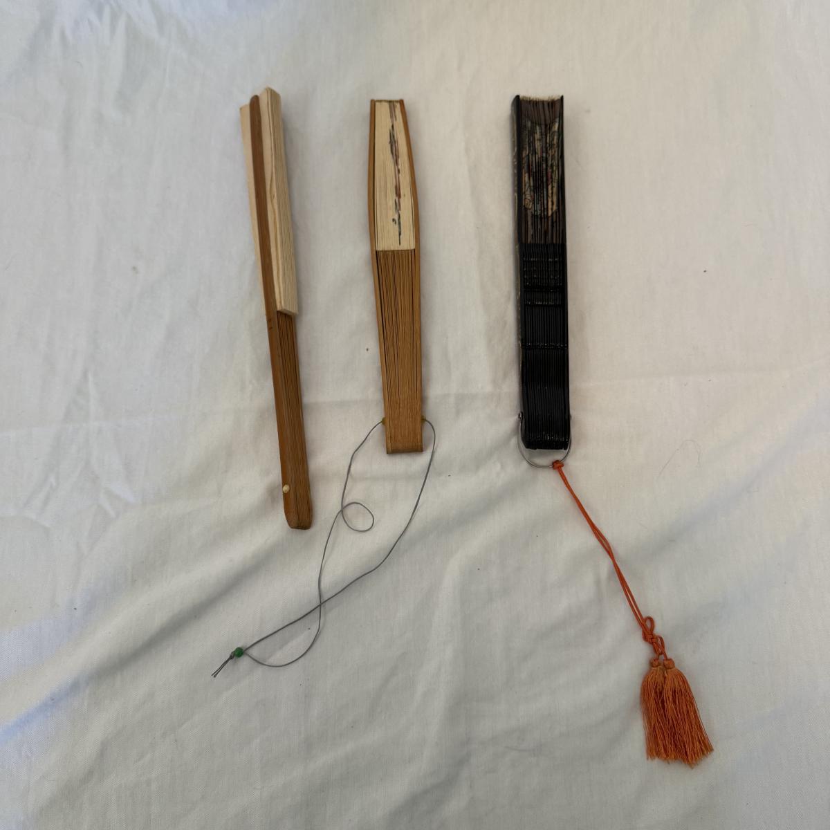 This lot contains nine Japanese hair combs with a case, three fans, and a gorgeous hand-painted navy silk parasol. Starting with the parasol, this piece has a bamboo handle and features beautiful blooming roses. It measures about 32”D when erect x 26”H. There is a small tear, see pictures for details. Next is a small collection of nine stunning Japanese decorative combs, all with slightly different ornate details. They all measure approximately 3.5” x 2” and come with what appears to be silk, case. One of the black combs has some shell inlays that have chipped, see pictures for details. Next we have three folding hand fans. The first appears to be plain bamboo and paper. The second also appears to be bamboo and paper and has what appears to be a hand-painted fruit bloom on one side. The last fan is a stunning, what appears to be hand-painted bamboo fan with a detailed rendition of a harbor scene on the leaf part of the fan. This fan is a bit torn in some places, see pictures for details. Shipping available.