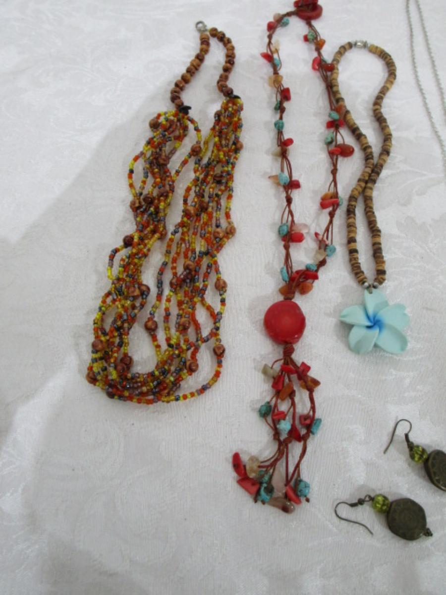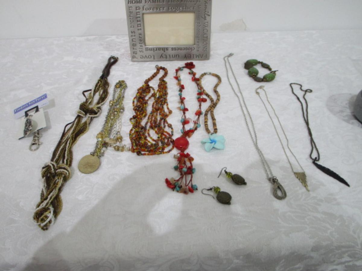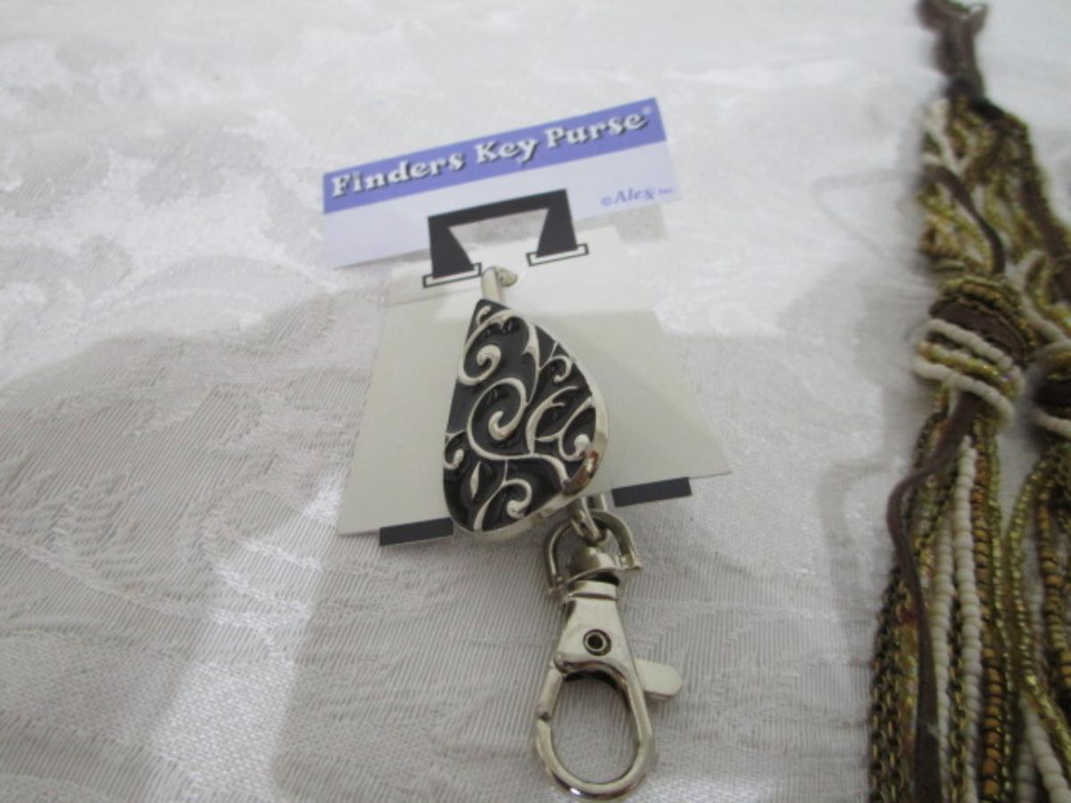 Jewelry box, 8 necklaces, 1 bracelet, 1 pr earrings, 1 Finders Keypers