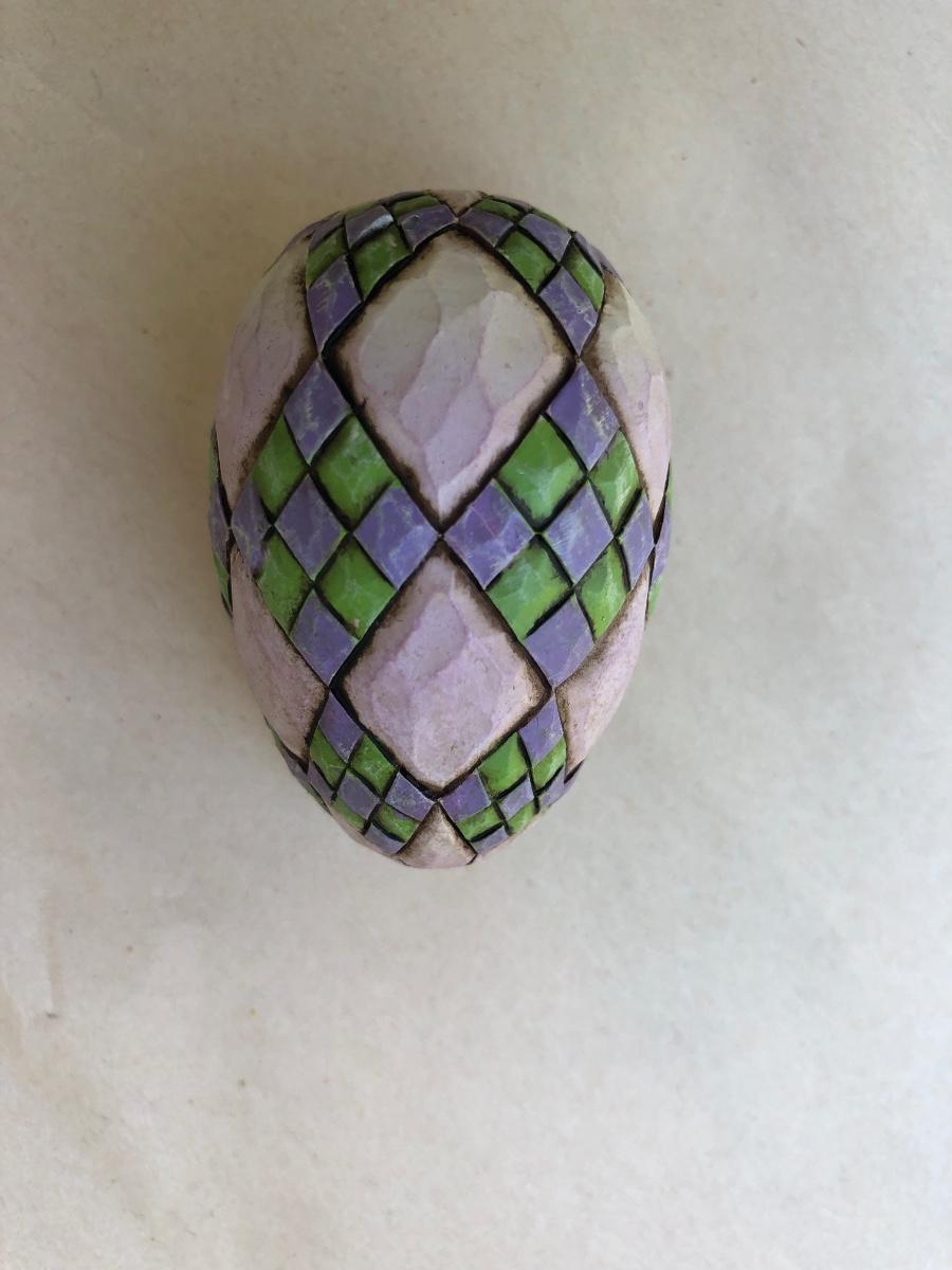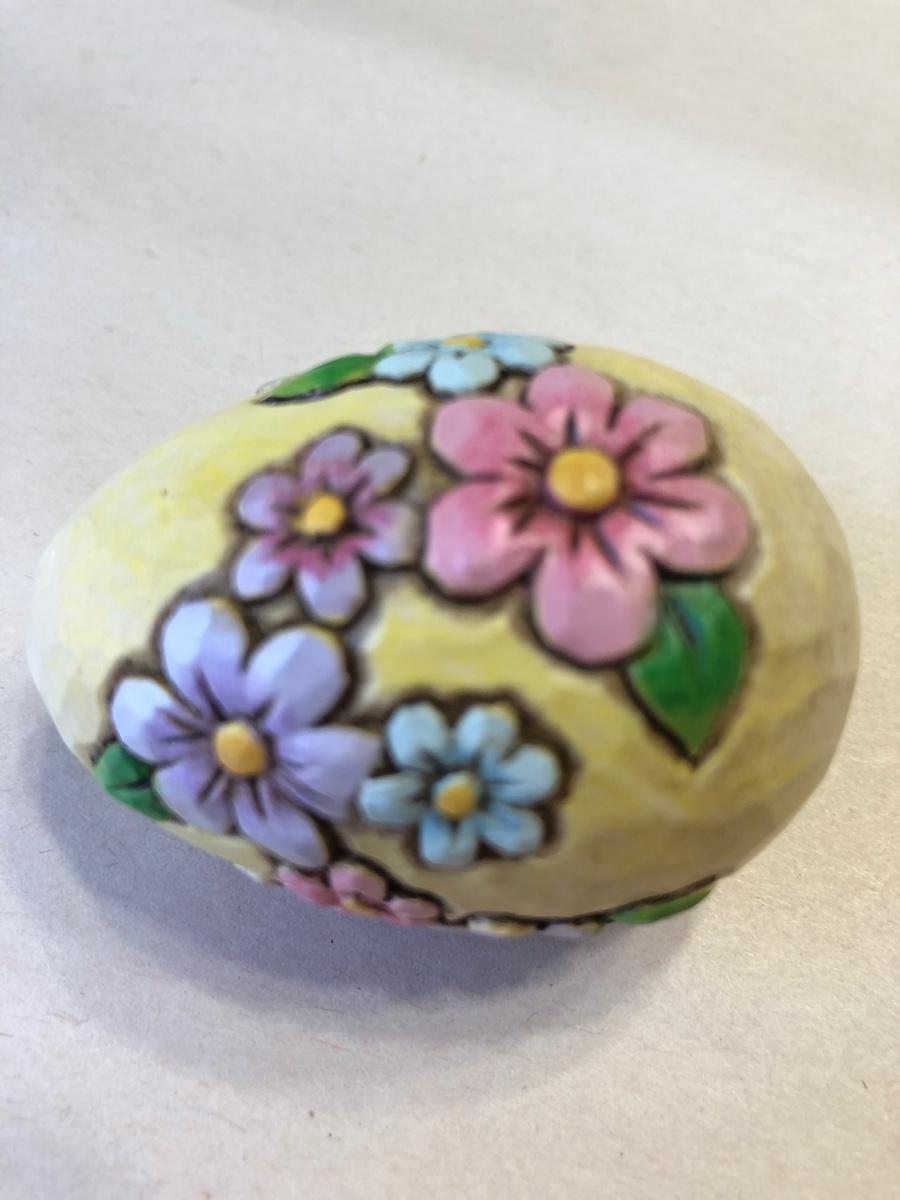 5 piece boldly colored and detailed basket with 4 eggs. 8 in tall.
