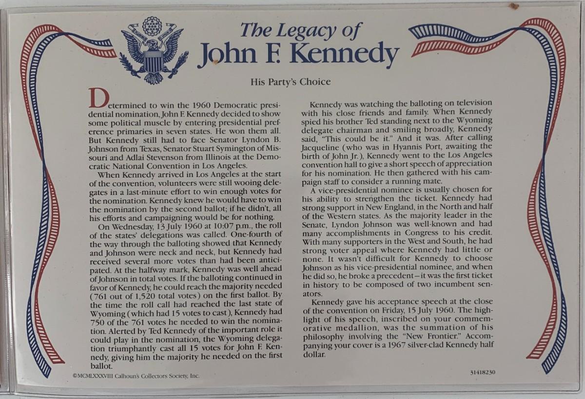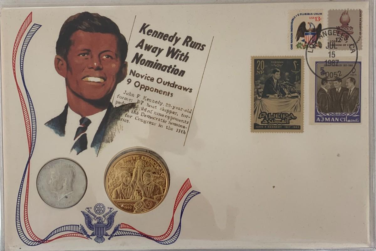 John F. Kennedy commemorative cover featuring artwork, stamps, medallion and uncirculated half dollar. 6x9 inches