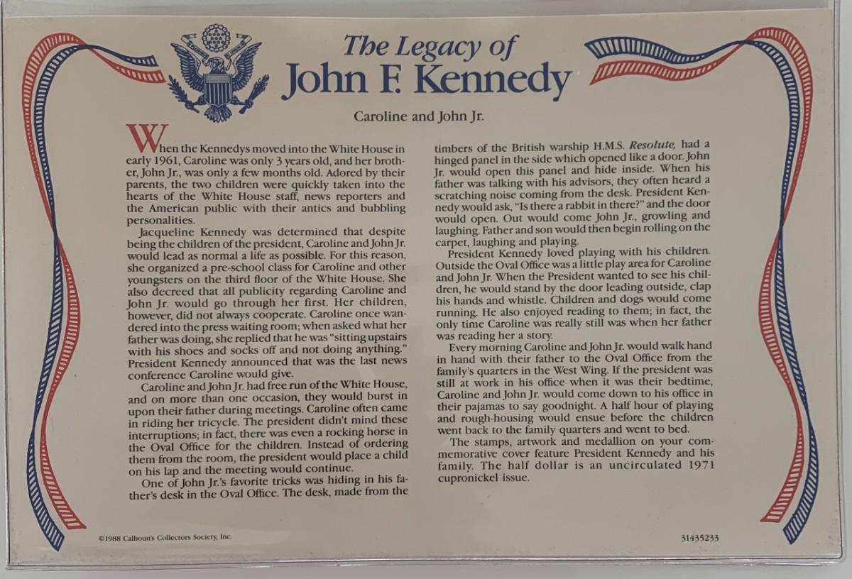 John F. Kennedy commemorative cover featuring artwork, stamps, medallion and uncirculated half dollar. 6x9 inches