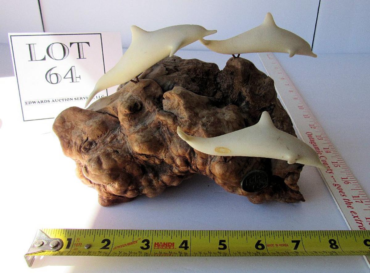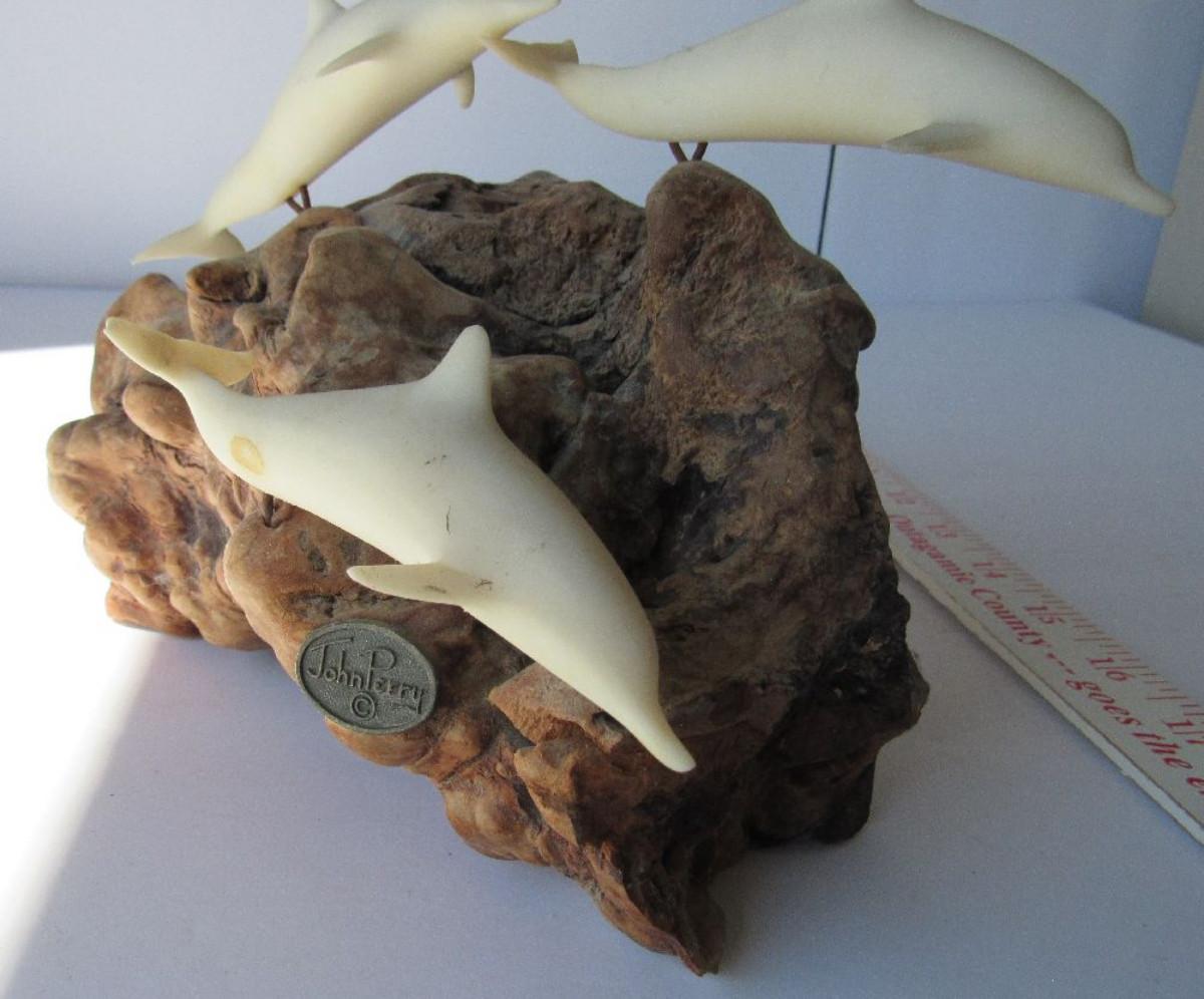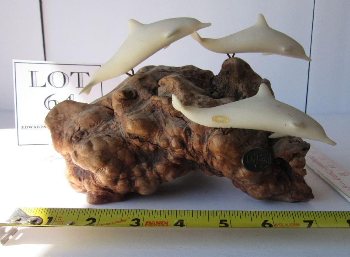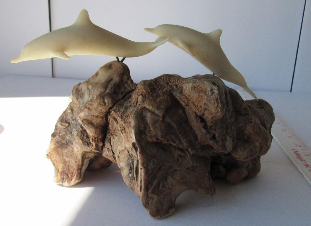 The front dolphin has a small chip on tail and melt ? spot on side. Needs cleaning.