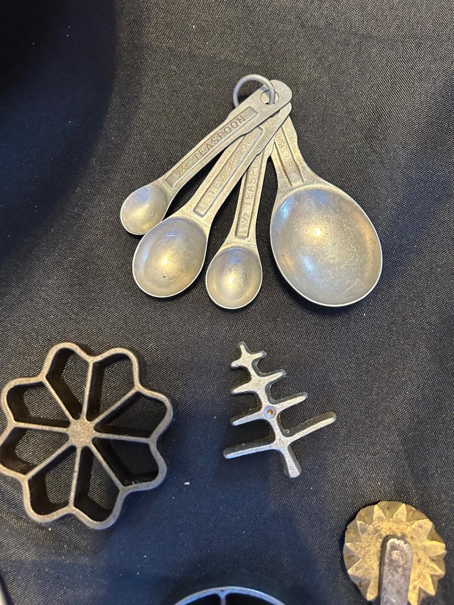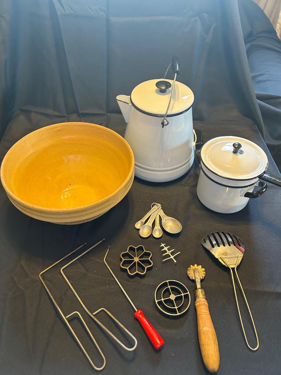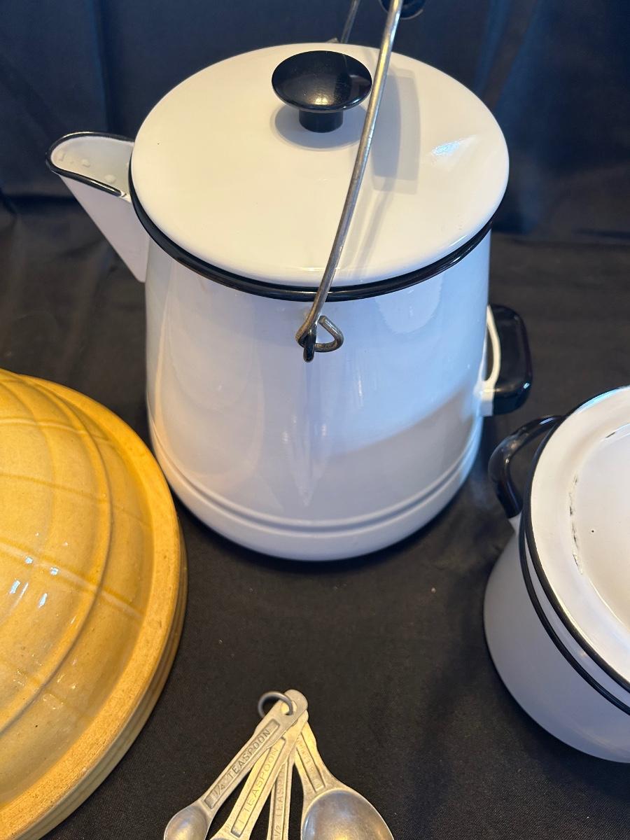 Vintage rosette iron, measuring spoons, enamel cookware double boiler with lid and large coffee carafe with lid McCoy number for 11 inch large mixing bowl.