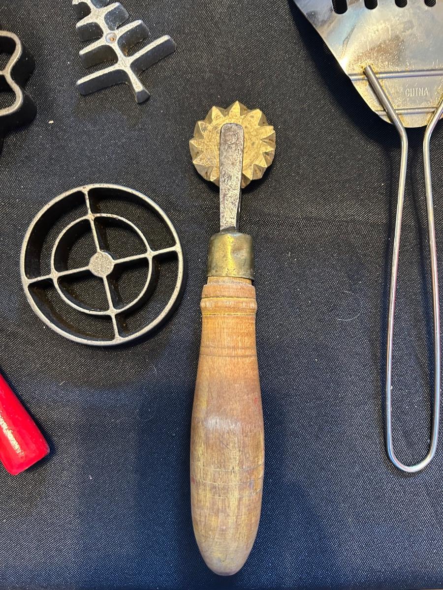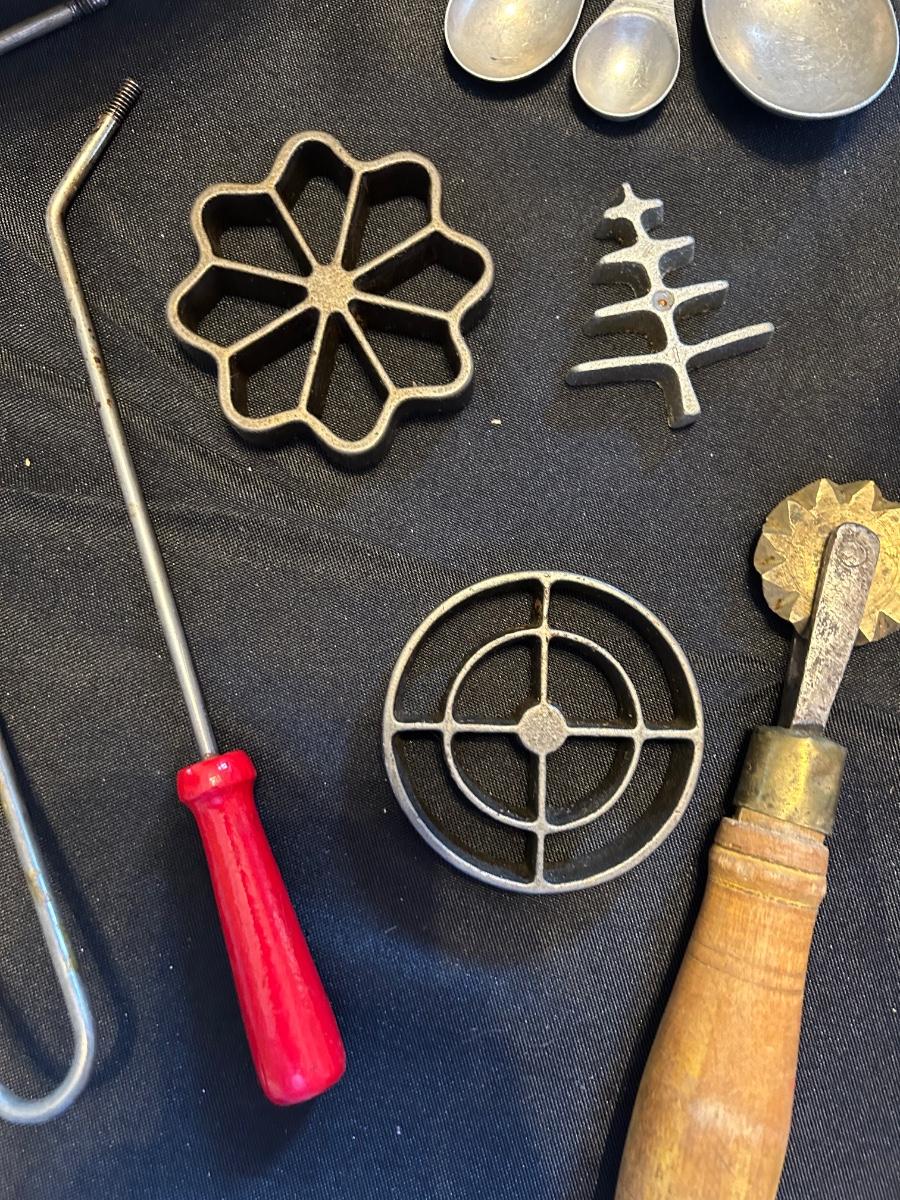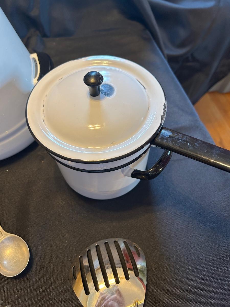 Vintage rosette iron, measuring spoons, enamel cookware double boiler with lid and large coffee carafe with lid McCoy number for 11 inch large mixing bowl.