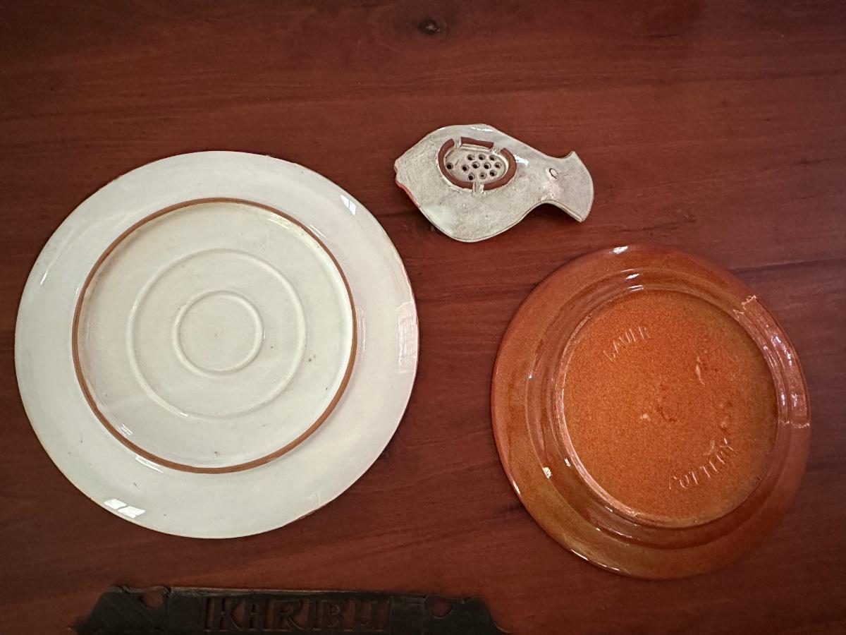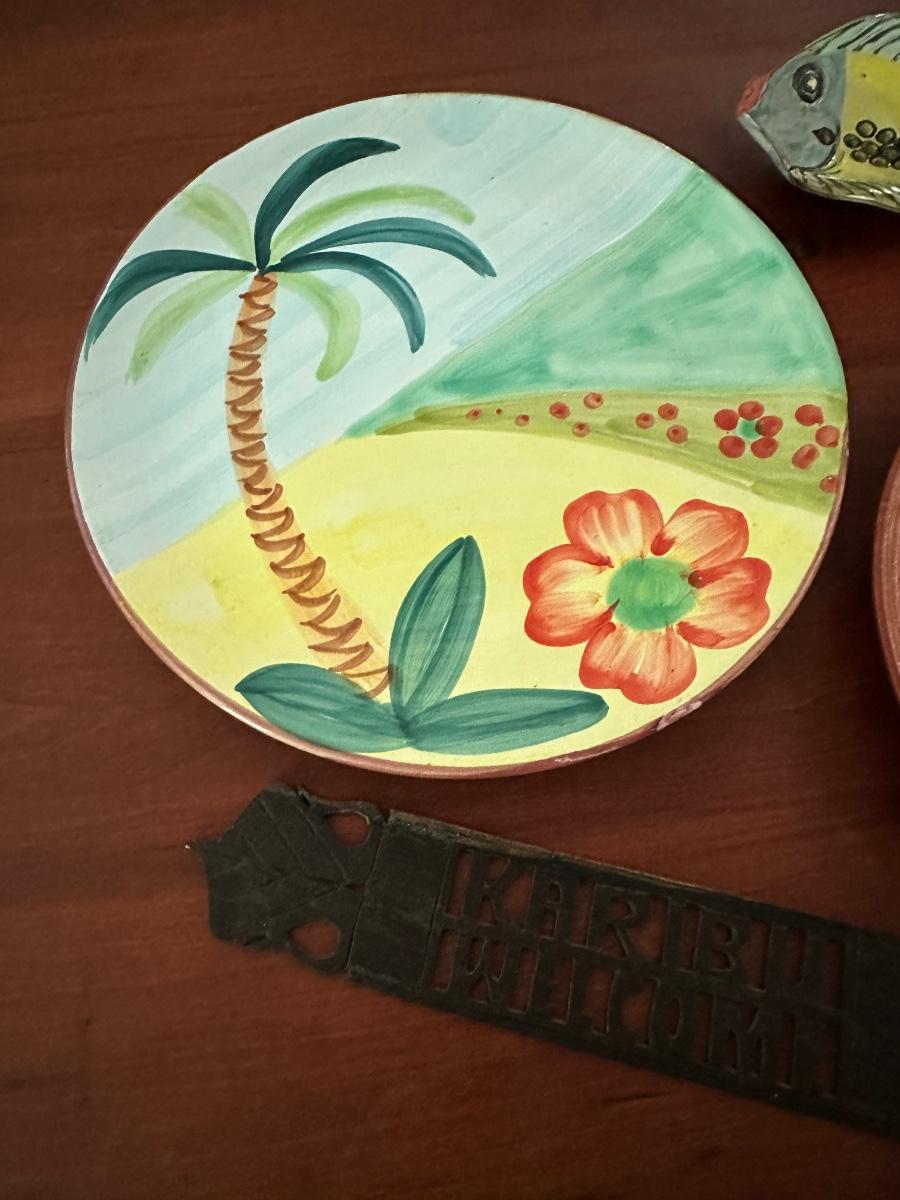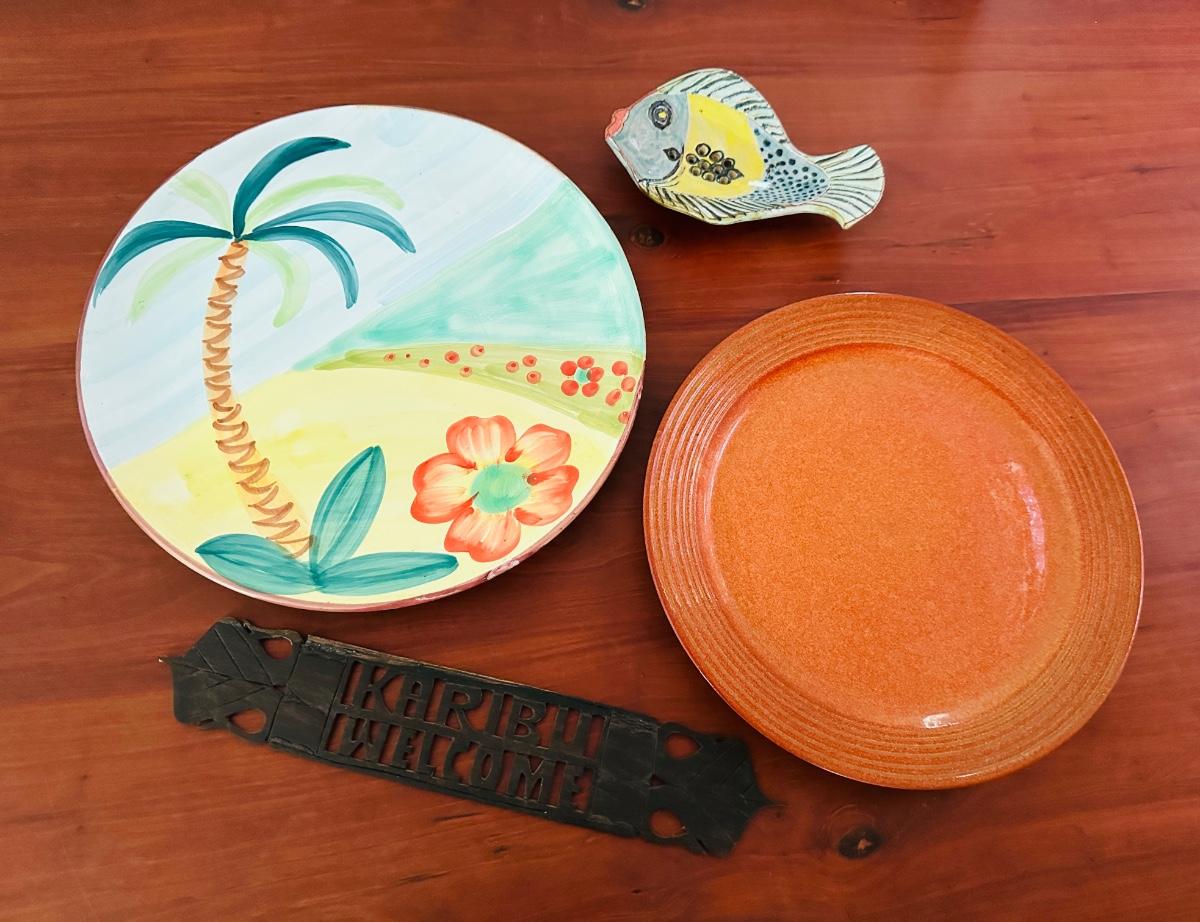 BAUER POTTERY CHOP PLATE, UNSIGNED PALM TREE PLATTER, FISH POTTERY DISH, KARIBU WELCOME SIGN