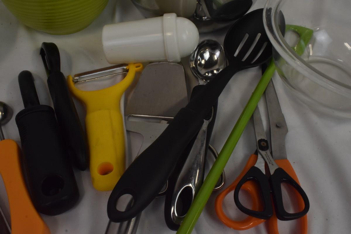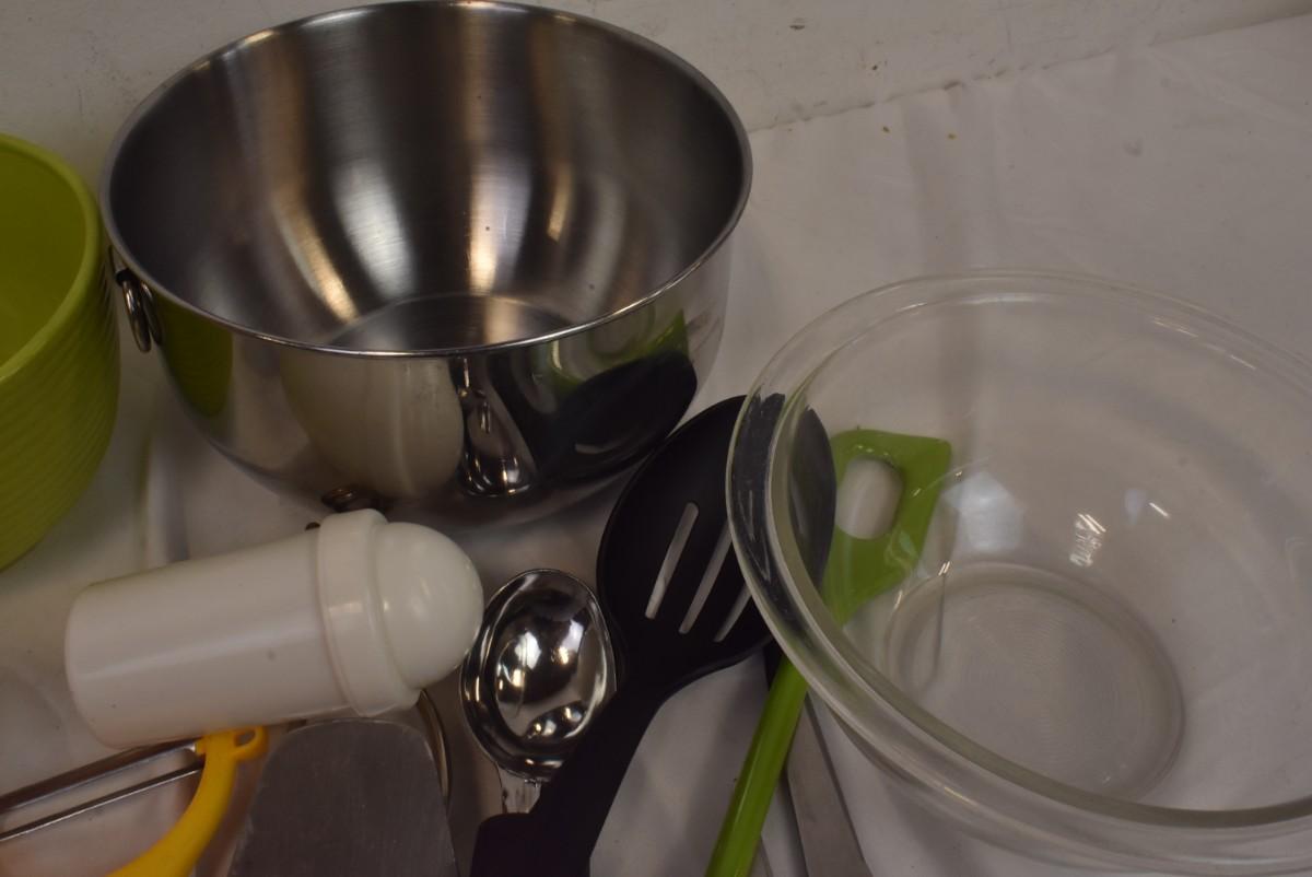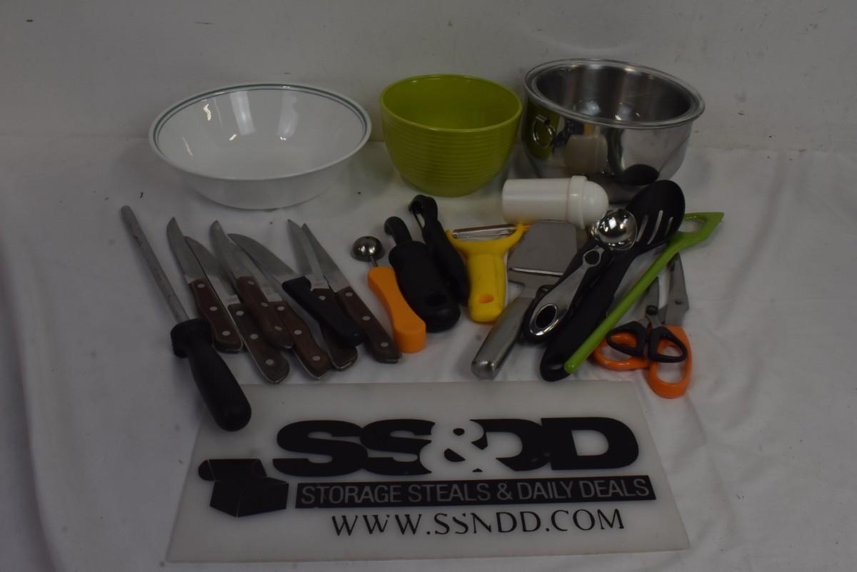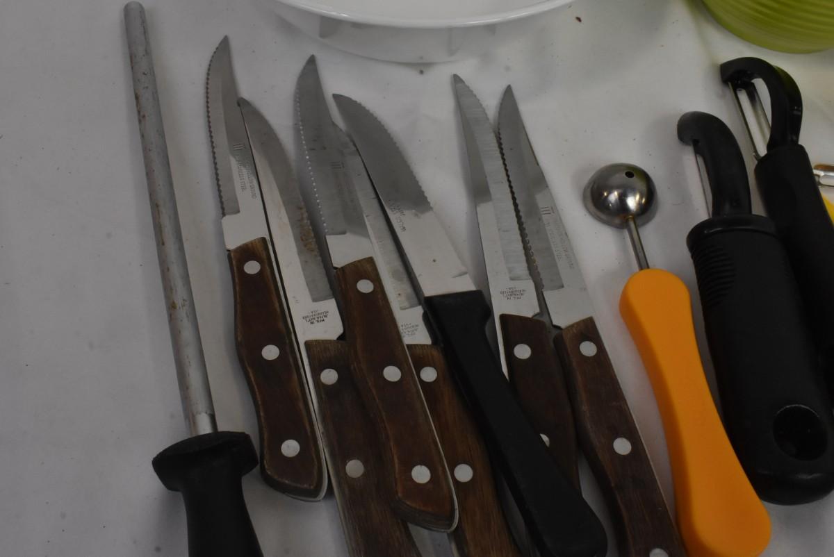 Kitchen lot: 4 bowls, knives w/steel, scissors, peelers, cheese slicer, tongs