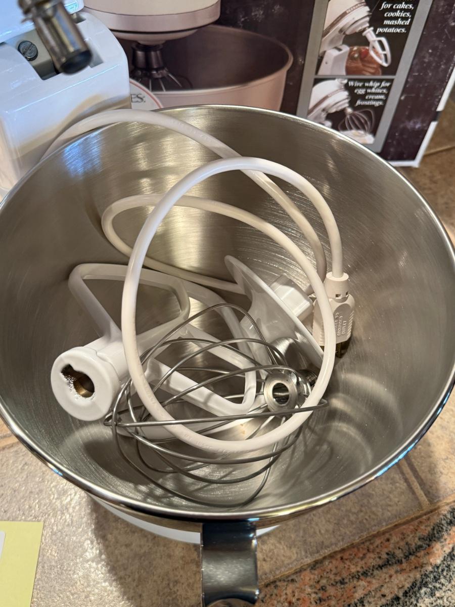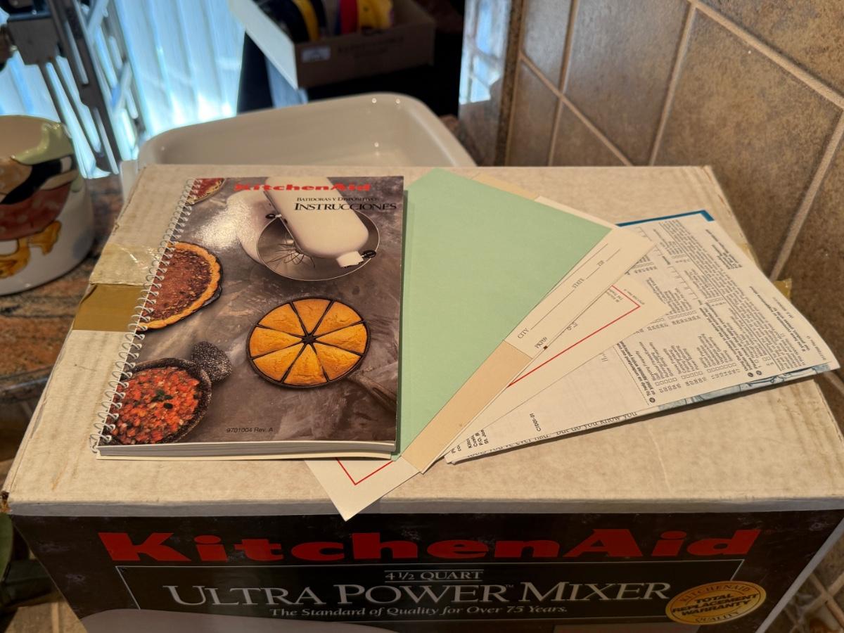 Older Kitchenaid mixer w/stainless mixing bowl & 3 attachments/box/paperwork Nice harder to find red trim