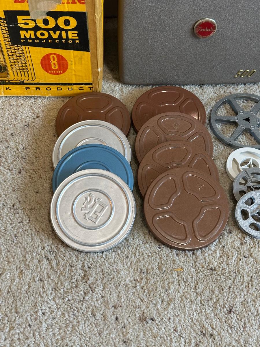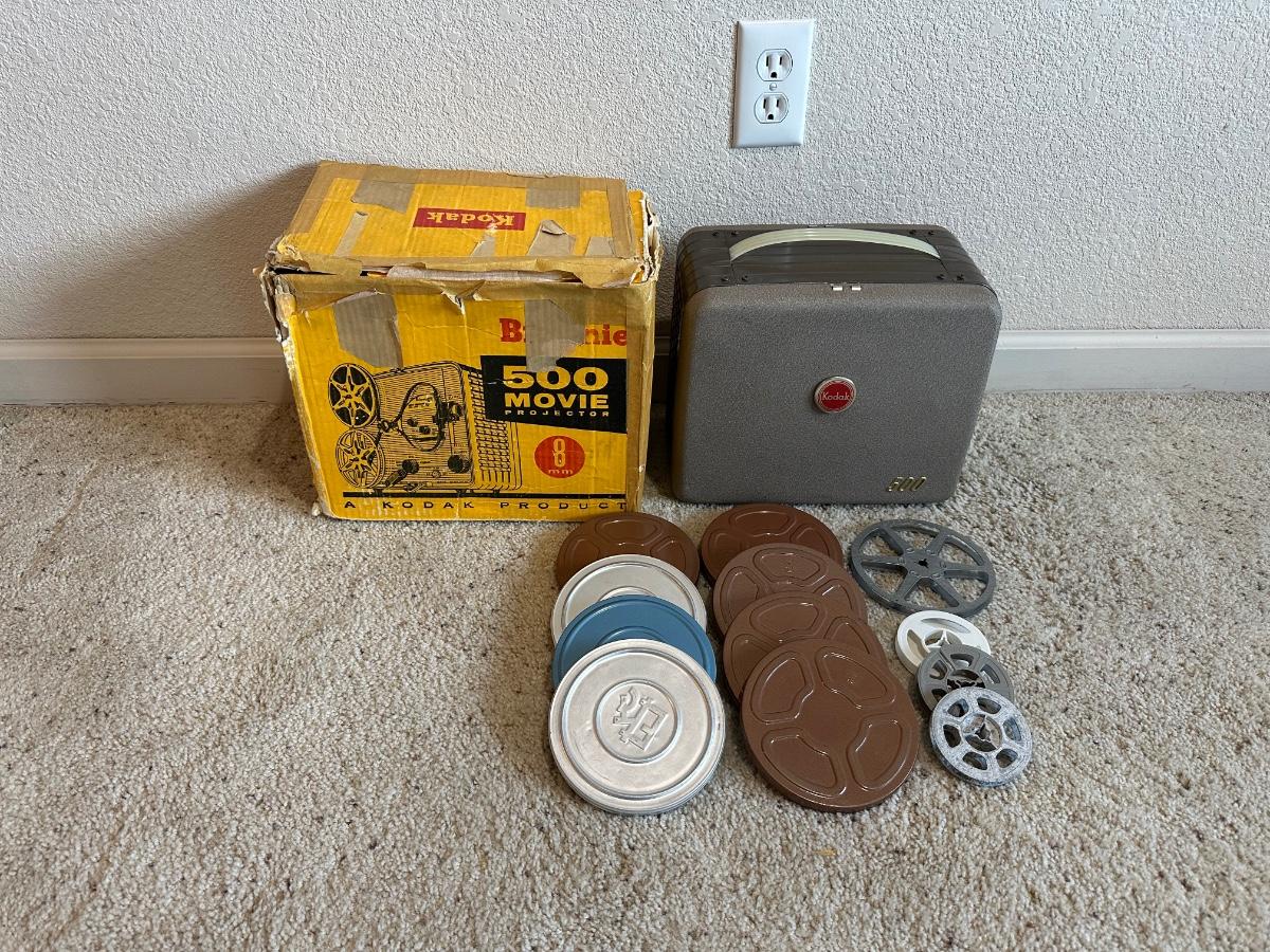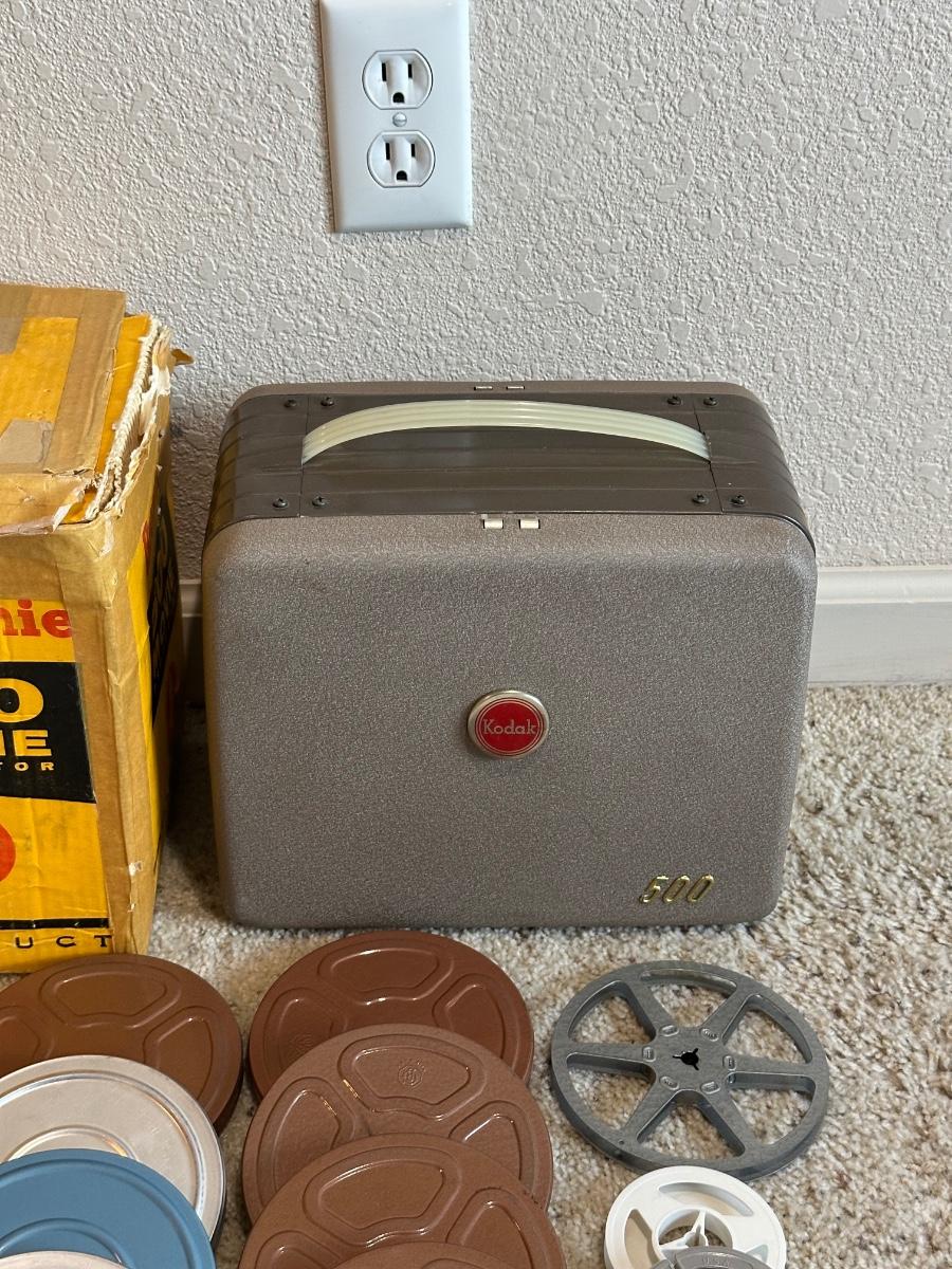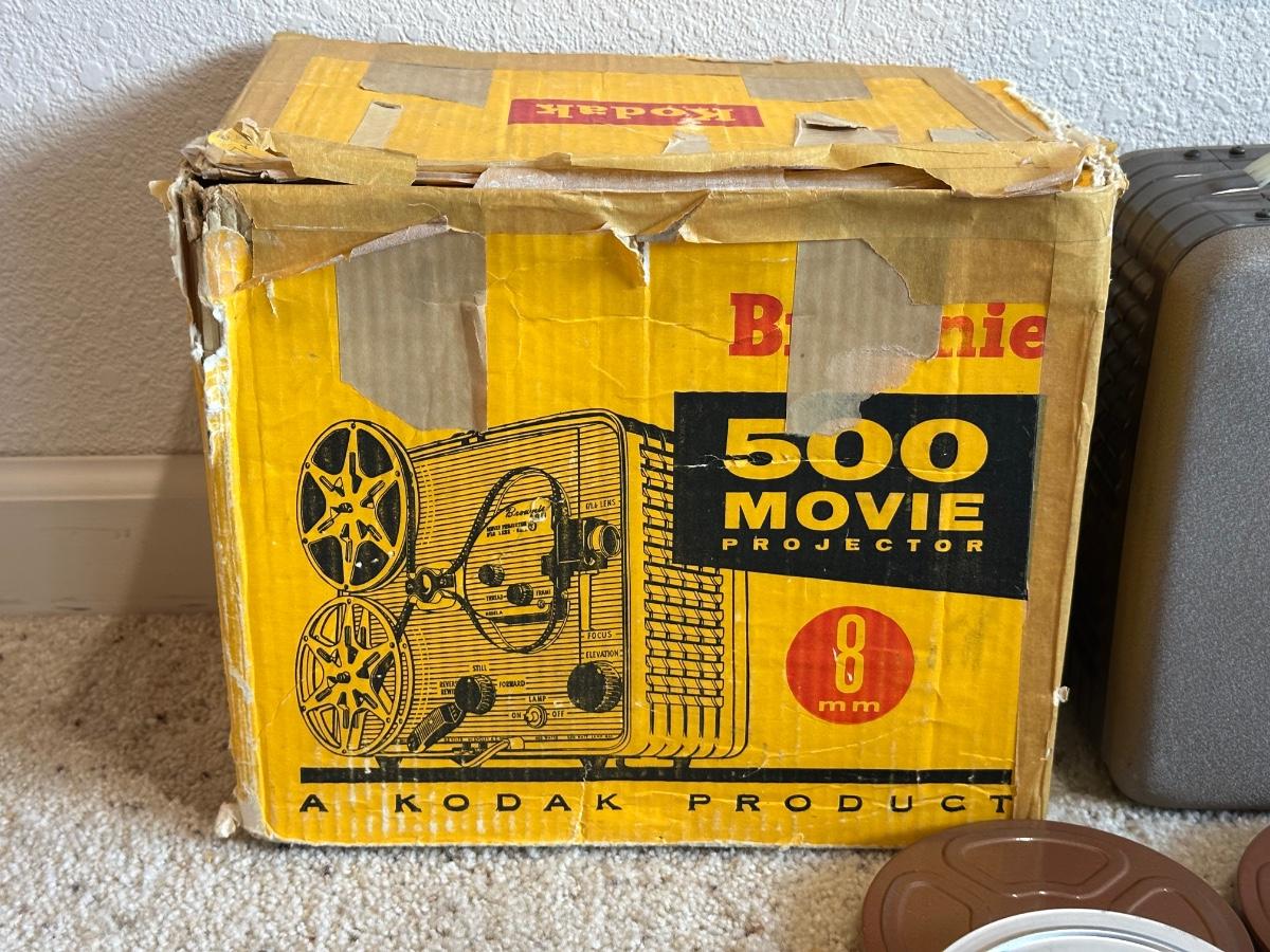 KODAK BROWNIE 500 MOVIE PROJECTOR SUPER 8 W/VARIOUS MOVIES PLUS A PROJECTOR SCREEN
