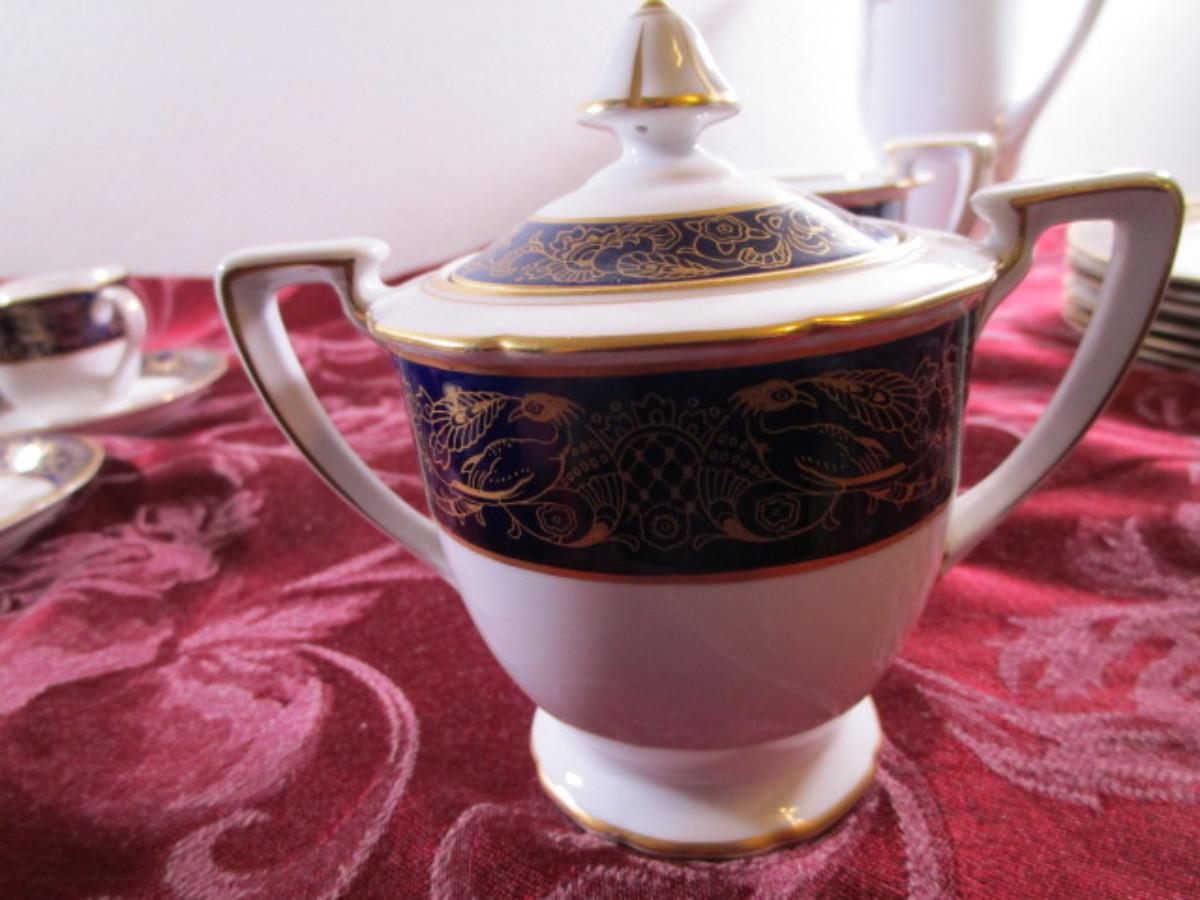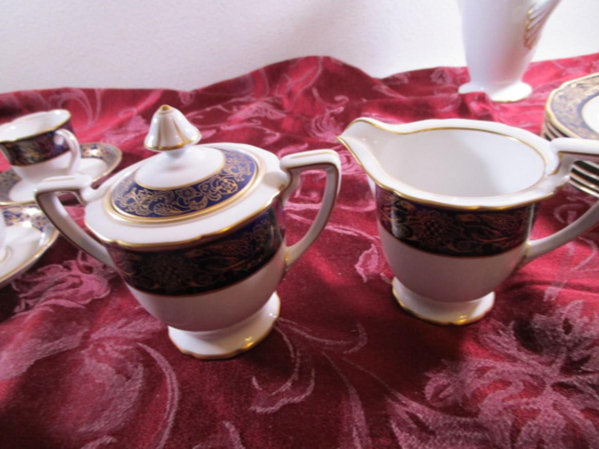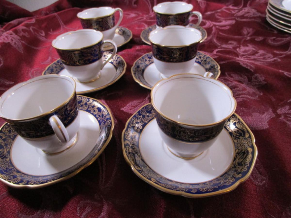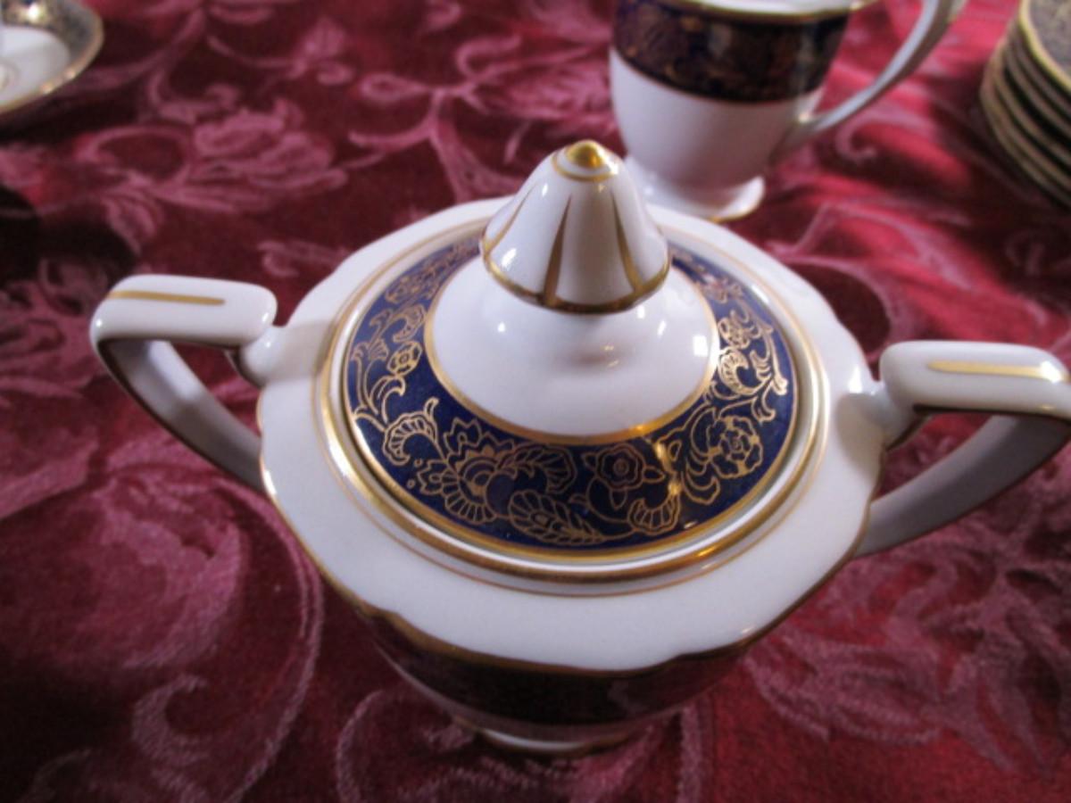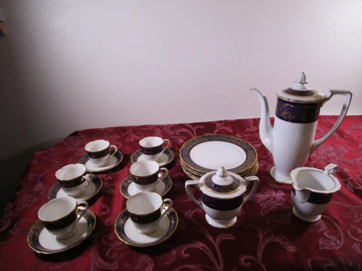 New condition, navy blue & gold, Coffee pot, sugar bowl, creamer, 6-7-1/2" diameter plates, 6-2-1/4" tall cups & 6- 4-3/4" diameter saucers, sells on-line for $300