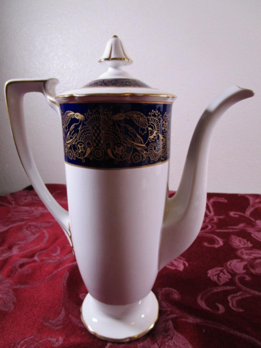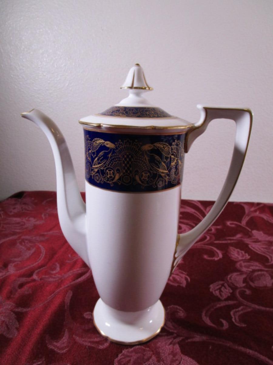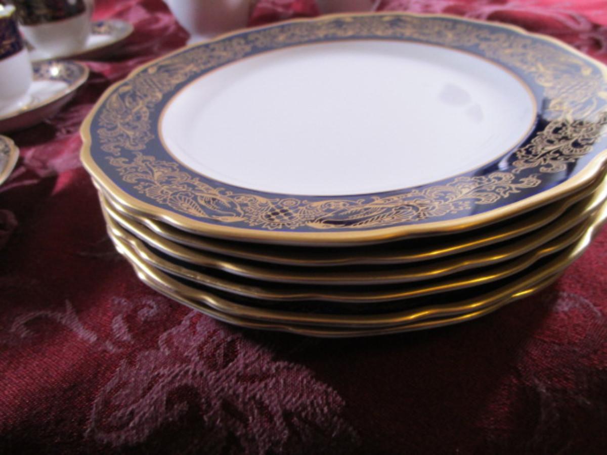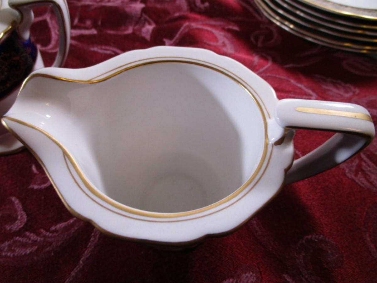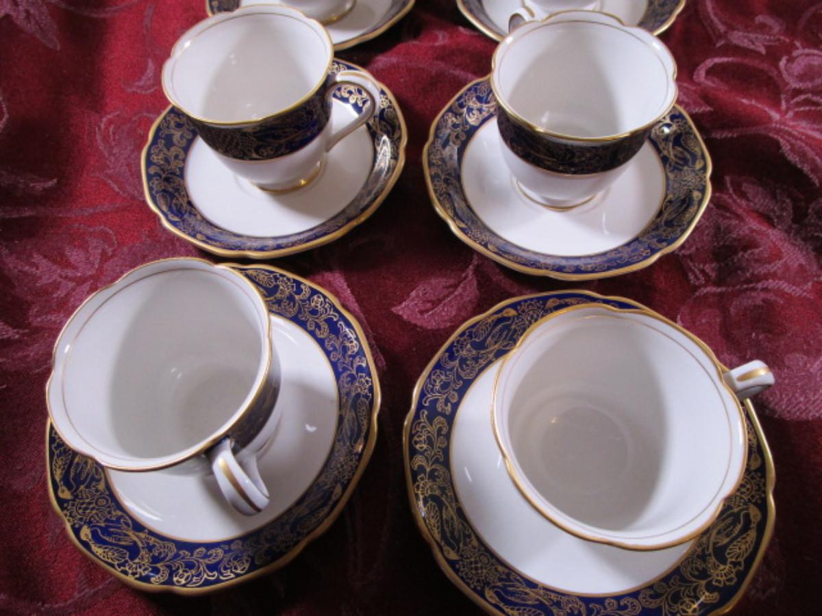 New condition, navy blue & gold, Coffee pot, sugar bowl, creamer, 6-7-1/2" diameter plates, 6-2-1/4" tall cups & 6- 4-3/4" diameter saucers, sells on-line for $300