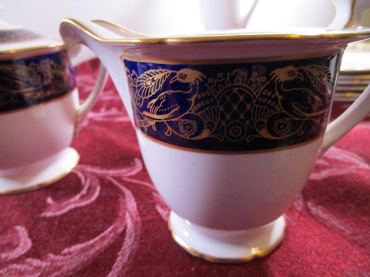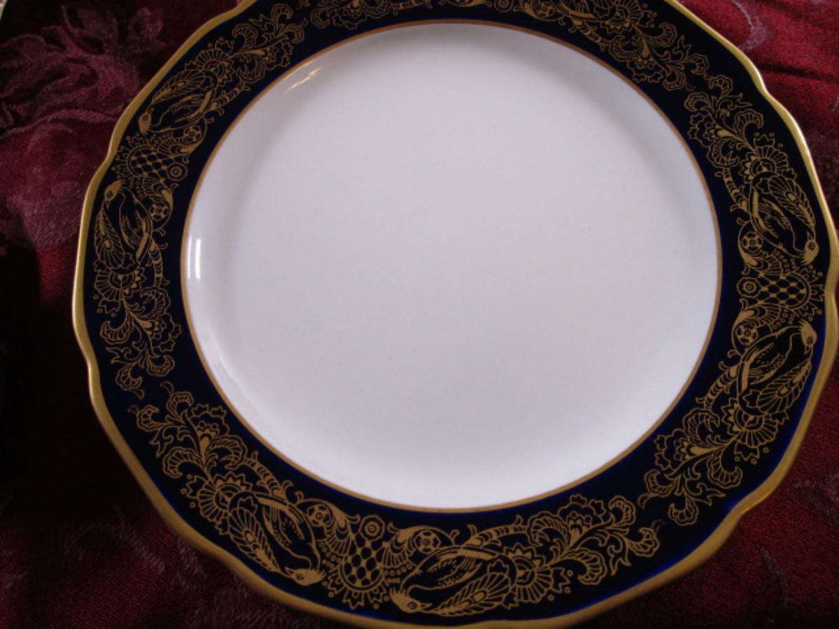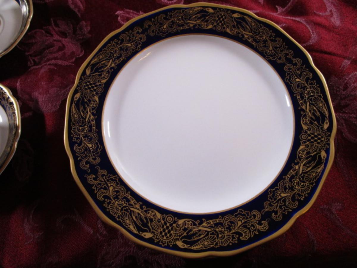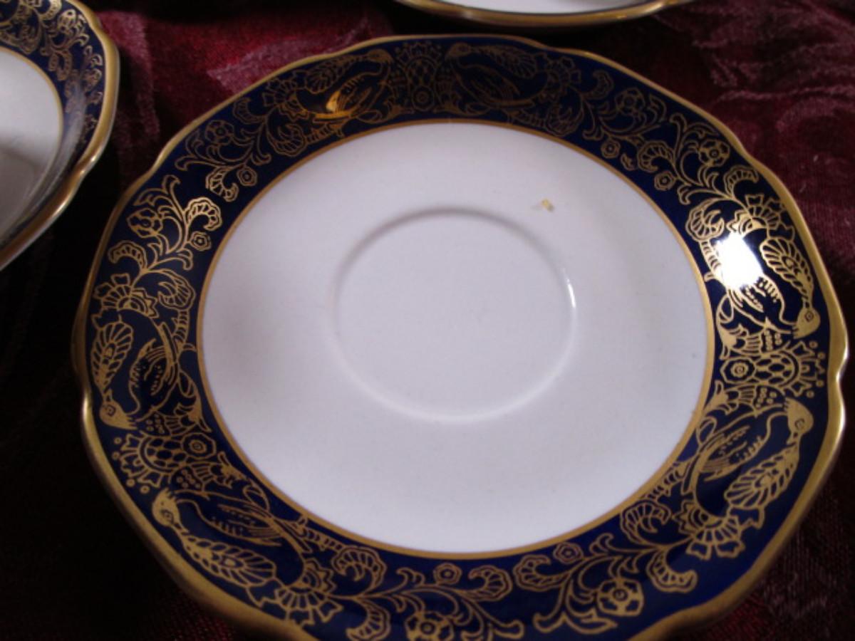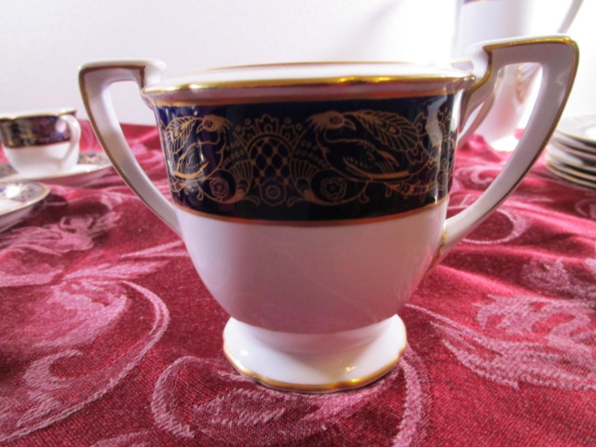 New condition, navy blue & gold, Coffee pot, sugar bowl, creamer, 6-7-1/2" diameter plates, 6-2-1/4" tall cups & 6- 4-3/4" diameter saucers, sells on-line for $300