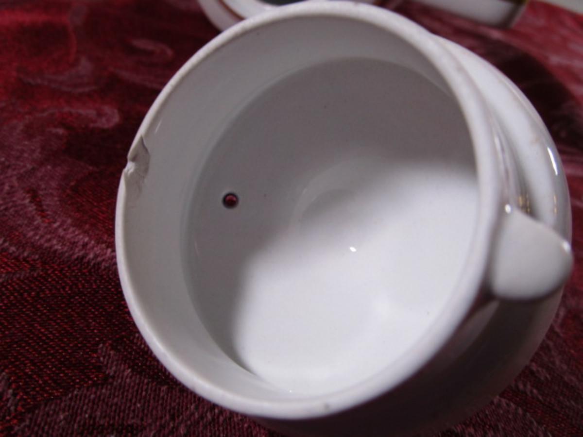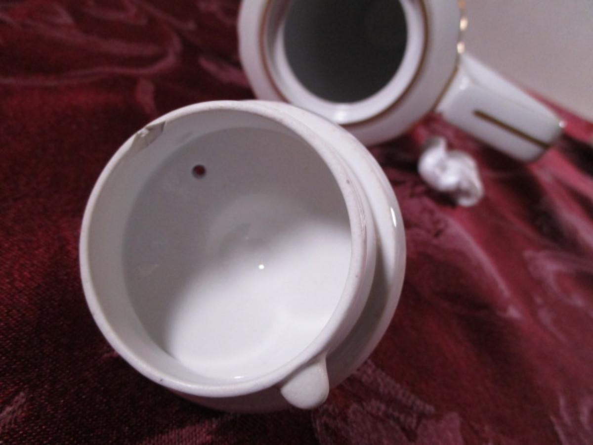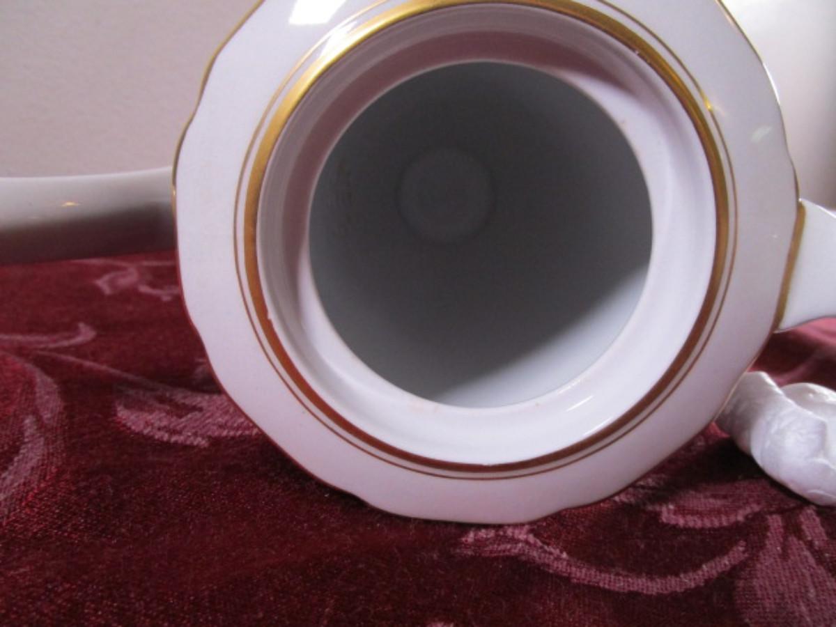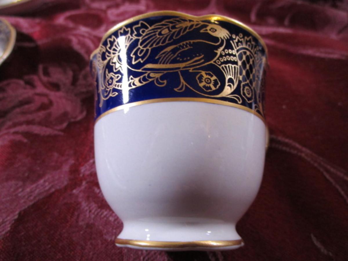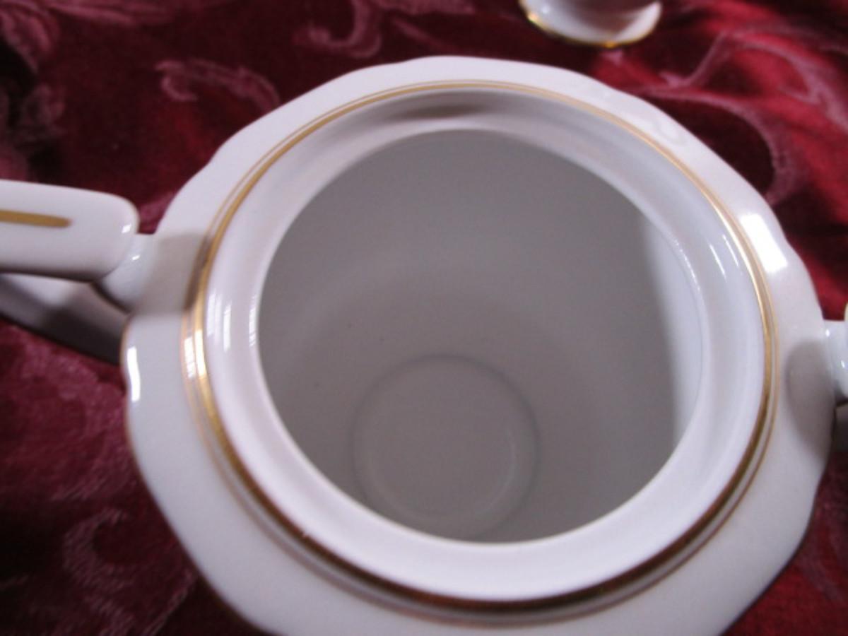 New condition, navy blue & gold, Coffee pot, sugar bowl, creamer, 6-7-1/2" diameter plates, 6-2-1/4" tall cups & 6- 4-3/4" diameter saucers, sells on-line for $300