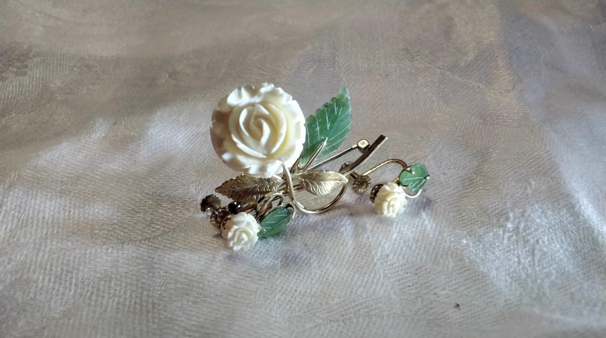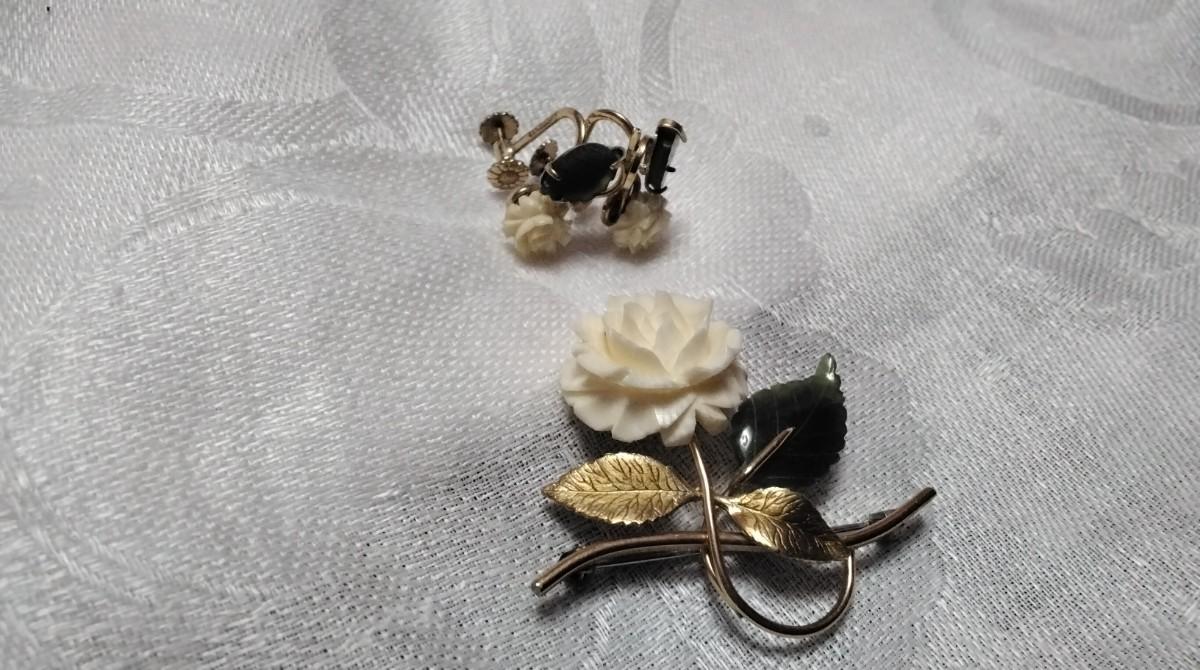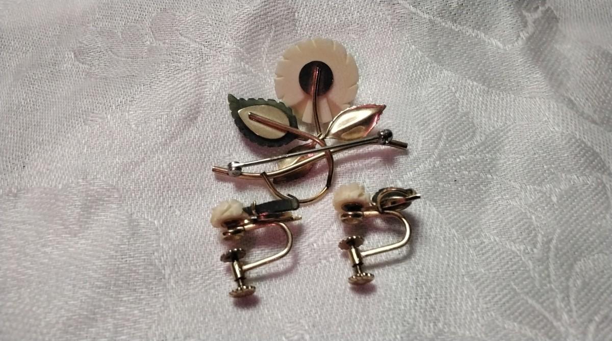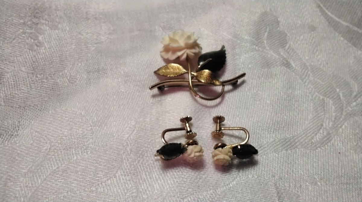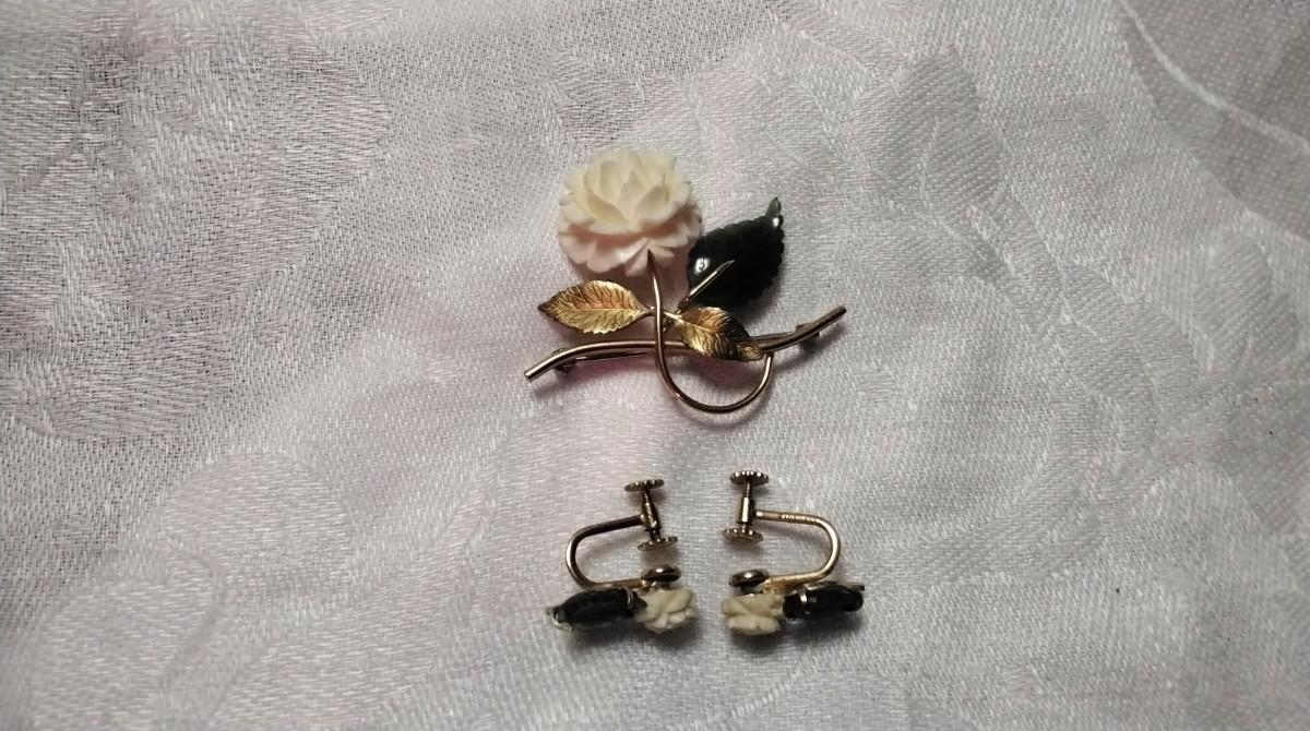 Krementz & Co is one of the oldest and largest manufacturers of luxury jewelry in the United States, dating back to 1866. The firm is known for its high-quality pieces and pure refinement. Gorgeous vintage set with the roses being faux ivory which is celluloid.