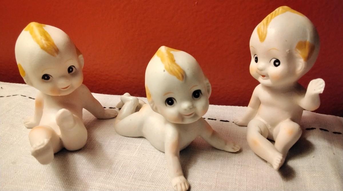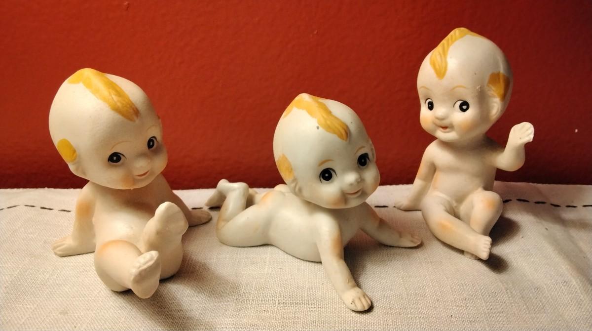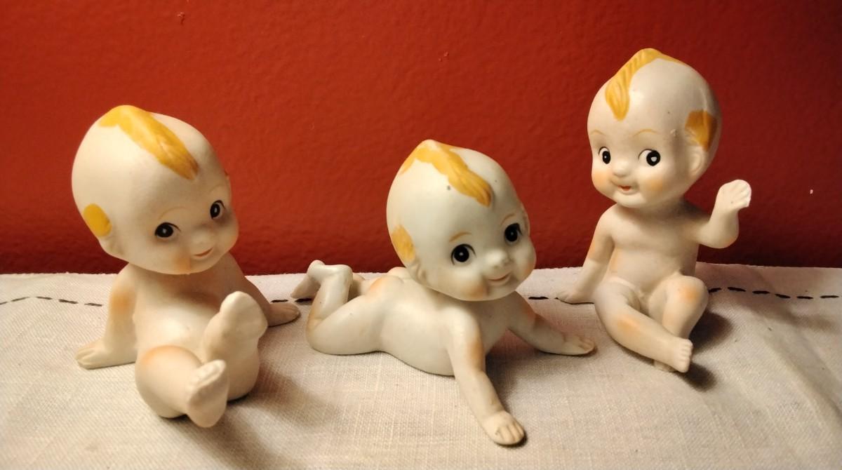 Three adorable Kewpie Porcelain Babies in showcase condition.. Made in Korea Approximately 3" tall