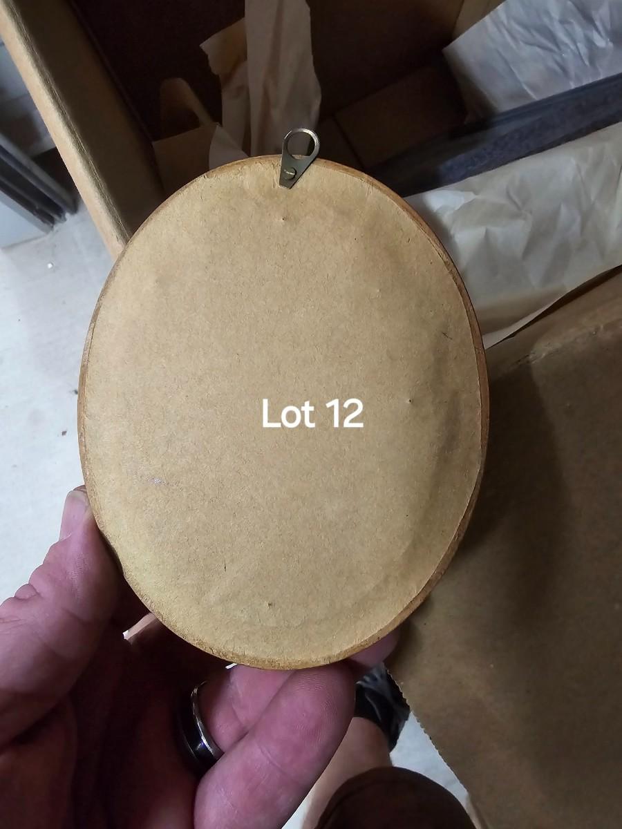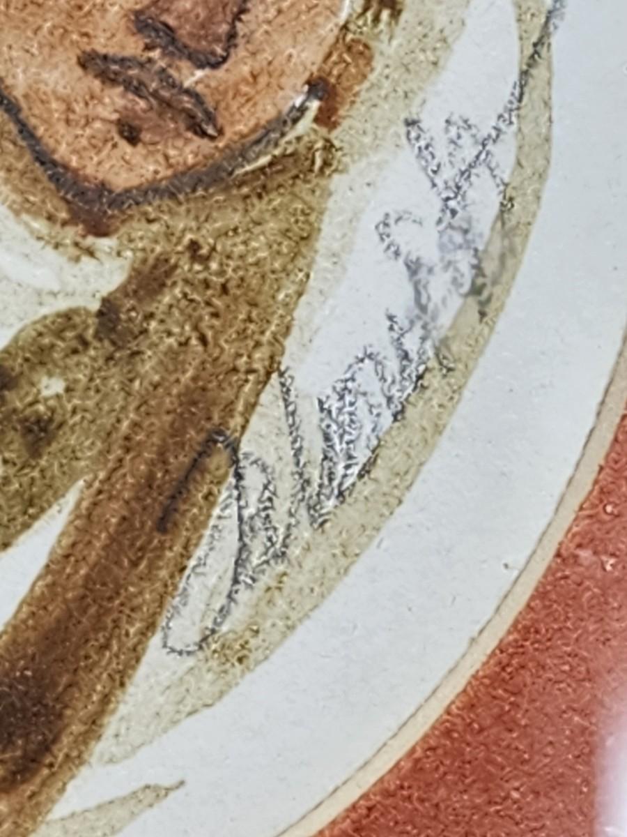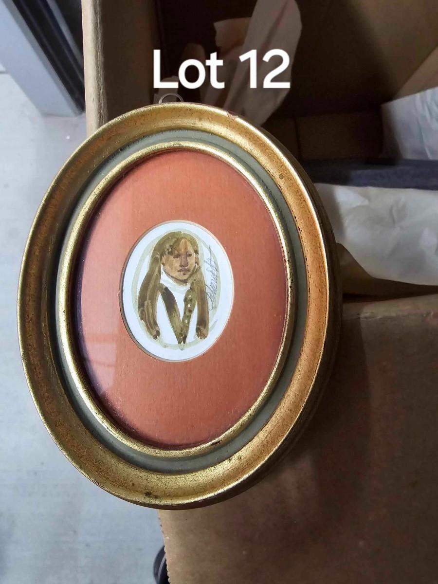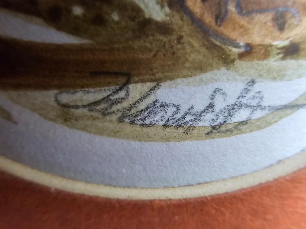We have been unable at this posting to identify the artist. The piece is 5.5 inches in frame and 1.5 inches in art and weighs 1 lb. The matte is burnt orange color.