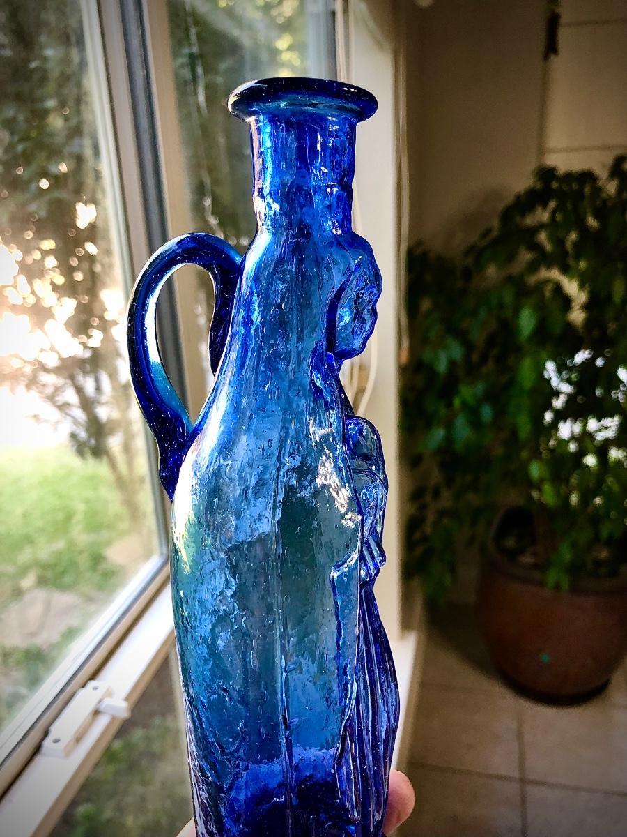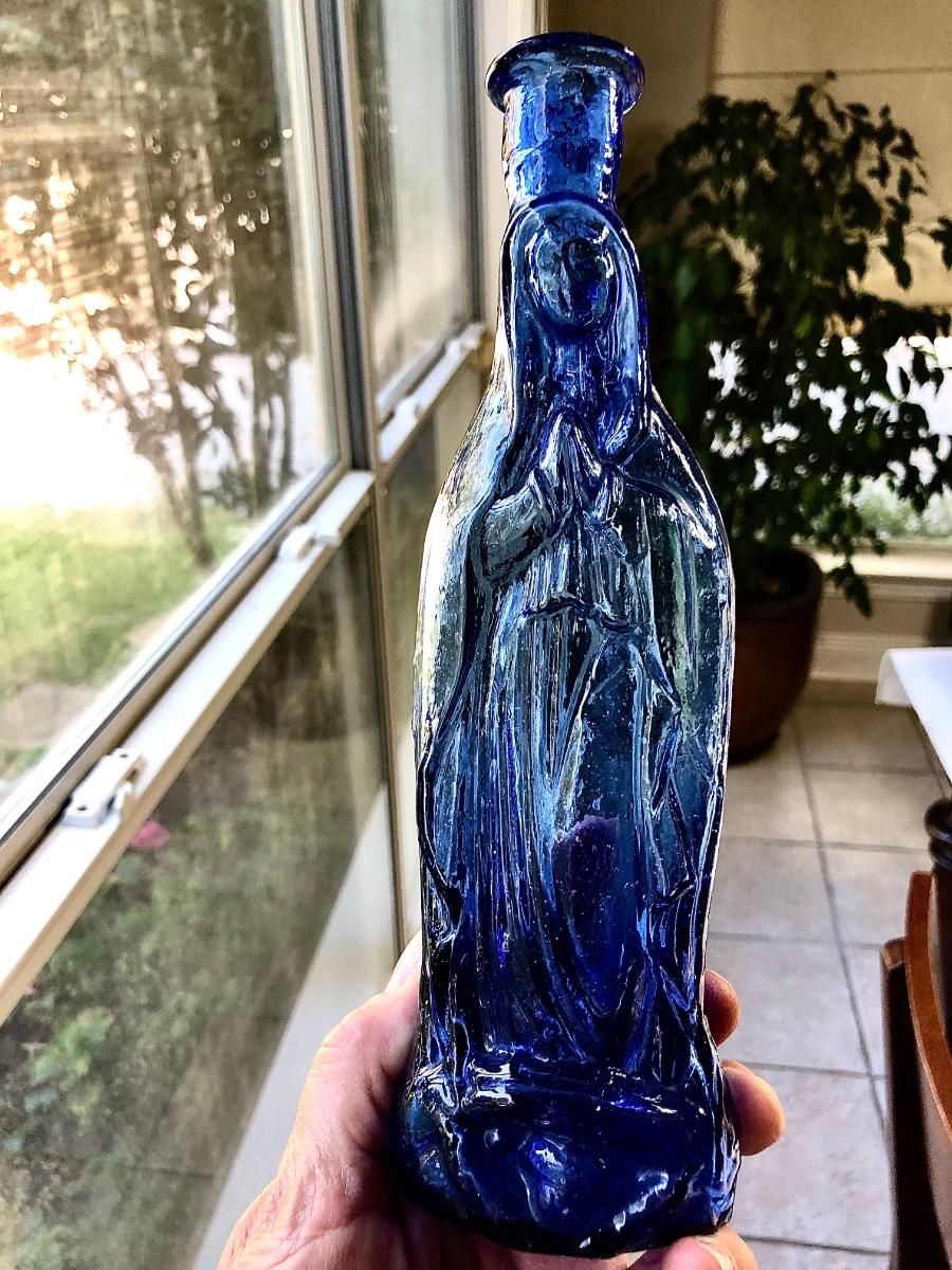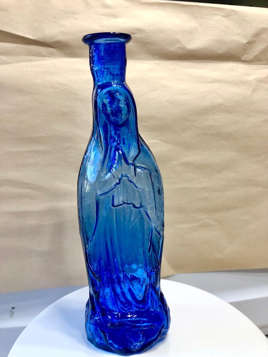 Lady of Guadalupe Mexican blown and molded cobalt blue glass statue holy water decanter-no stopper. 9 in tall 2.5 wide.