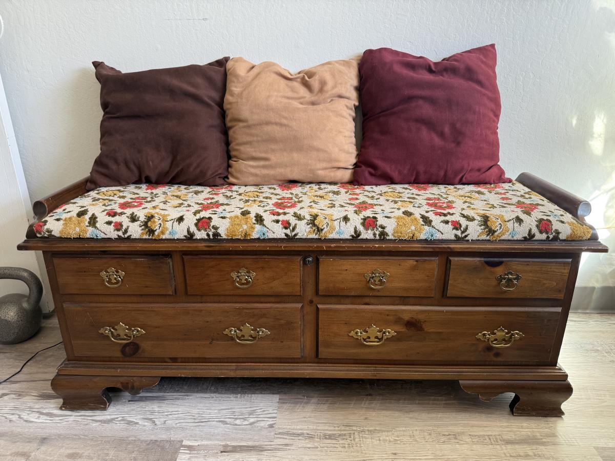 Vintage Lane wooden bench with floral cushioned seat, three throw pillows, and multiple drawers for storage.