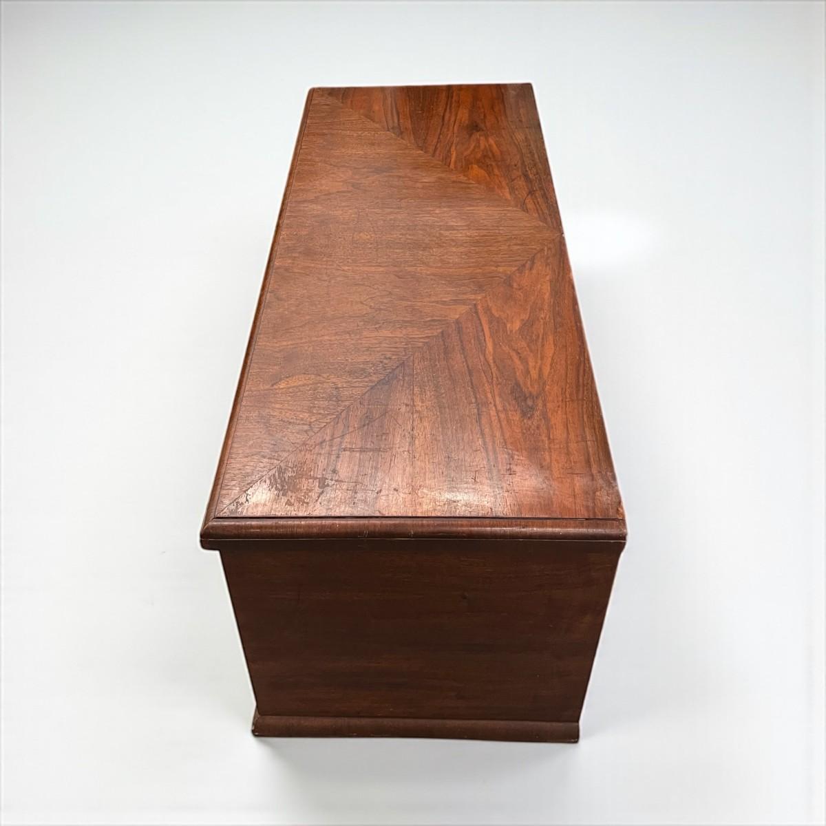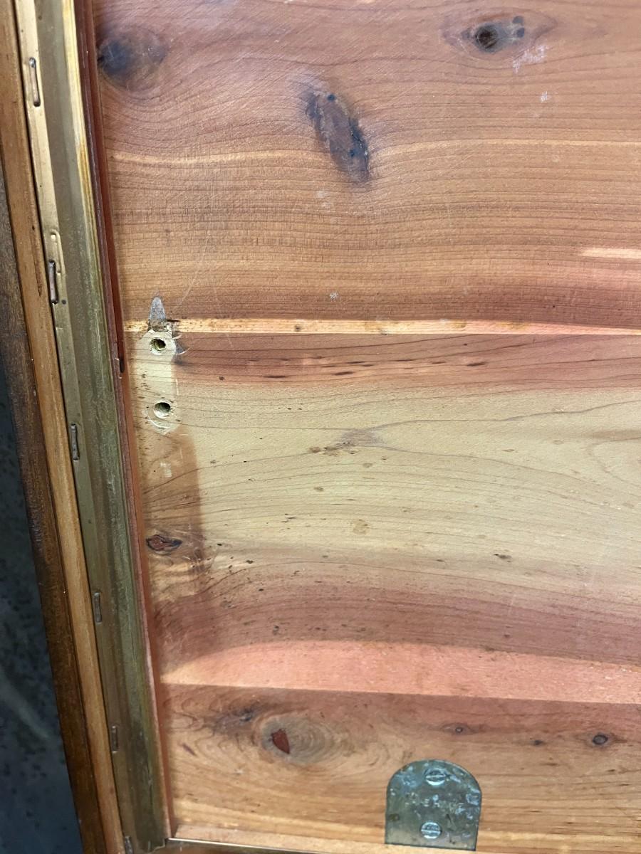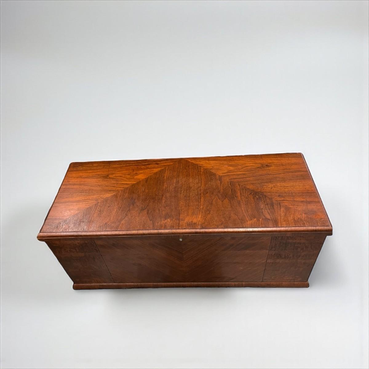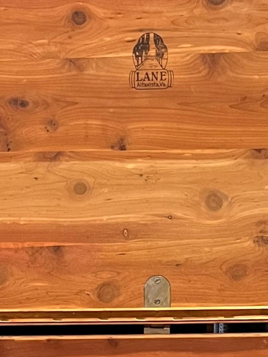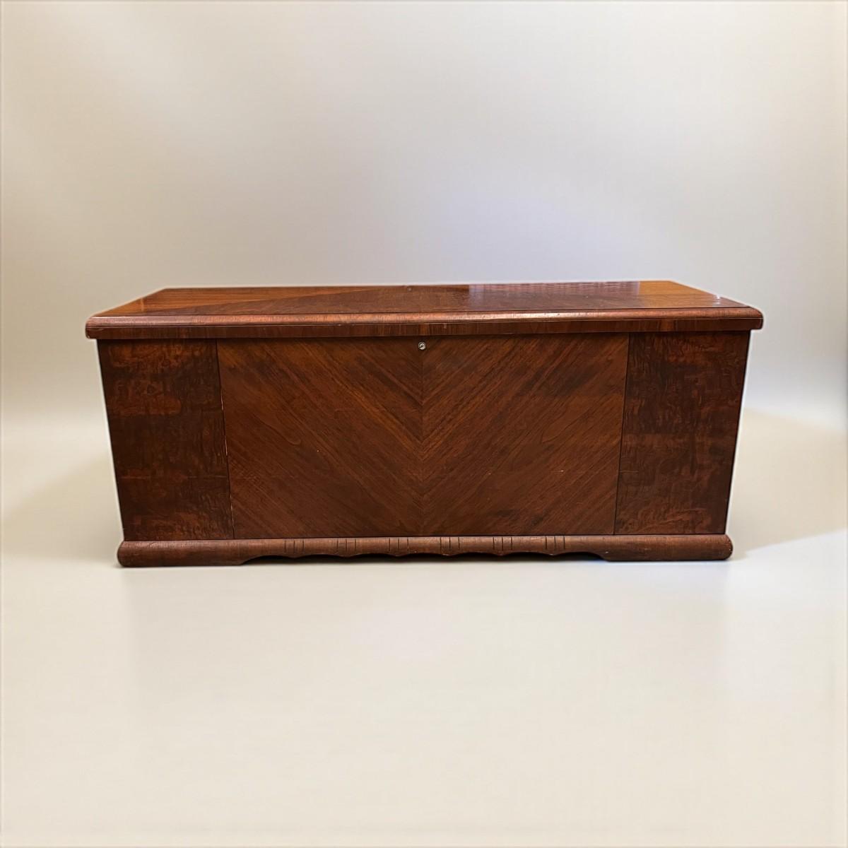Art Deco Waterfall Design cedar lined blanket chest. Lane Cedar Chest. Chest has some wear on the top. Original key is still stapled to the bottom of the chest. The brackets that hold the lid open are missing.