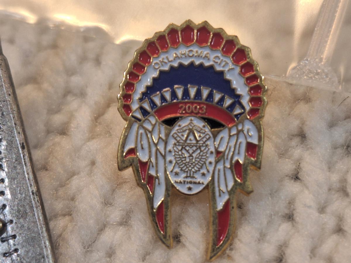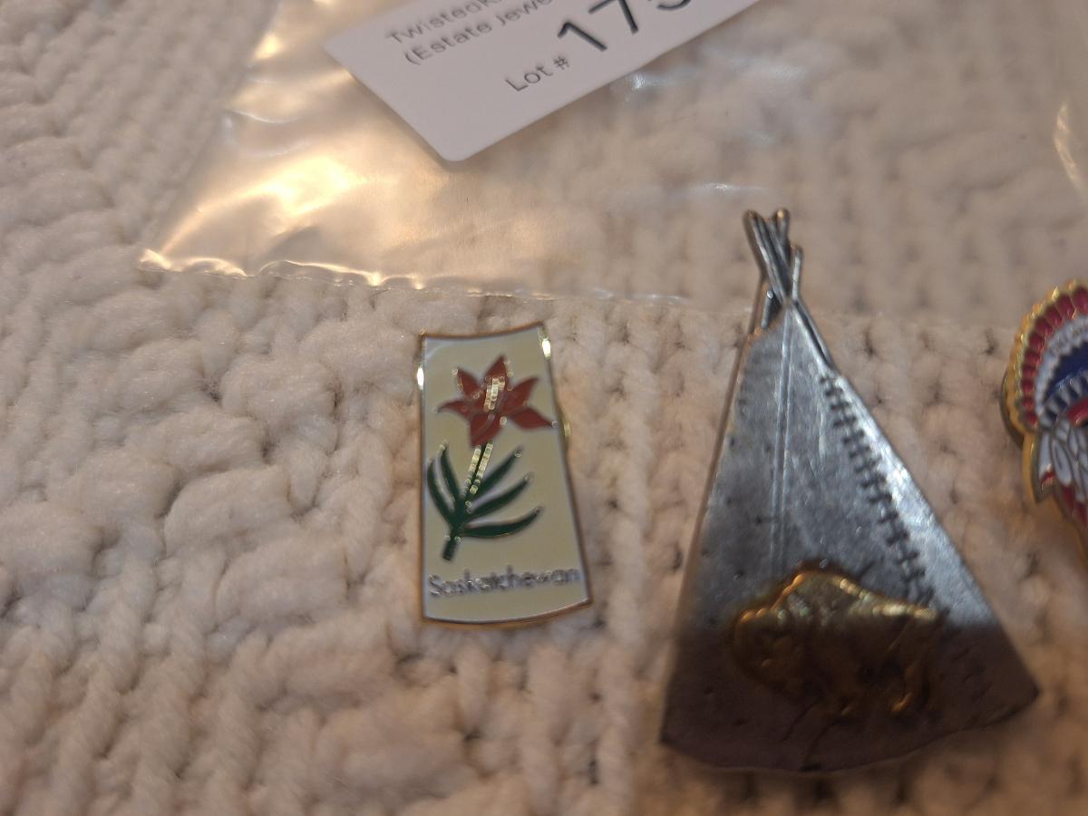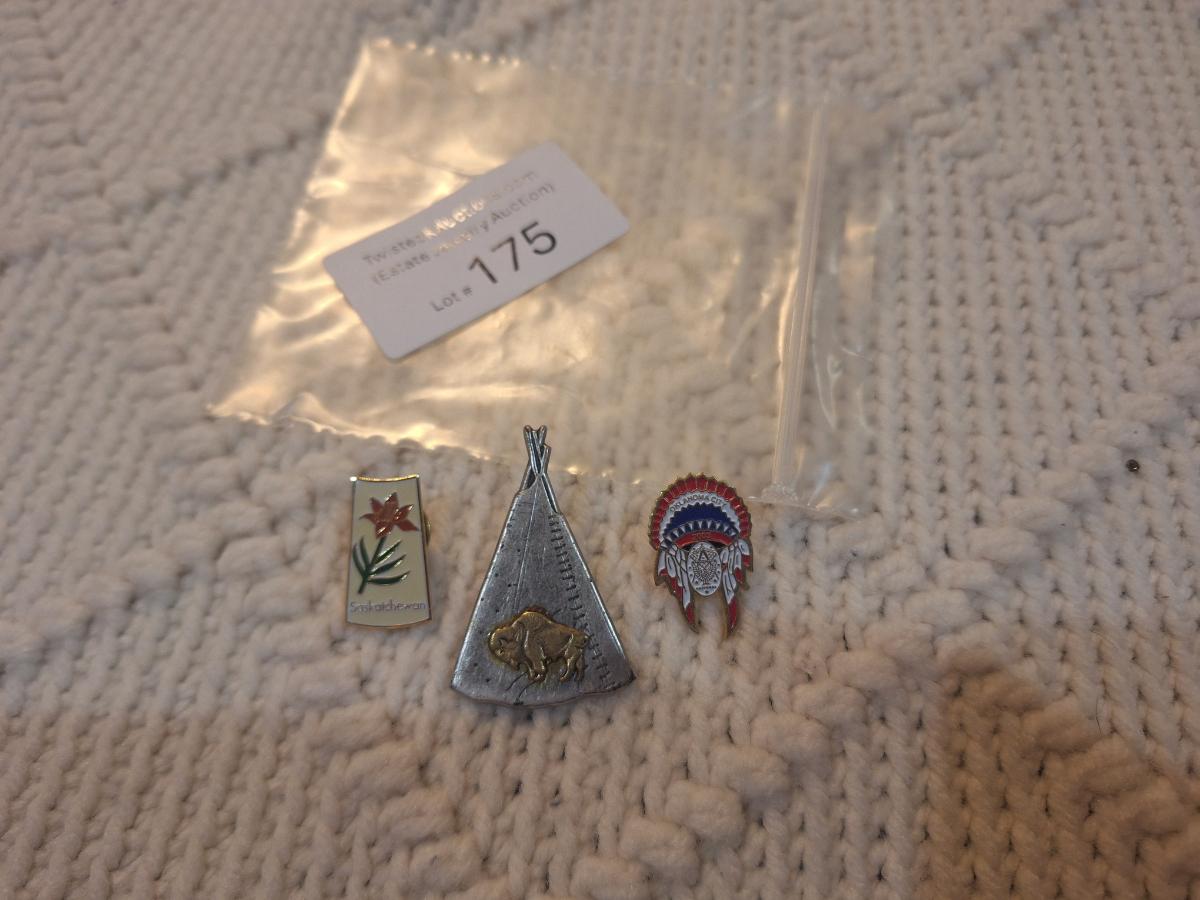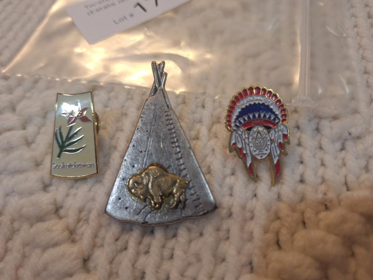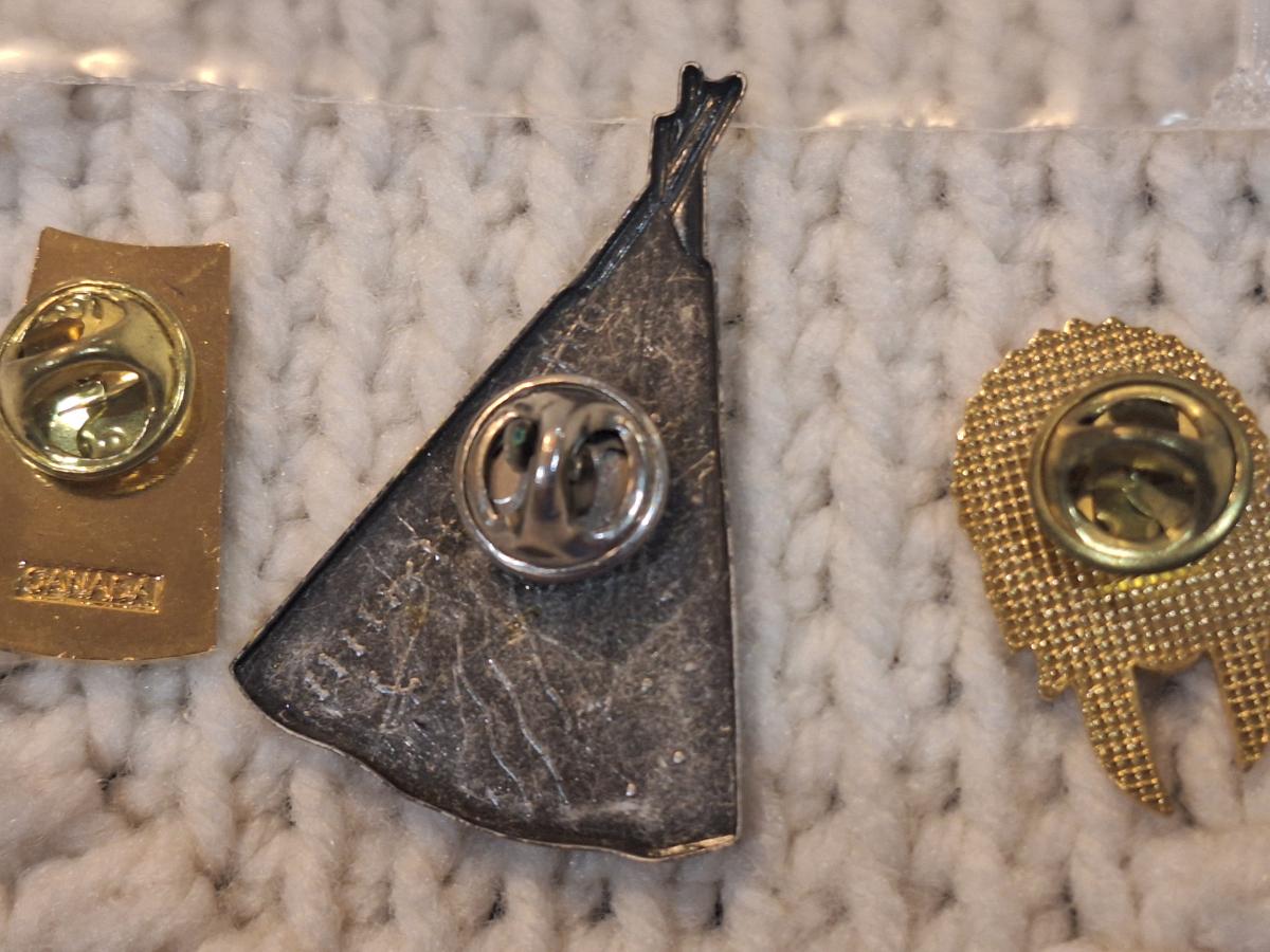 lapel pins, native head dress, teepee and flower