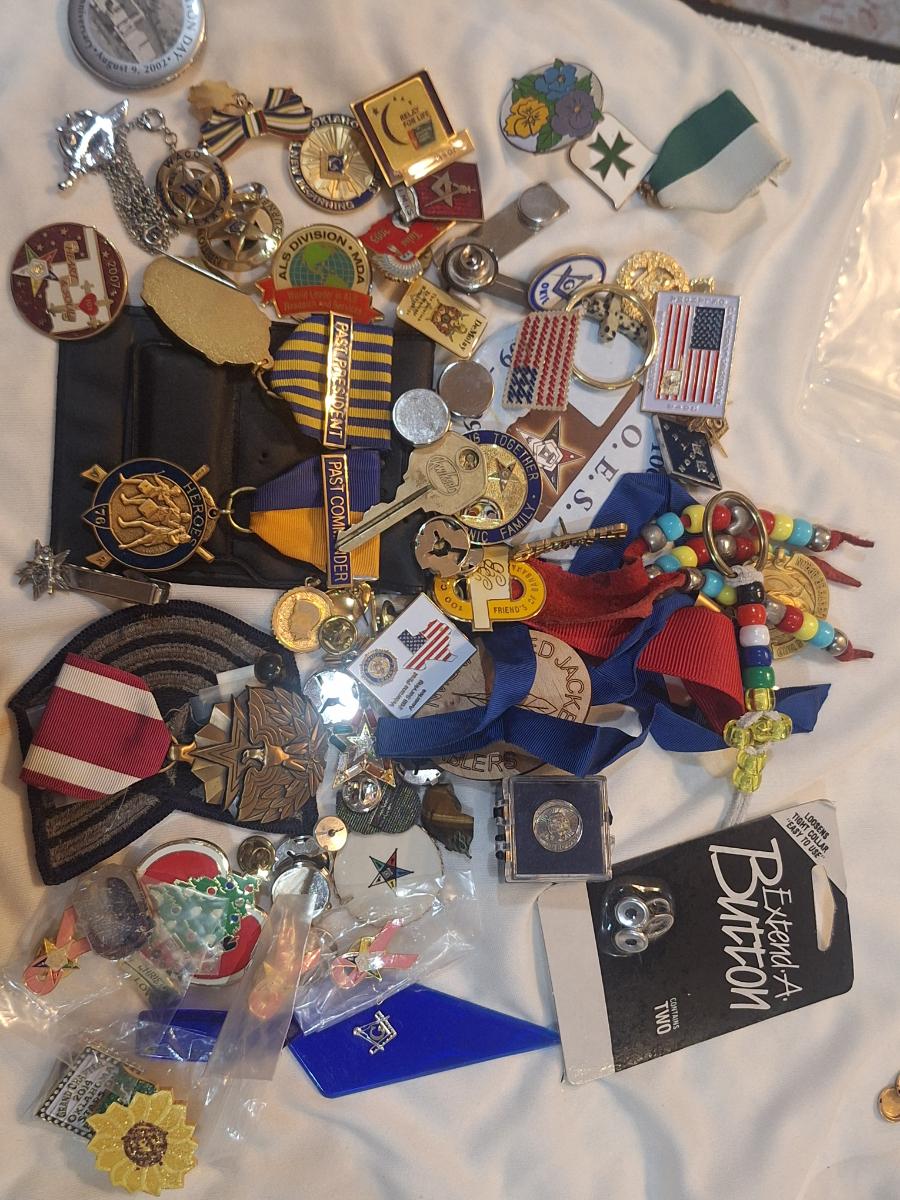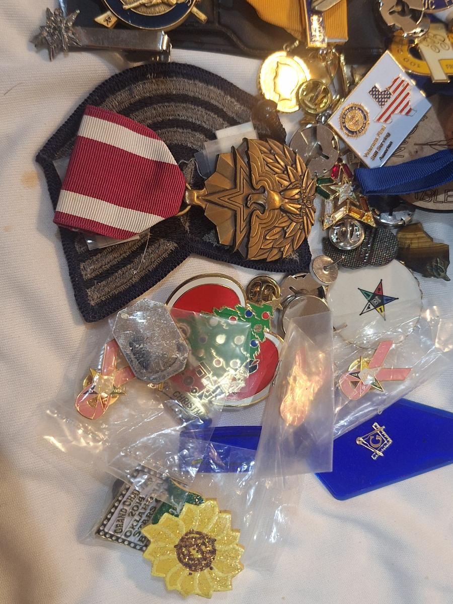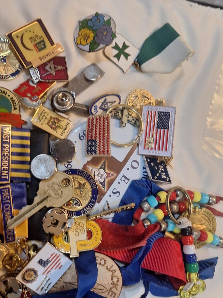 large bundle of free mason pins, medals and other items.