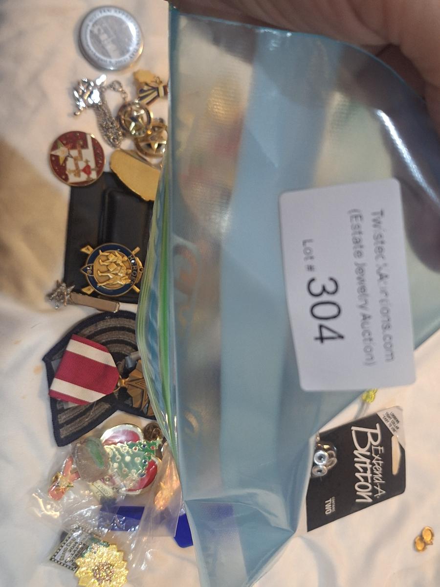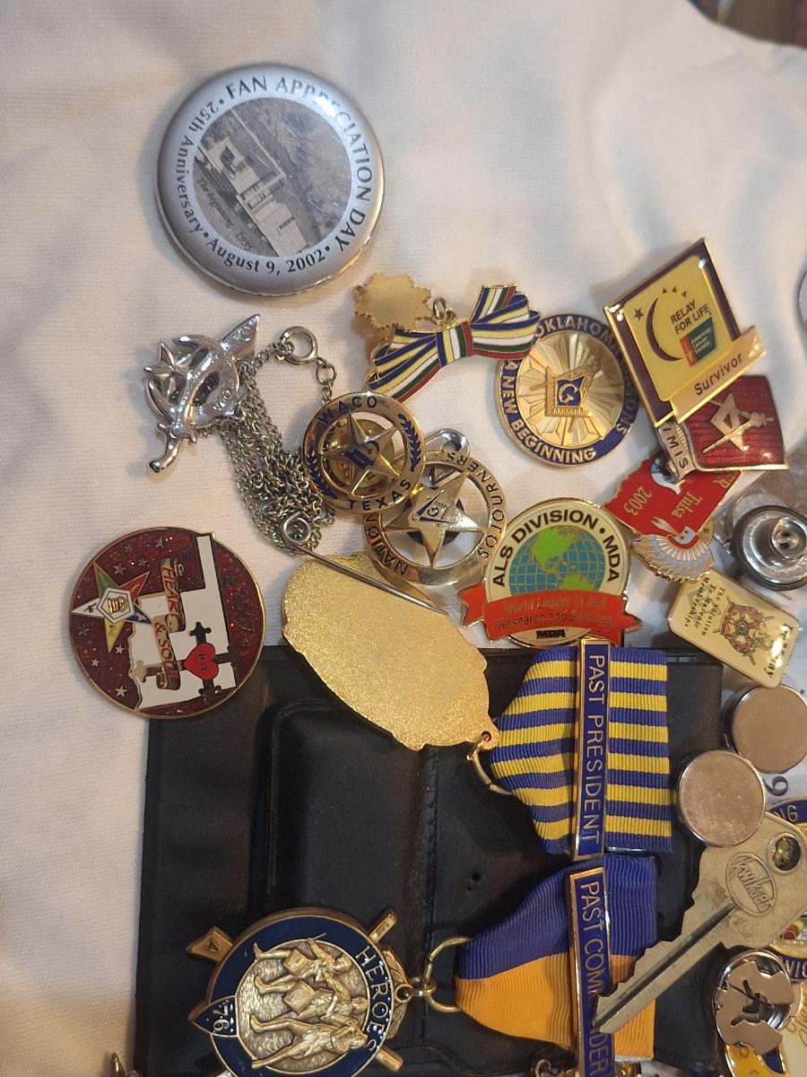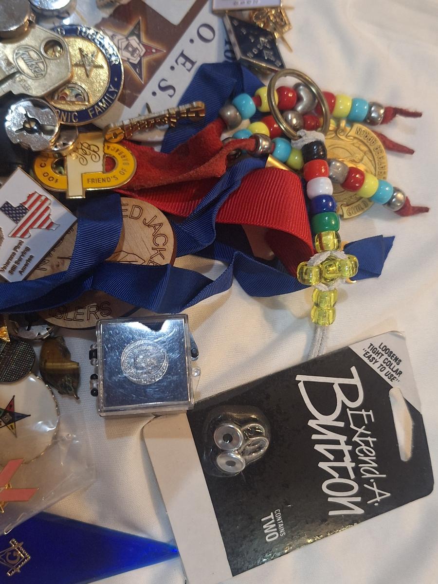 large bundle of free mason pins, medals and other items.