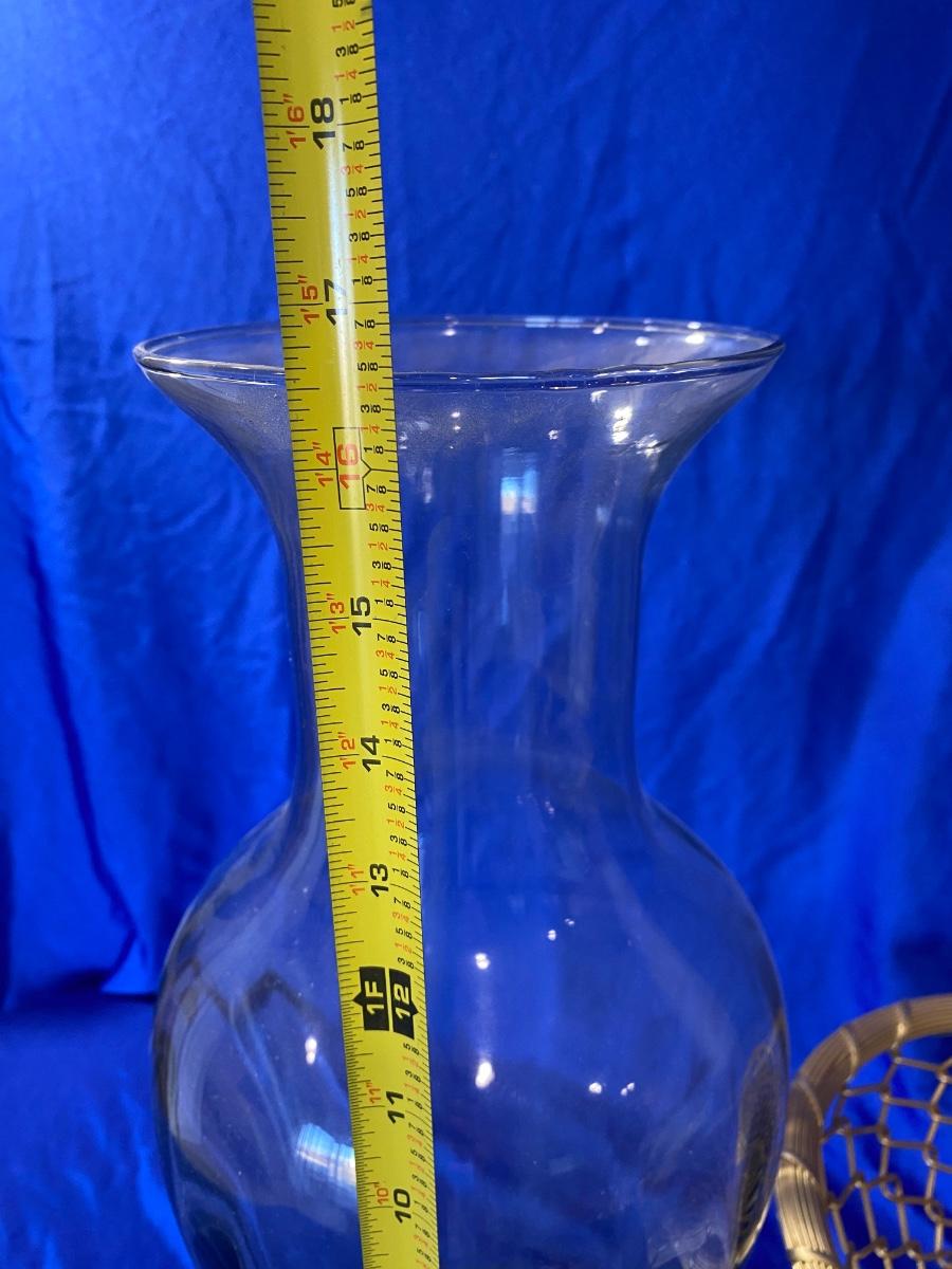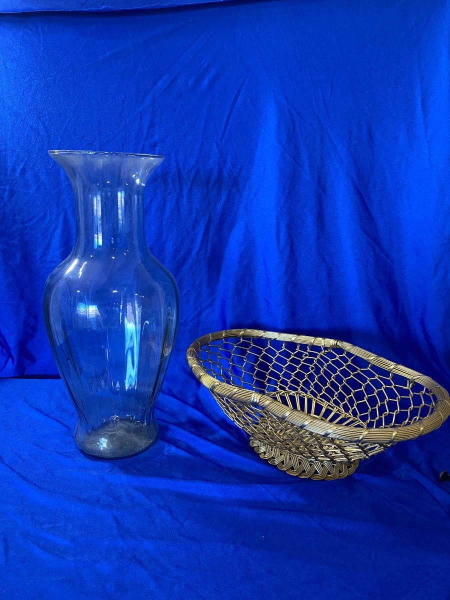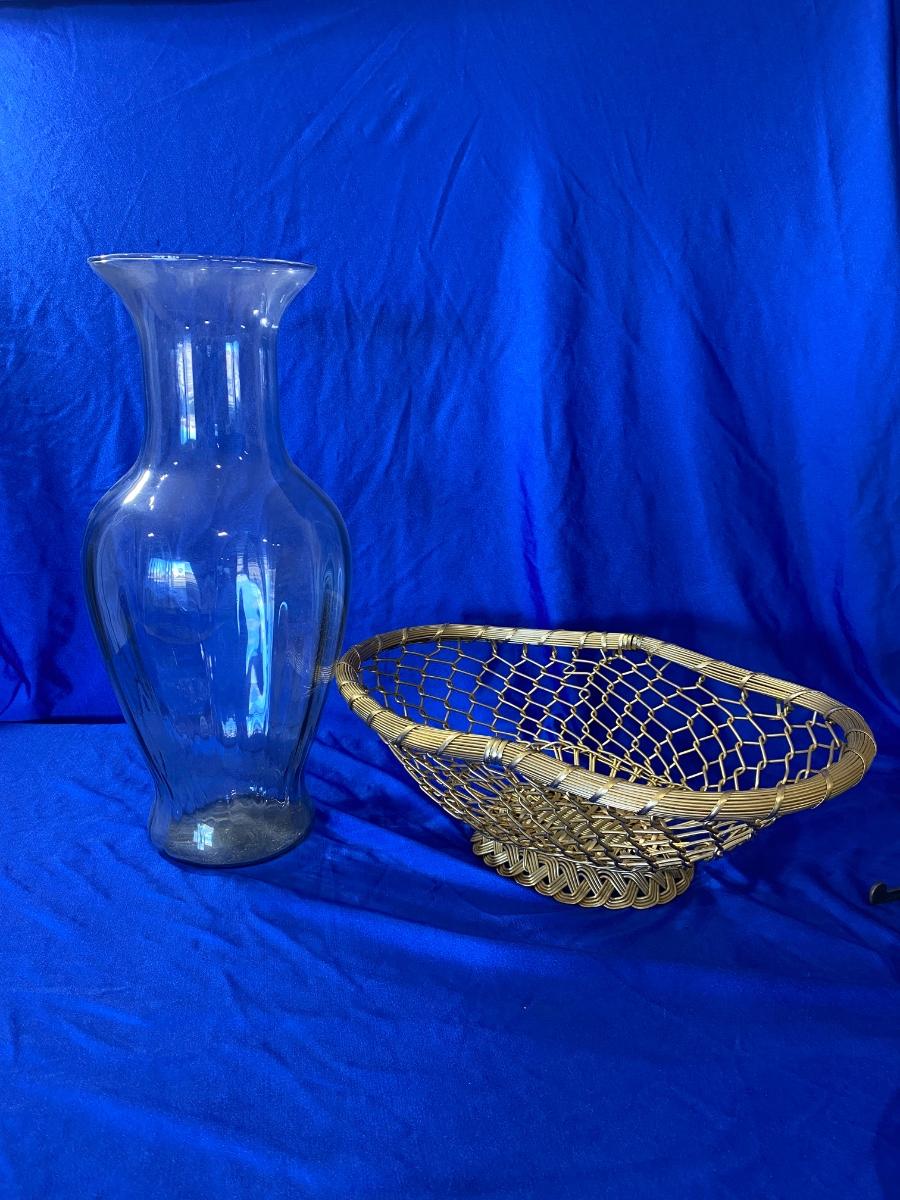 LARGE CLEAR VASE AND WEAVED WIRE BASKET