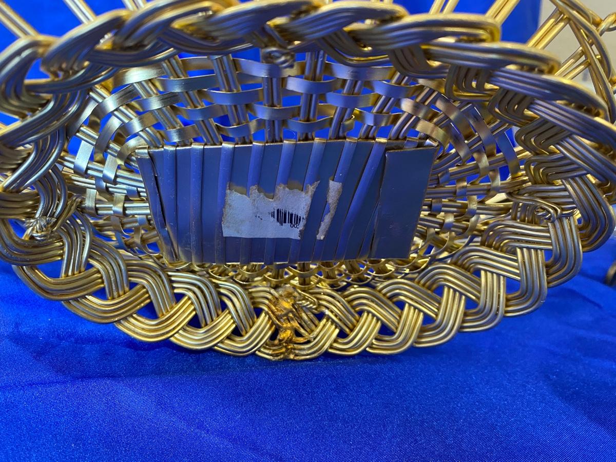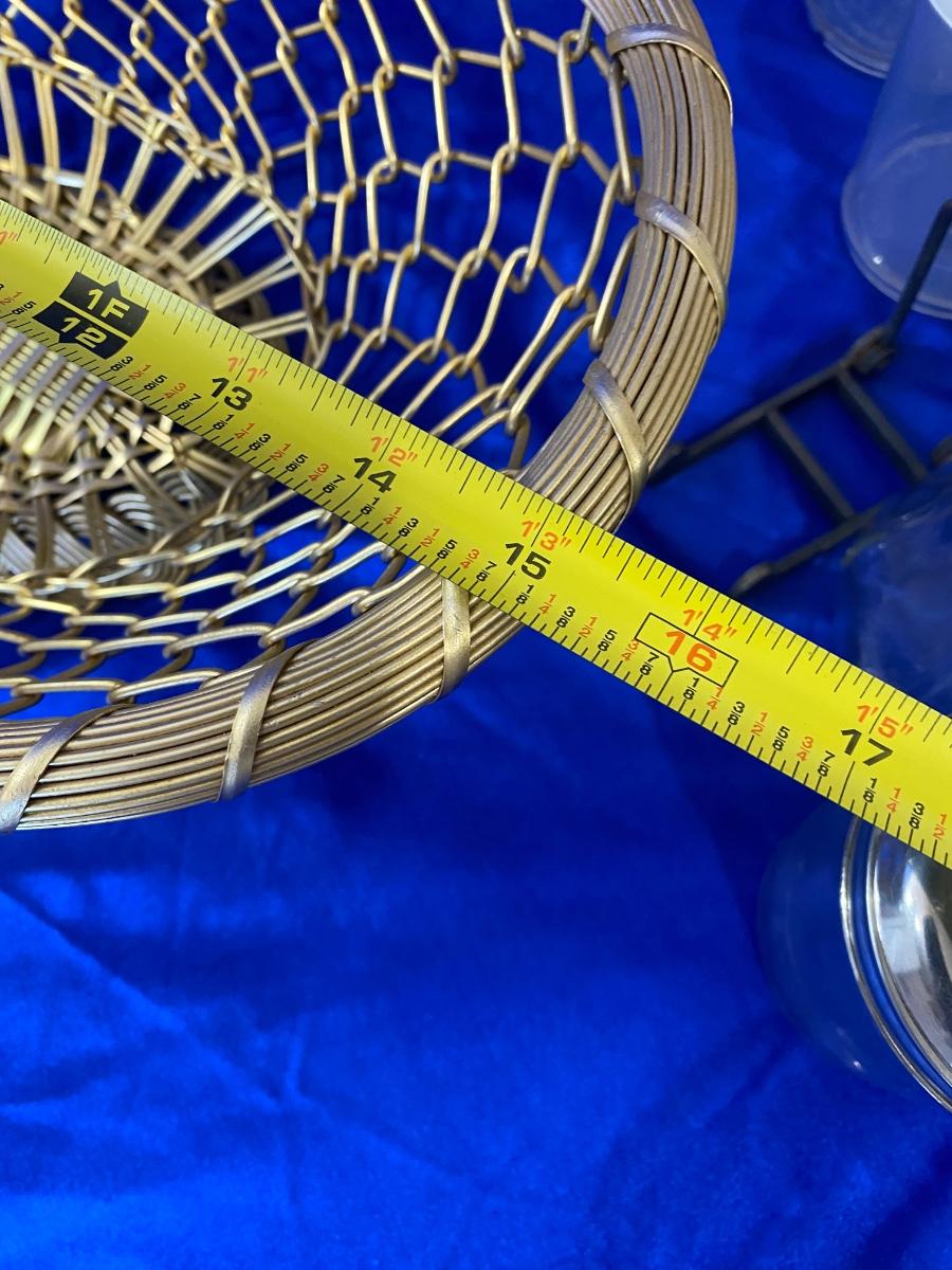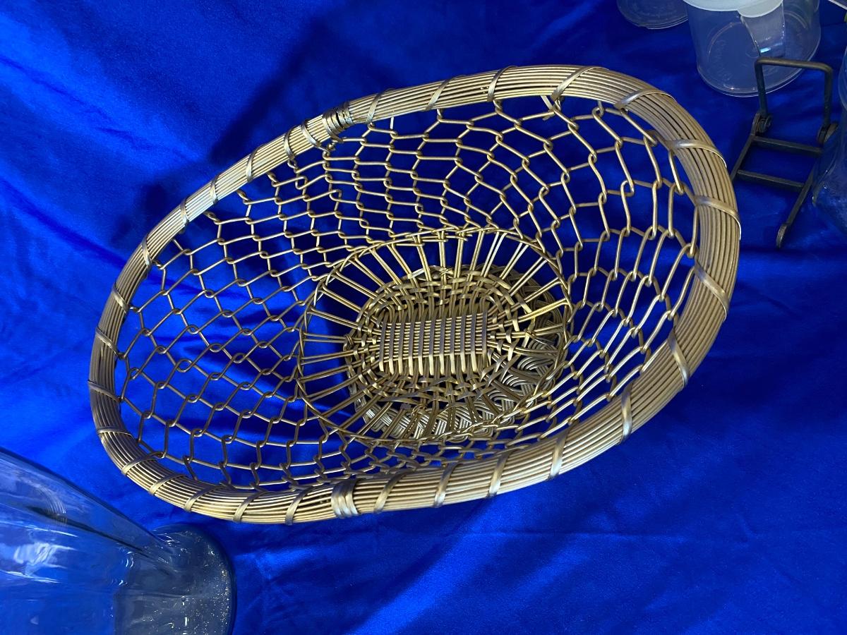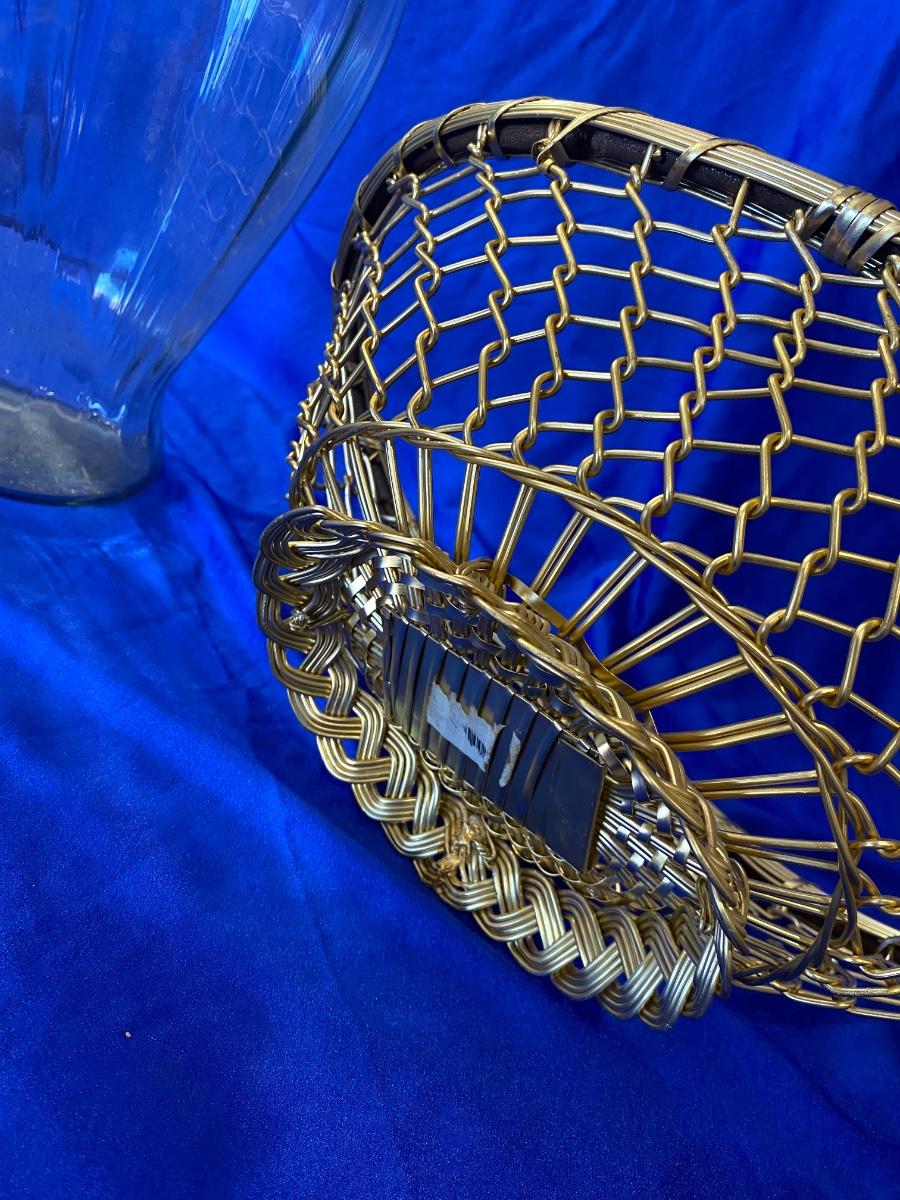 LARGE CLEAR VASE AND WEAVED WIRE BASKET