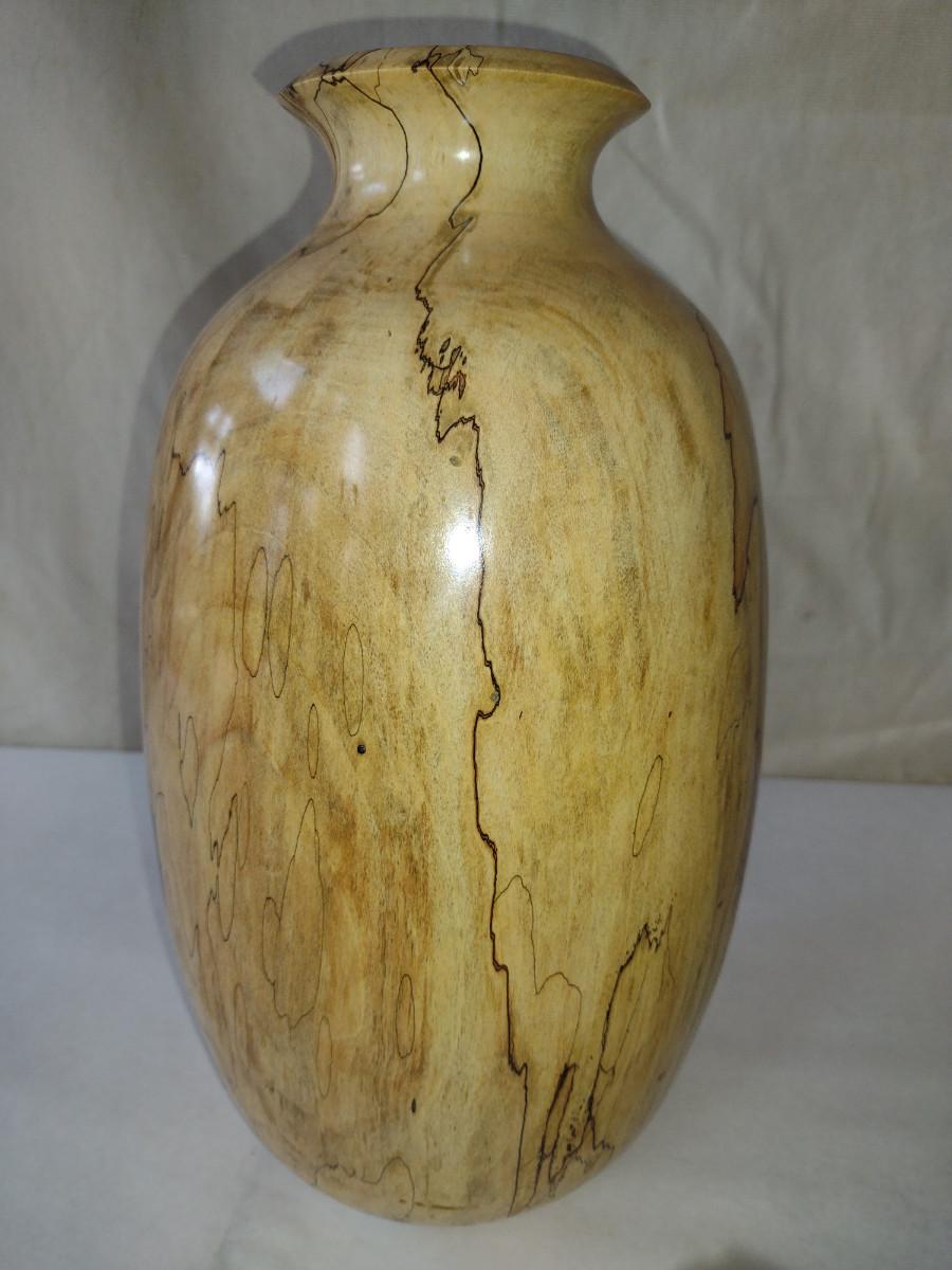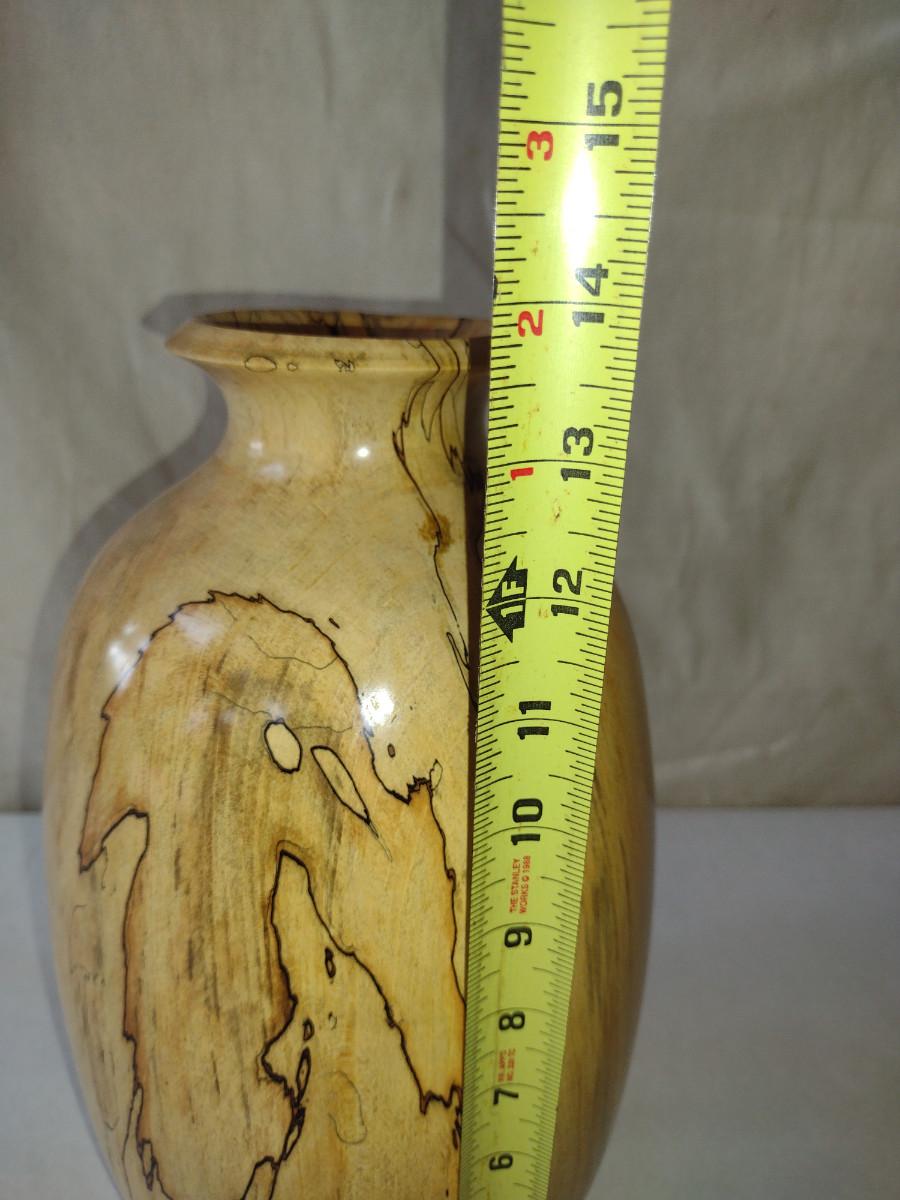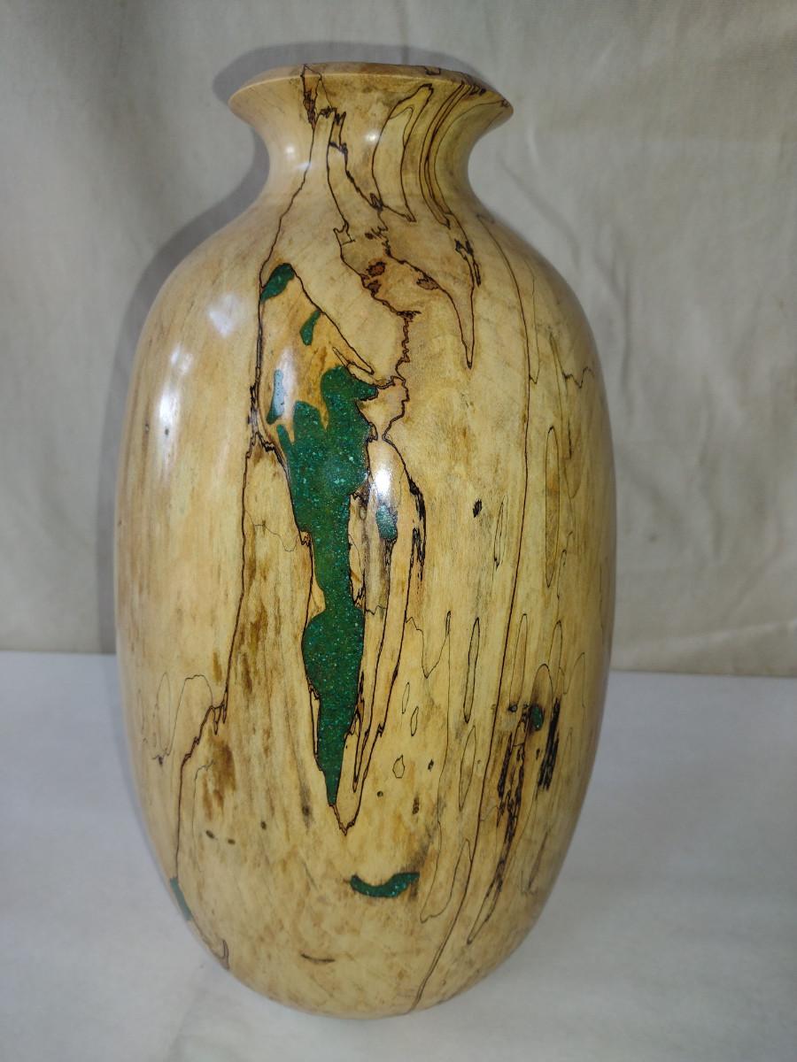 Large, Hand Crafted, Turned Wood Vase by Bobby Phillips- Spalted Maple and Chrysocolla (#8). Item measures approx 13 3/4" tall.