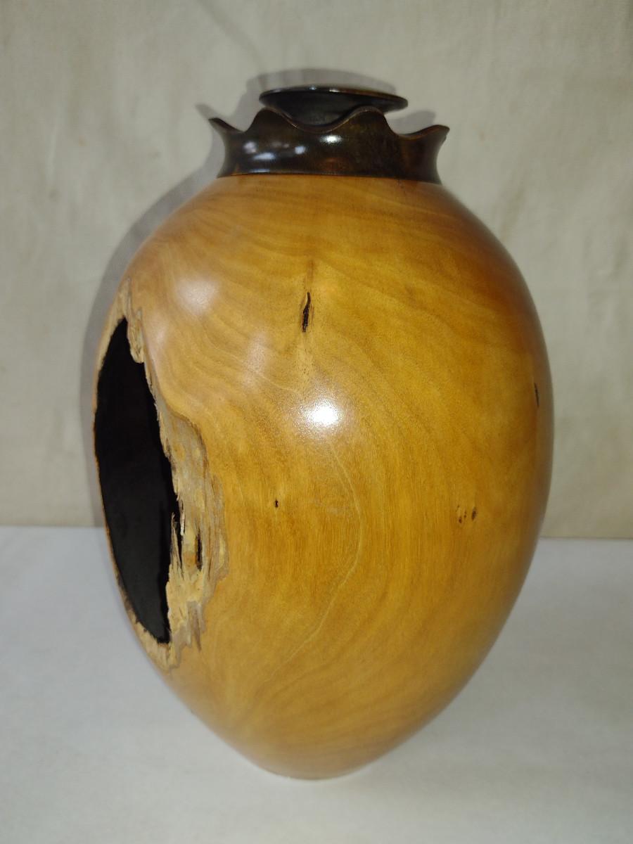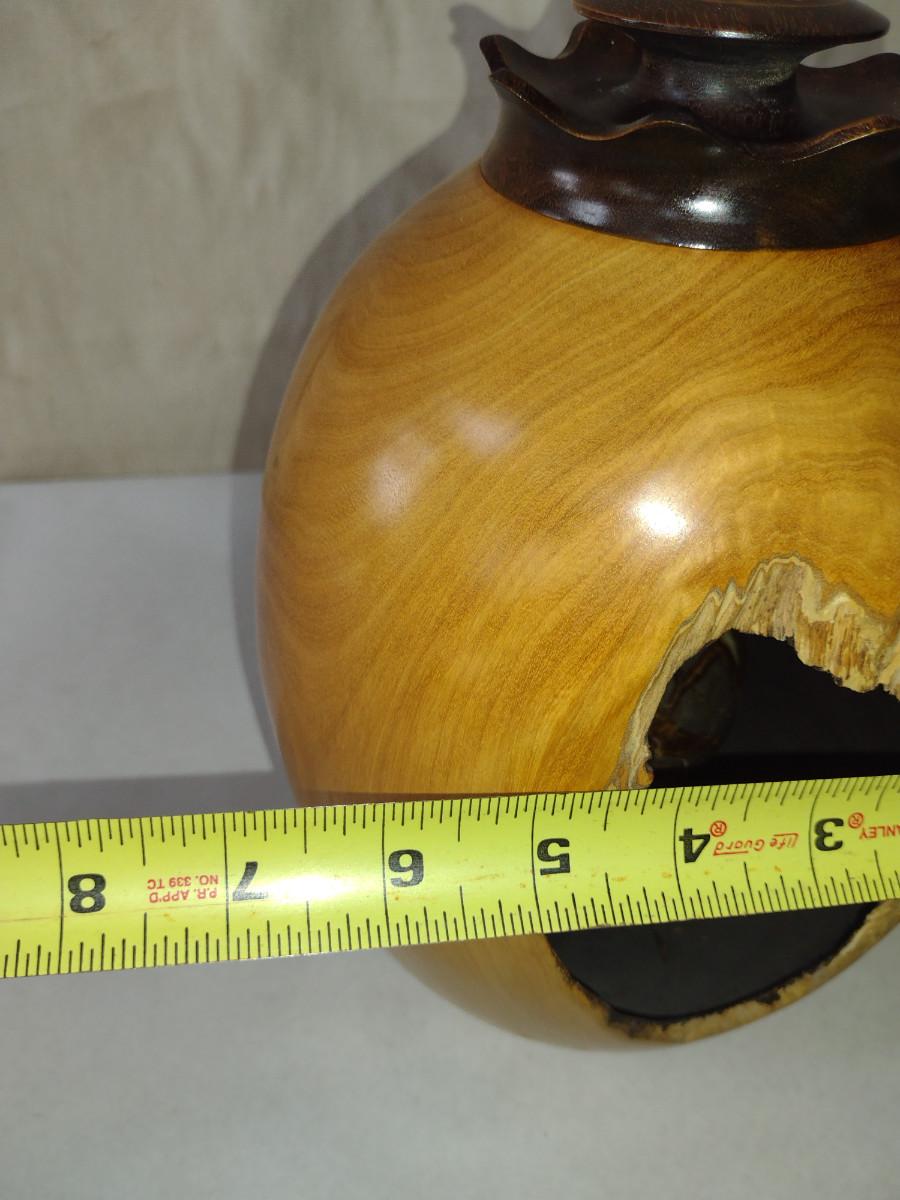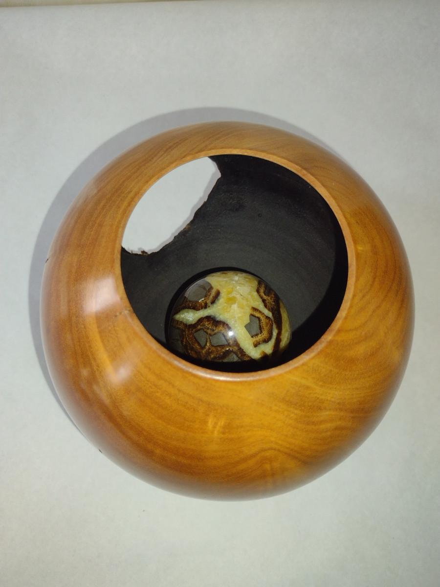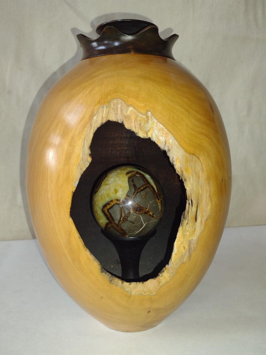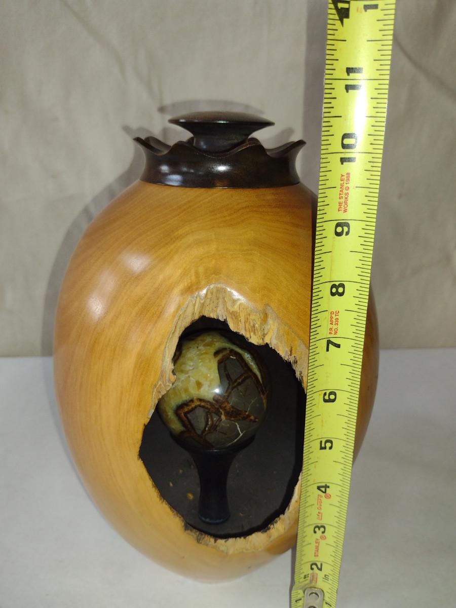 Large, Hand Crafted, Turned Wood Vase by Bobby Phillips- Melaleuca and Stone Orb (#10). Item measures approx 10 1/2" tall.