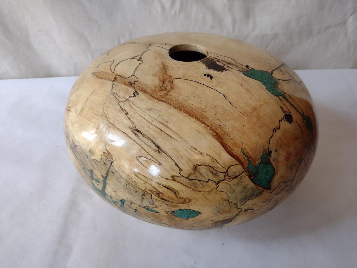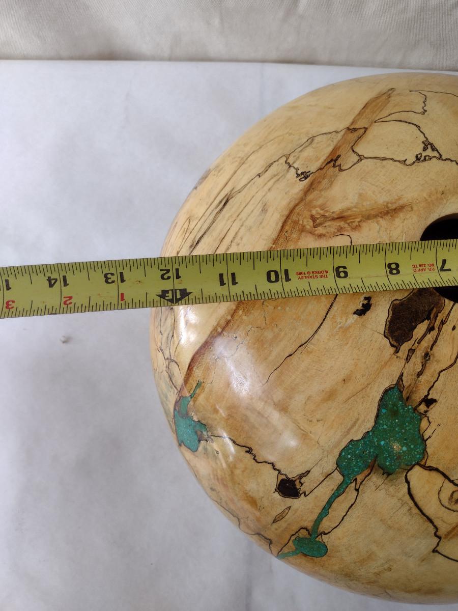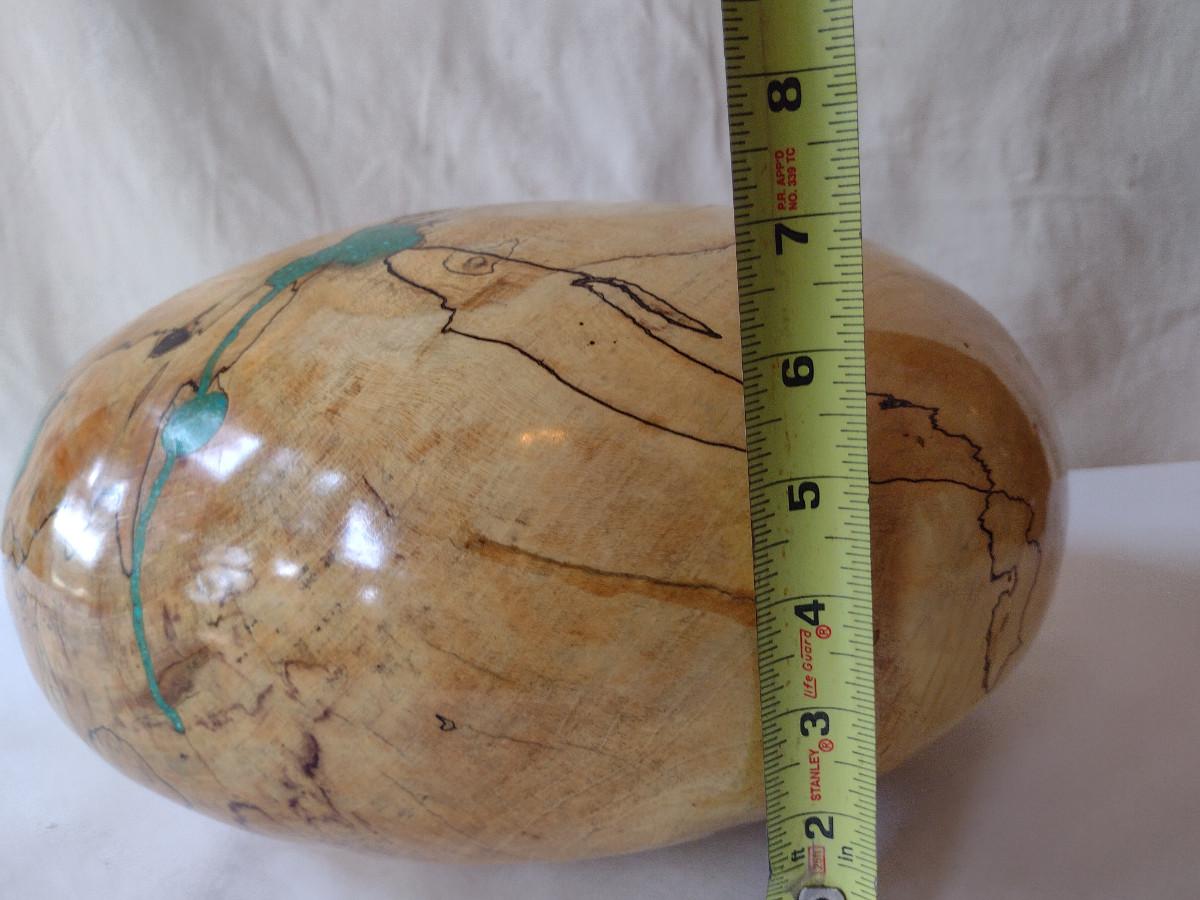 Large, Hand Crafted, Turned Wood Vase by Bobby Phillips- Spalted Maple and Turquoise (#18). Item measures approx 12 1/2" in diameter.
