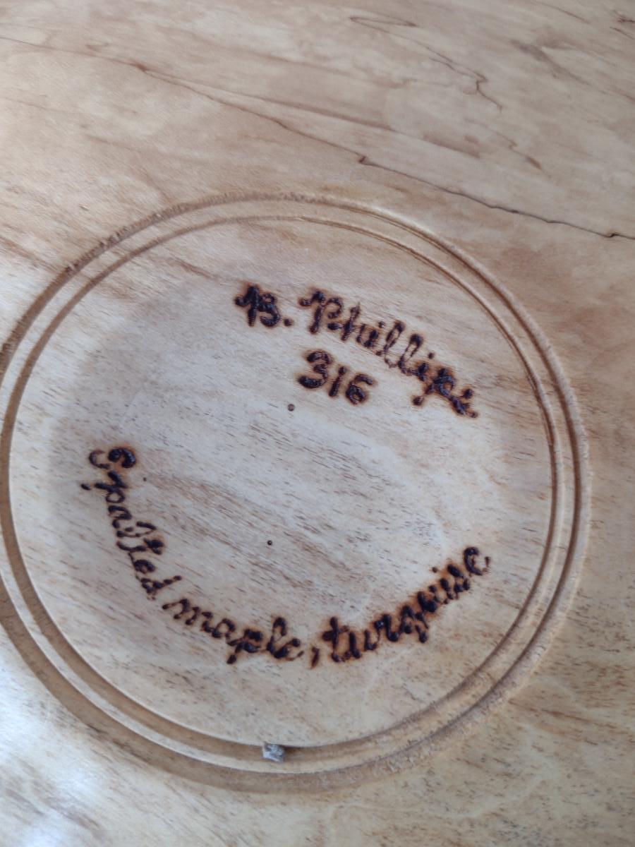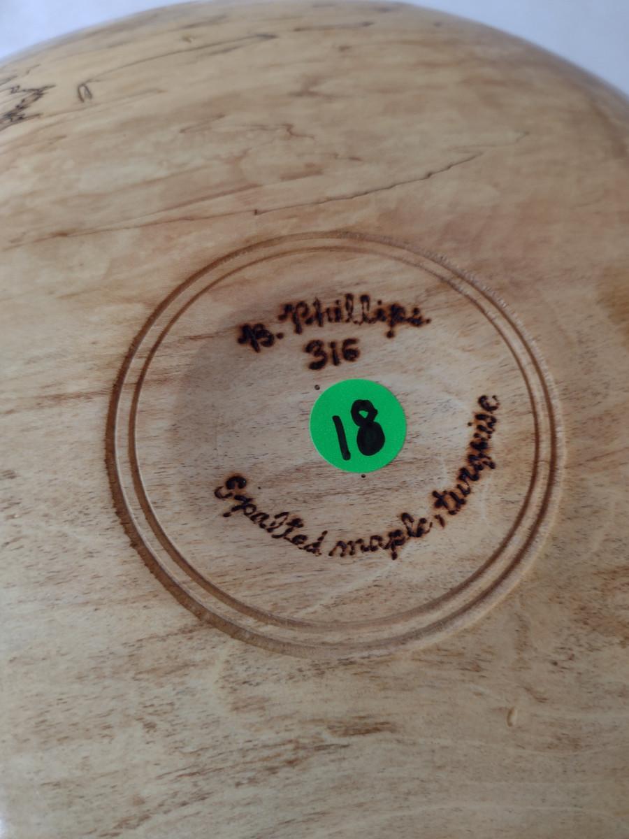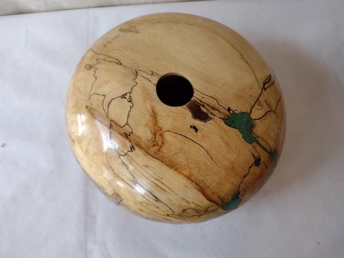 Large, Hand Crafted, Turned Wood Vase by Bobby Phillips- Spalted Maple and Turquoise (#18). Item measures approx 12 1/2" in diameter.