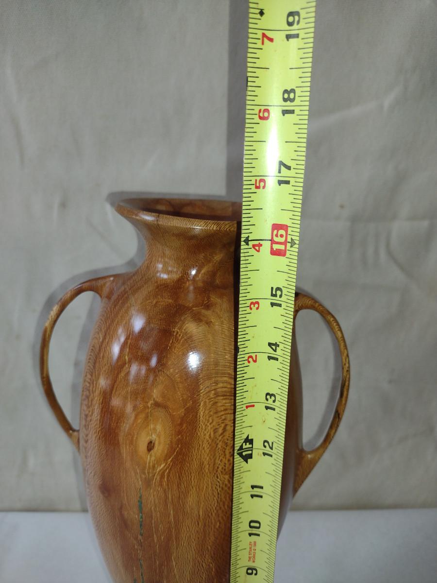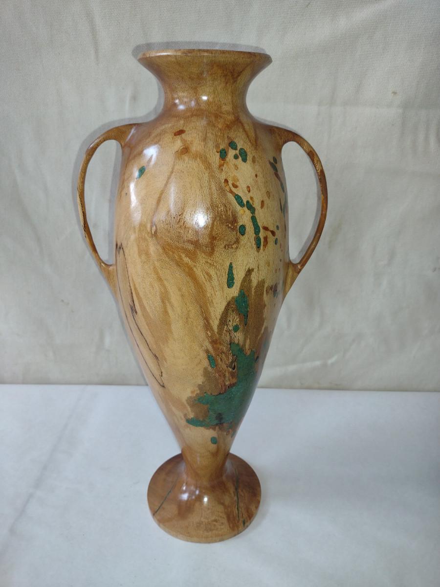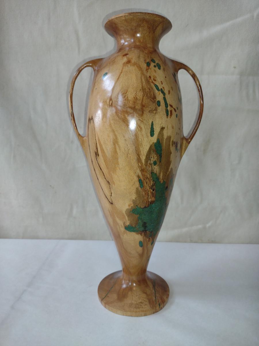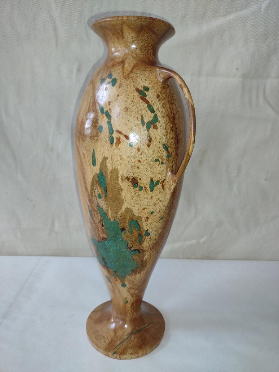 Large, Hand Crafted, Turned Wood Vase by Bobby Phillips- Sycamore and Chrysocolla (#26). Item measures approx 16 1/4" tall.