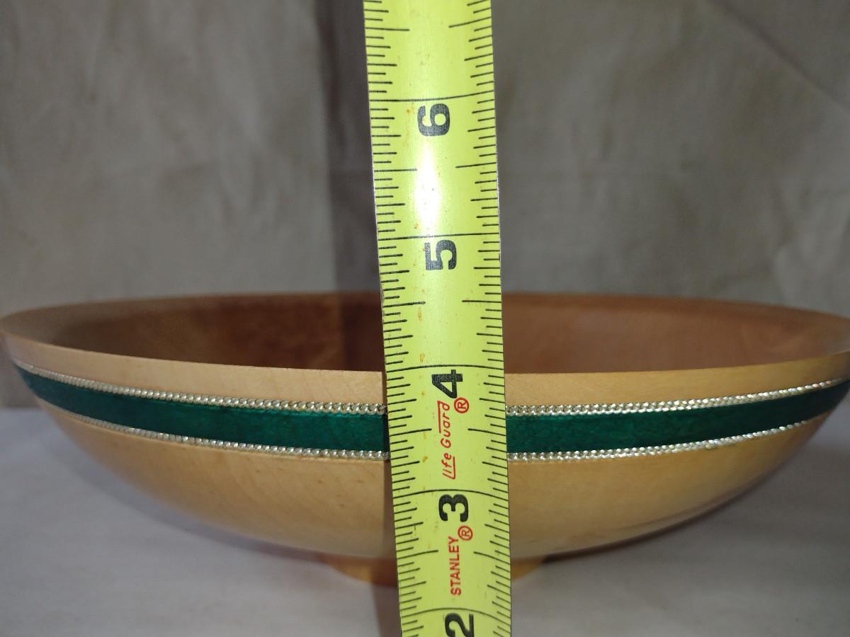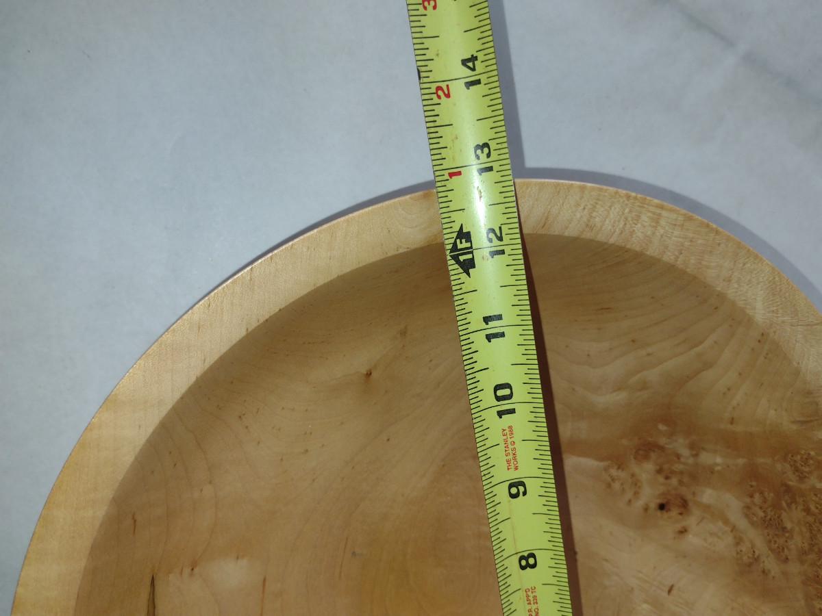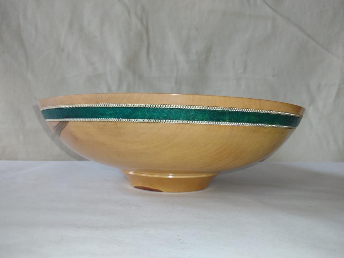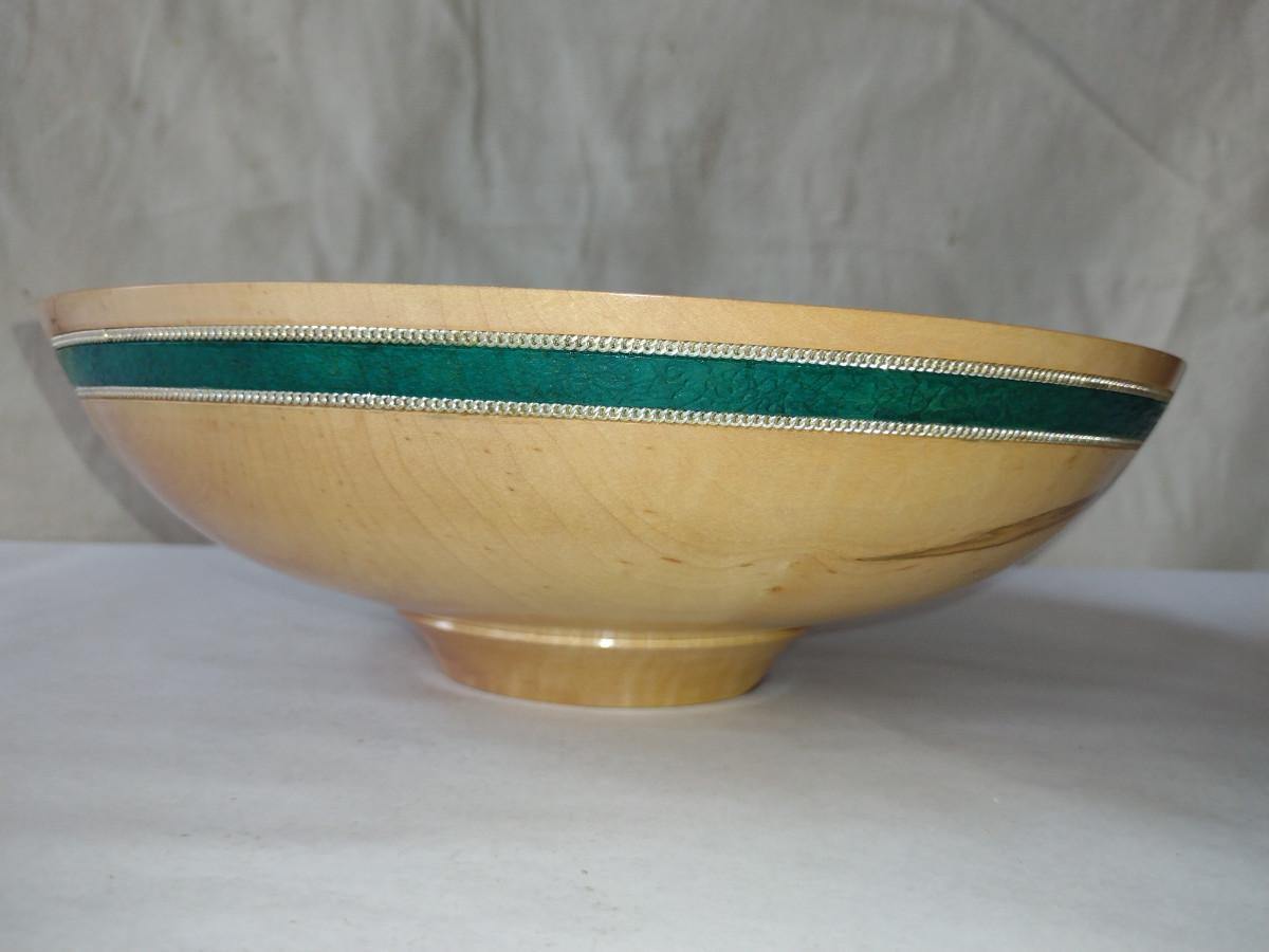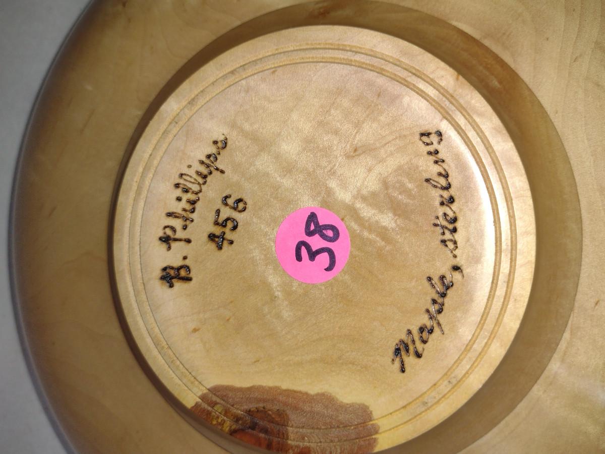 Large, Hand Crafted, Turned Wood Bowl by Bobby Phillips- Maple and Sterling (#38). Item measures approx 12 7/8" in diameter.