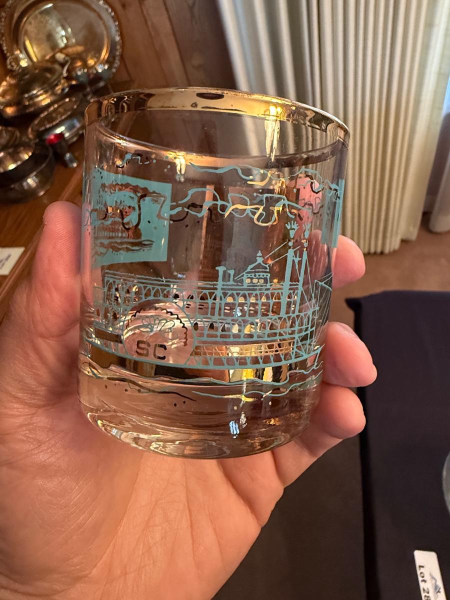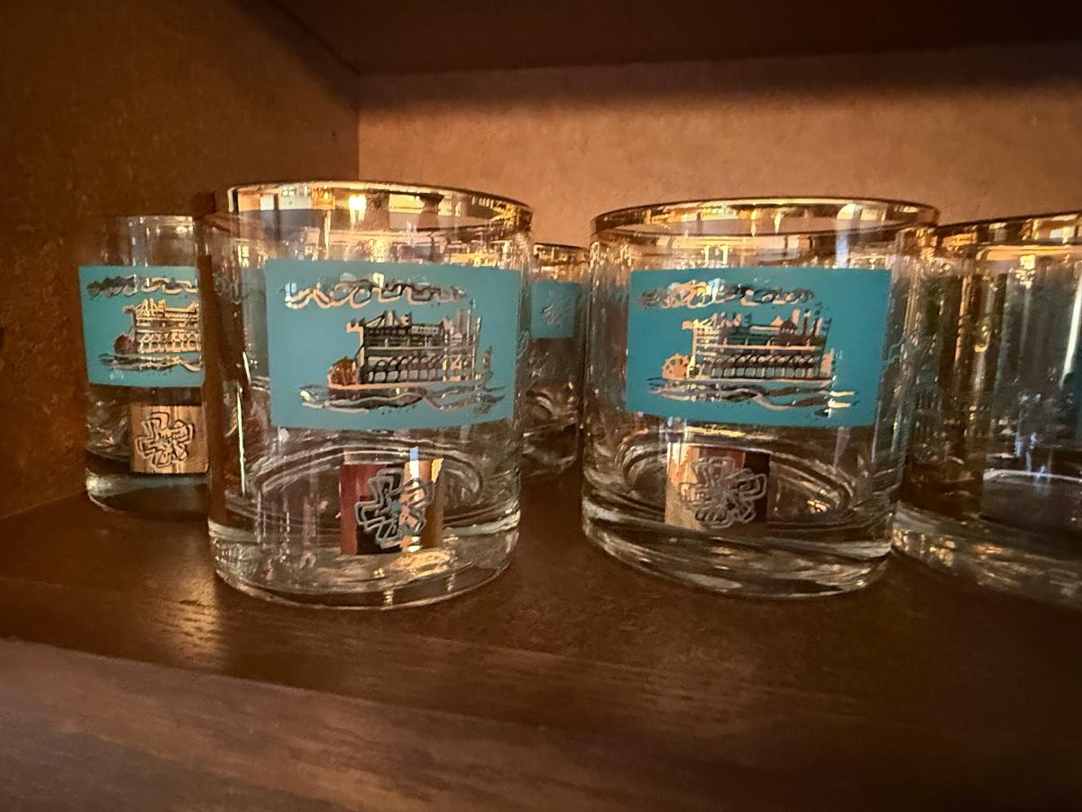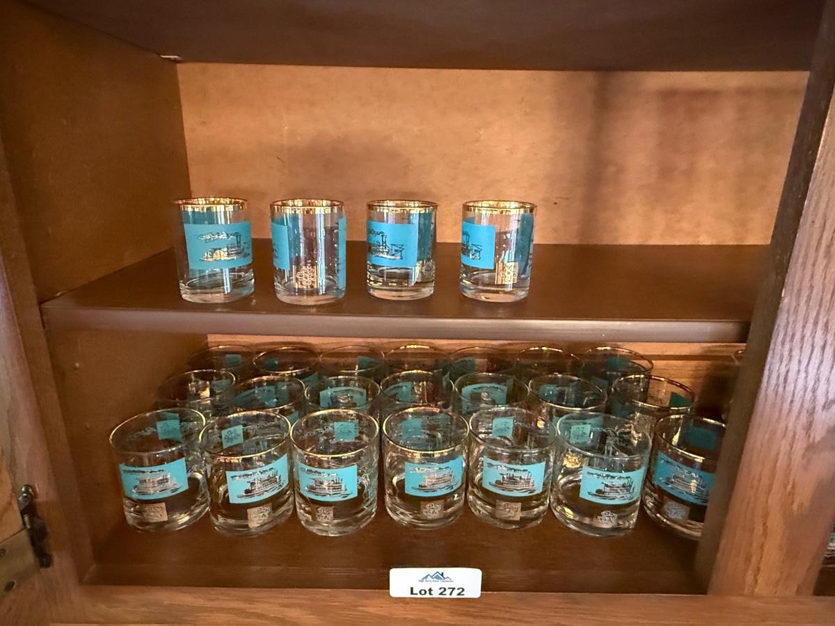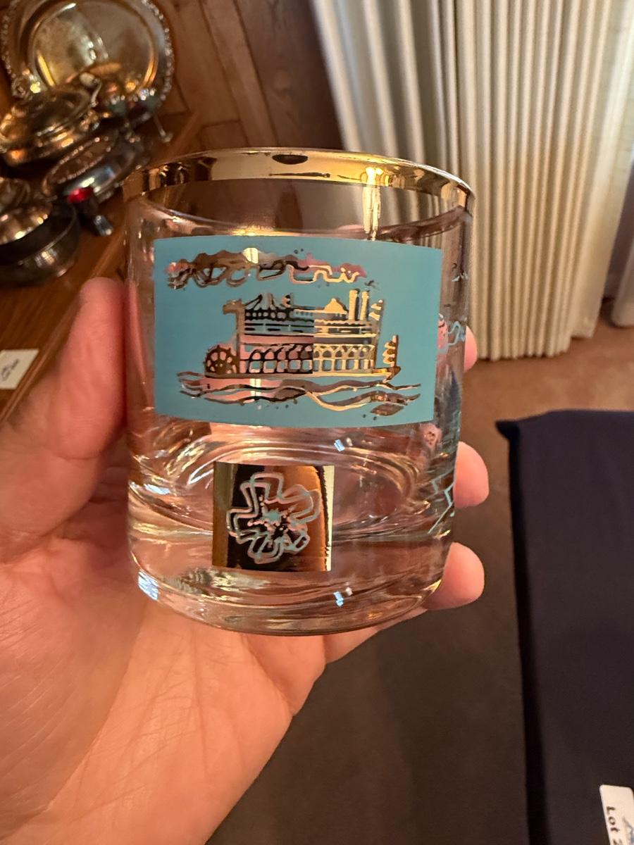 Steamboat themed gold rimmed 37 rocks & 4 shot glasses