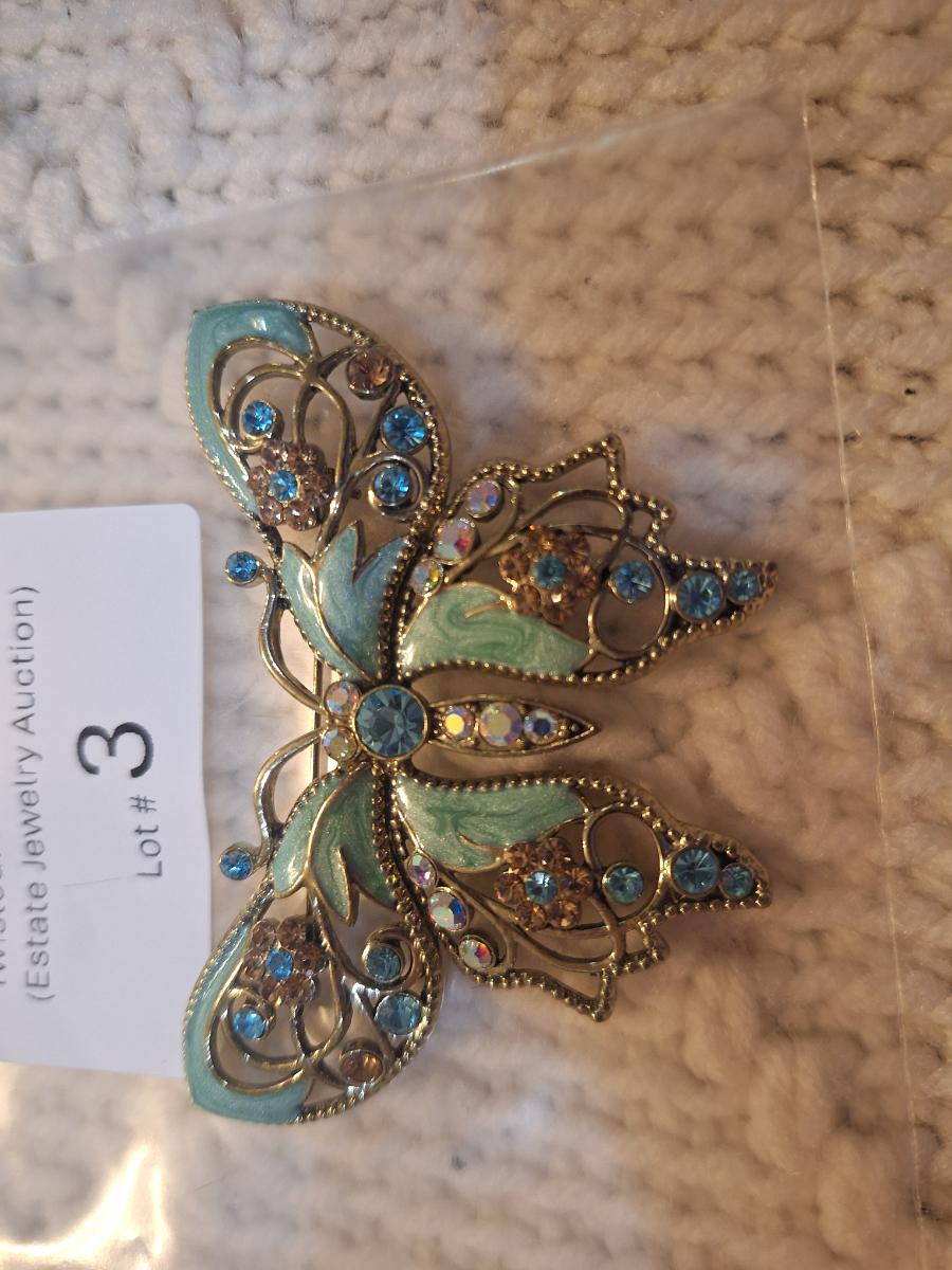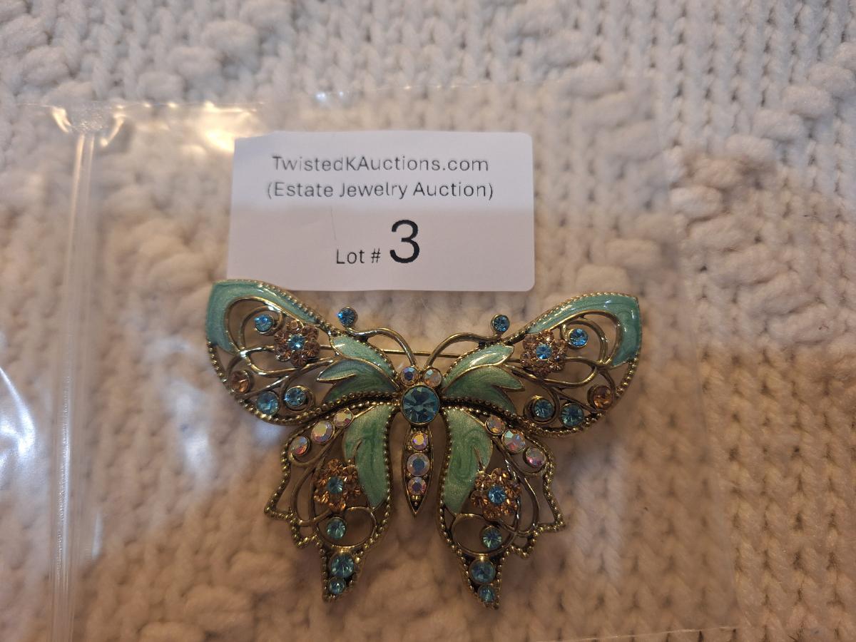 large vintage Avon gold tone butterfly brooch with green enamel, clear and green rhinestones