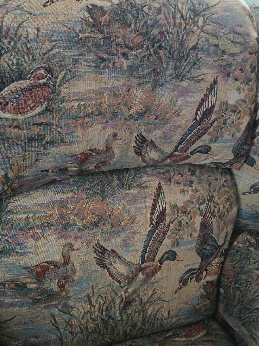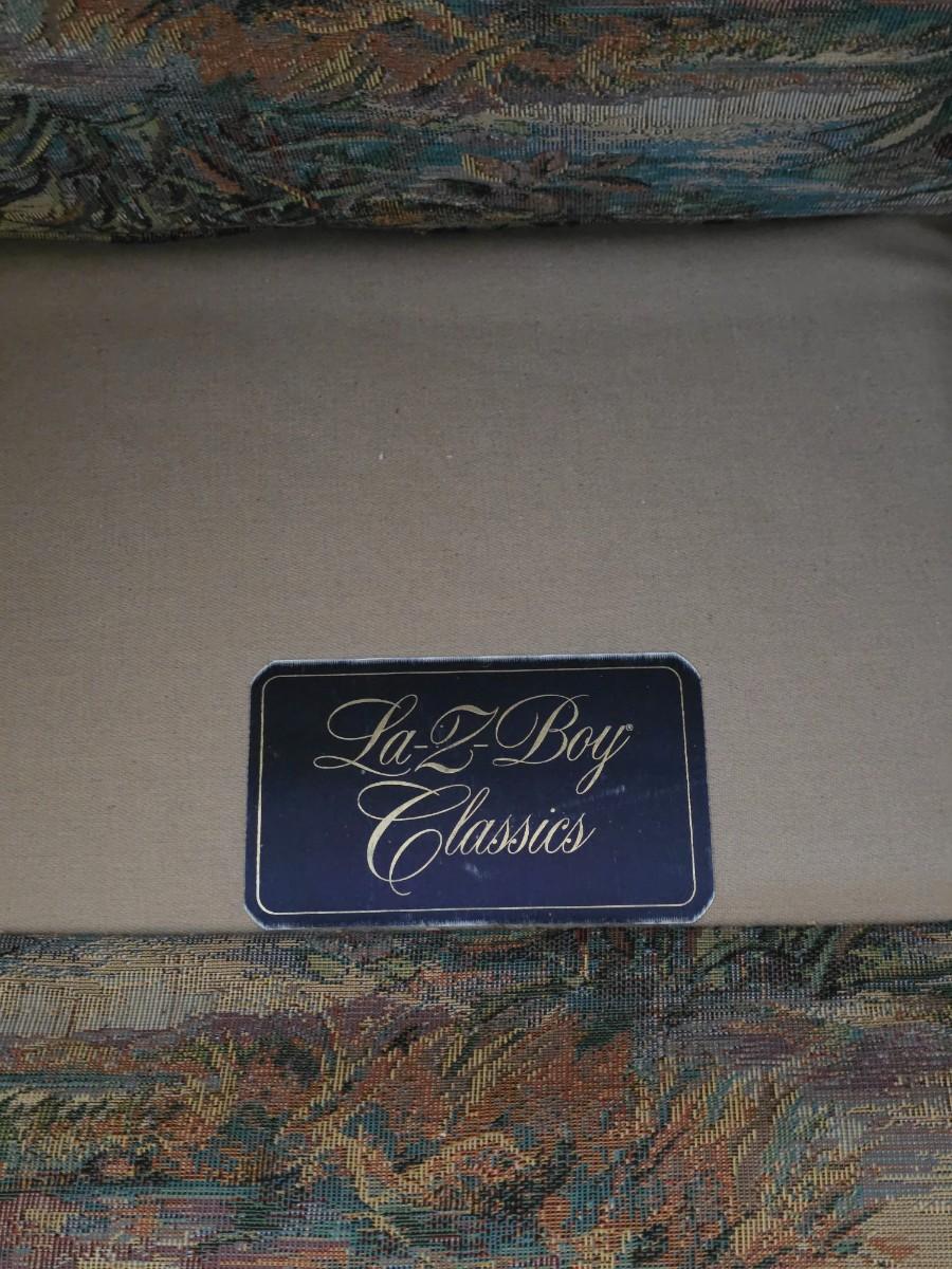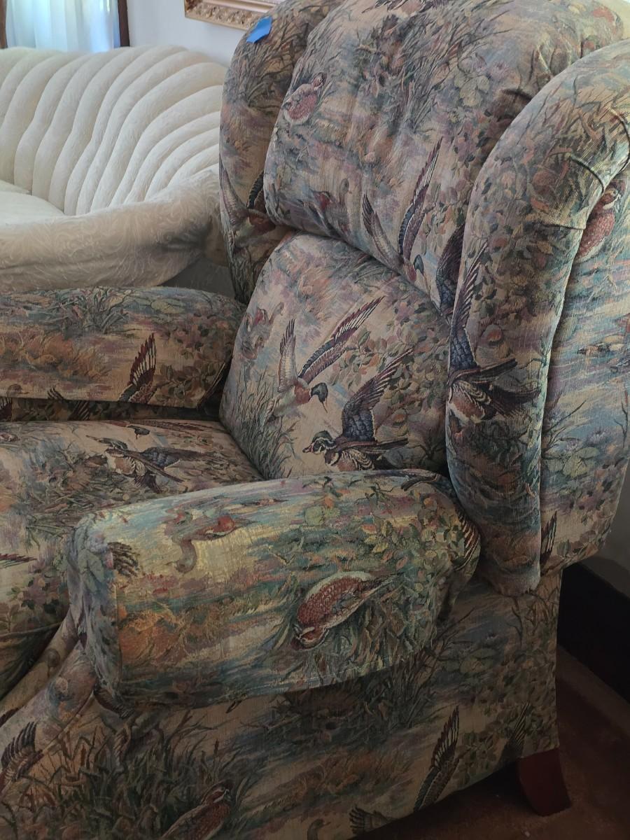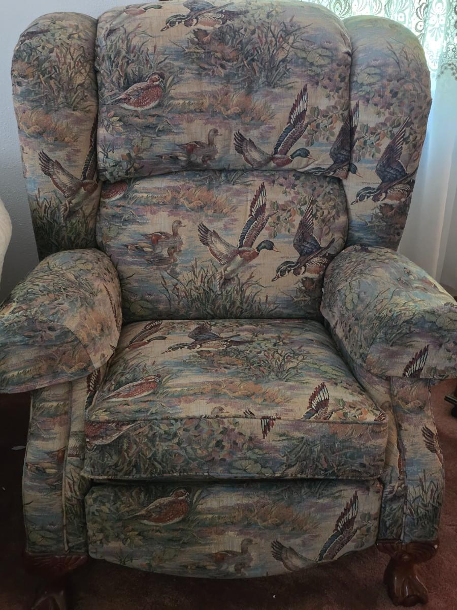 Comfy overstuffed La-Z-Boy chair with duck fabric. Measures across top 38", floor to top 40" floor to seat 18". Located on main floor, bring help to remove