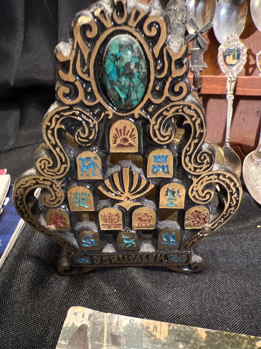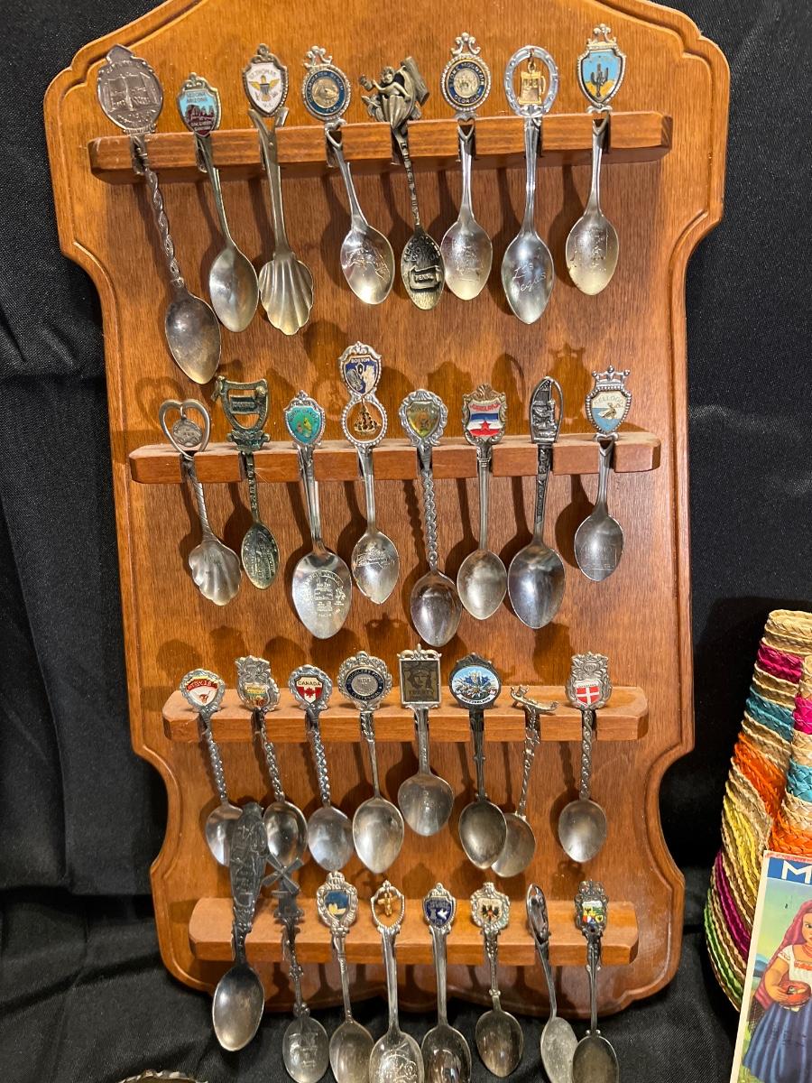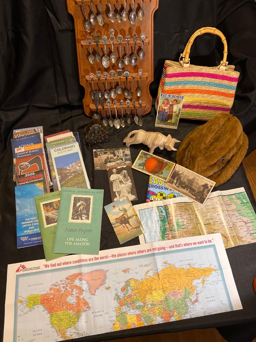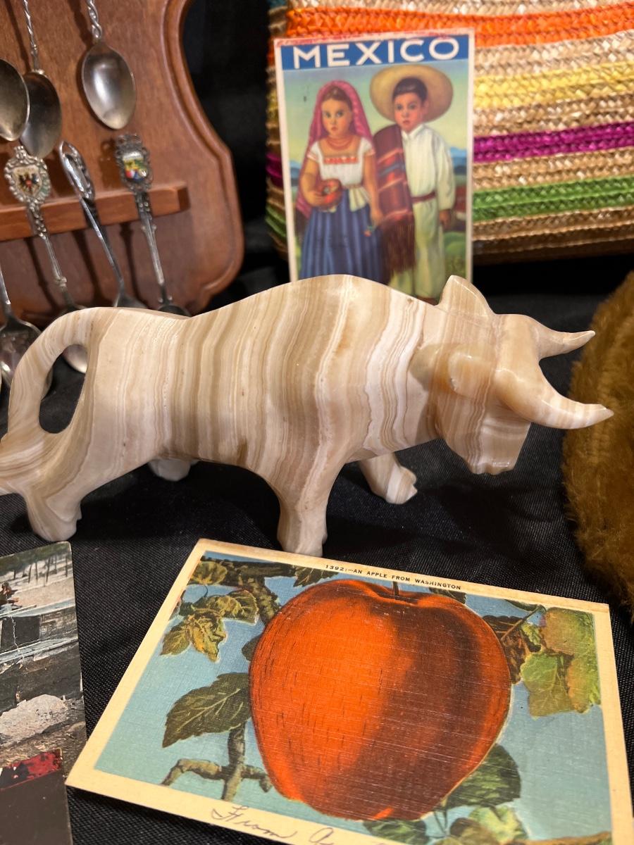 Vintage spoon collection. Vintage men’s fedora size X-Large. Various maps, straw purse with bamboo handles, Vintage post cards, a napkin holder from Jerusalem, and a vintage onyx bull figure.