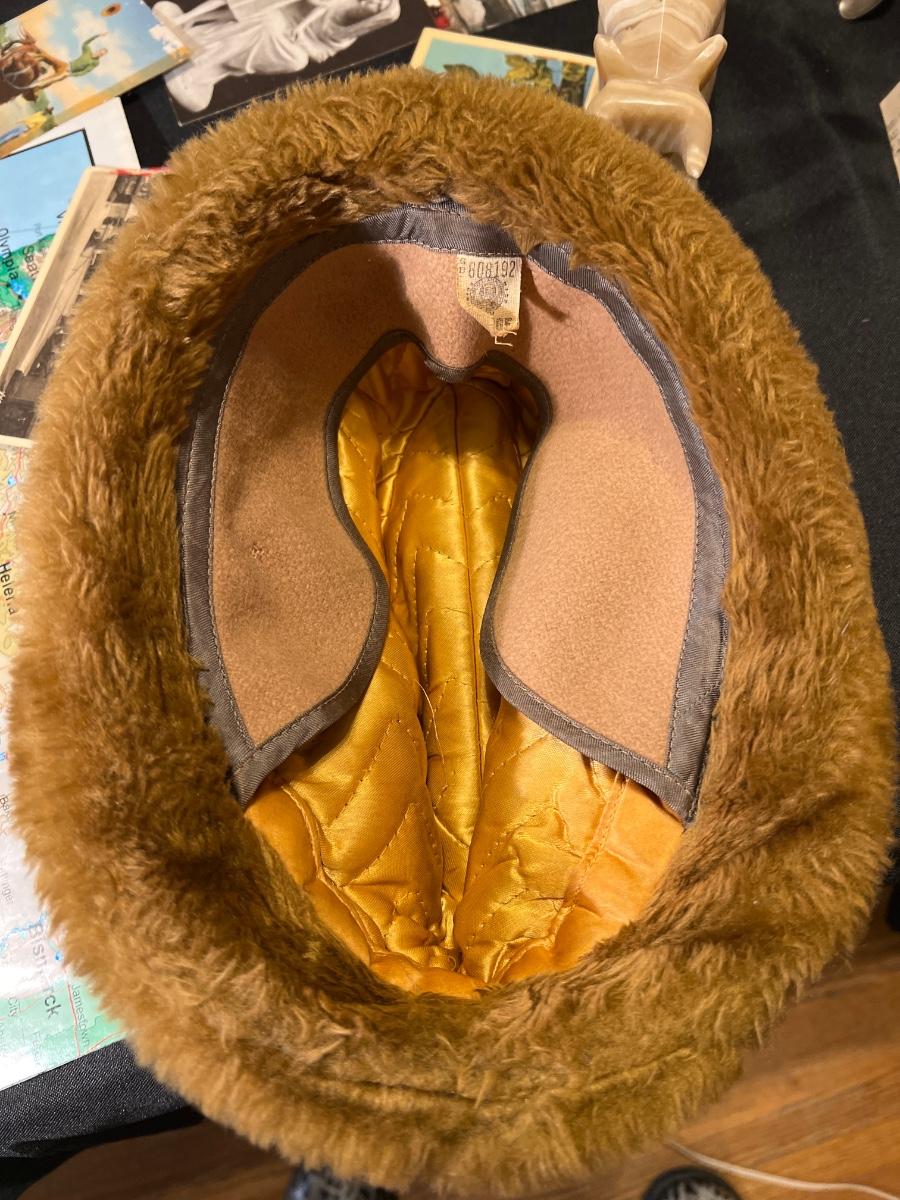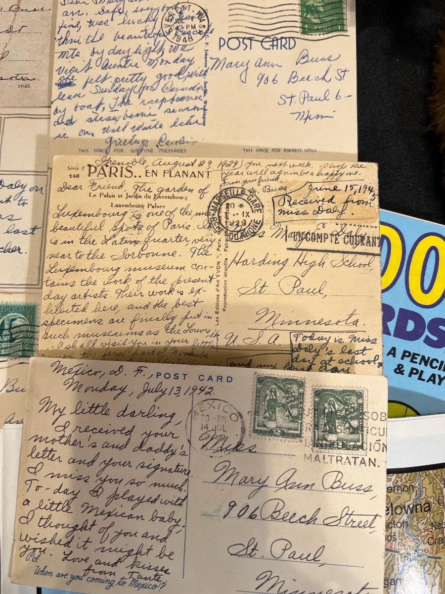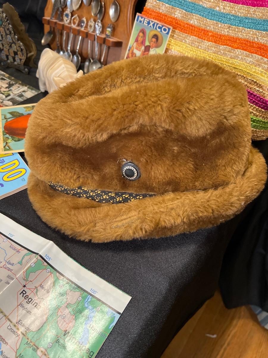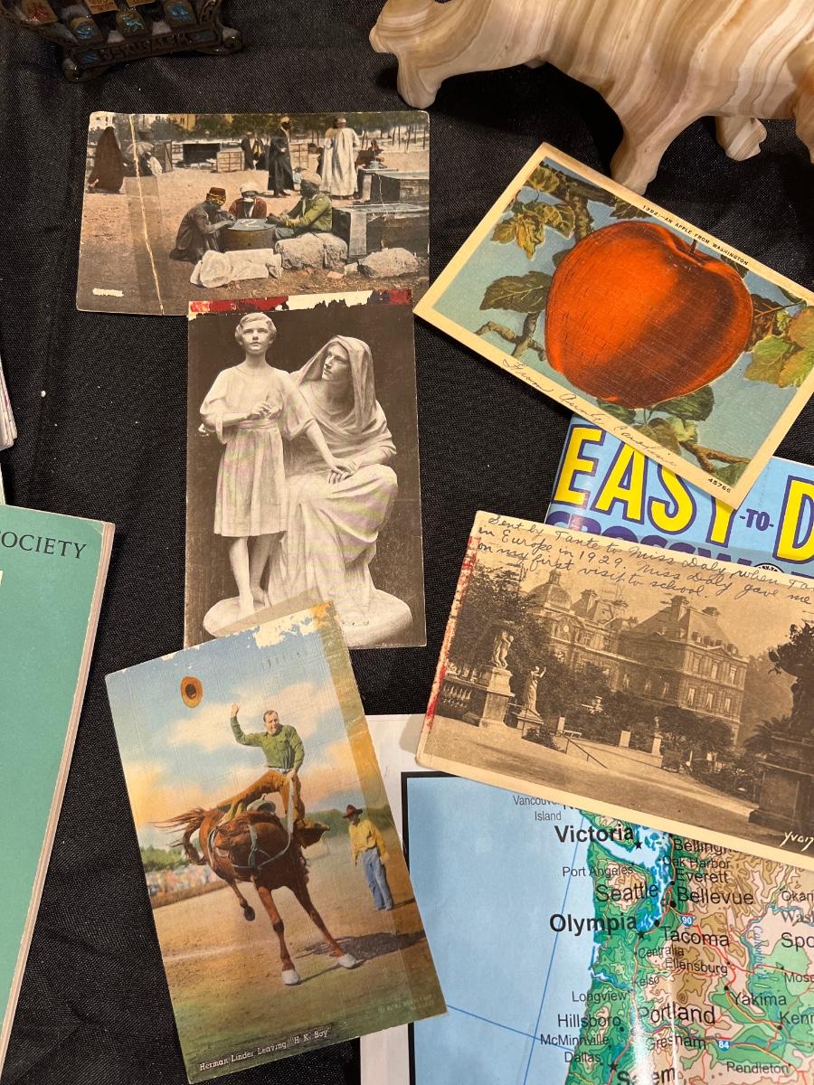 Vintage spoon collection. Vintage men’s fedora size X-Large. Various maps, straw purse with bamboo handles, Vintage post cards, a napkin holder from Jerusalem, and a vintage onyx bull figure.