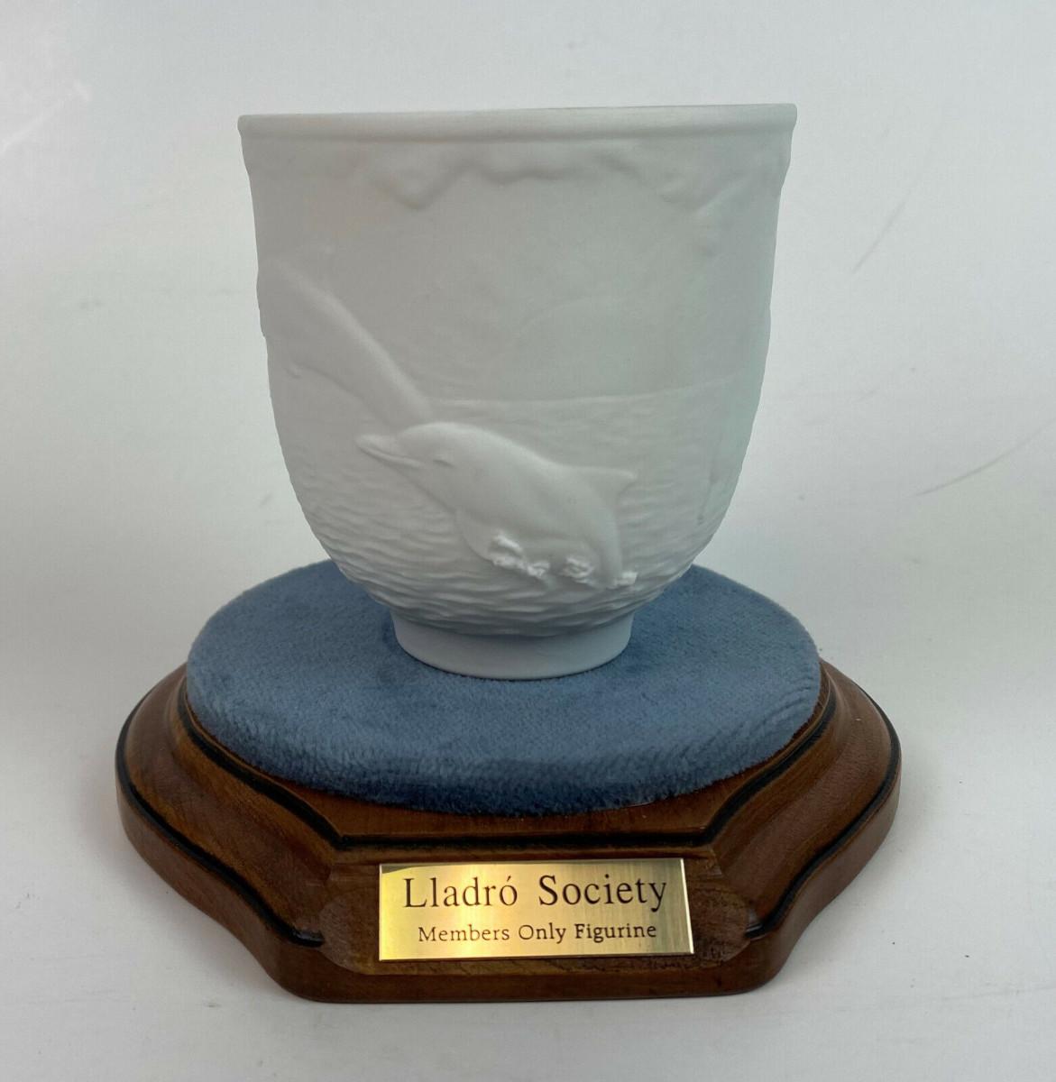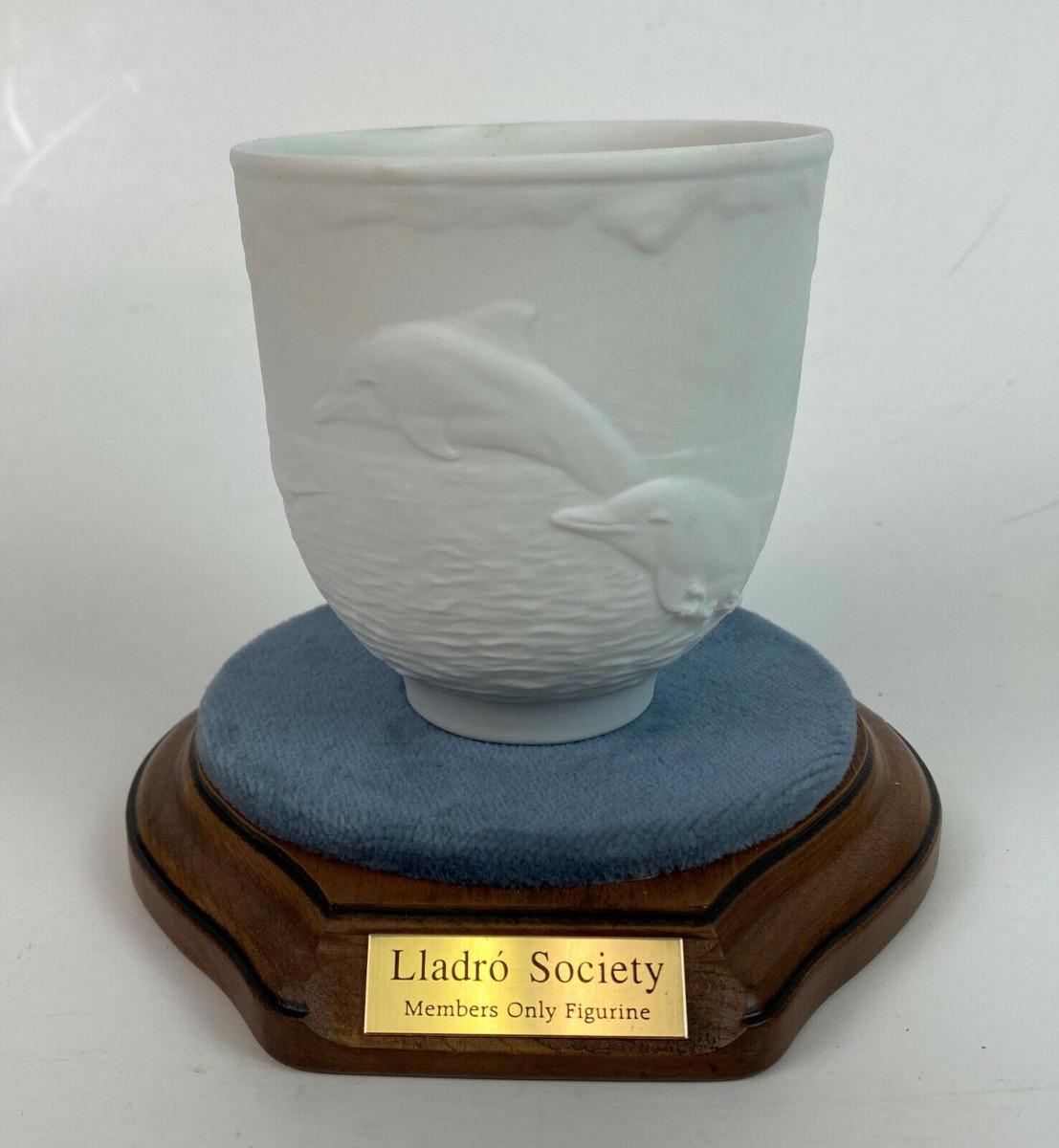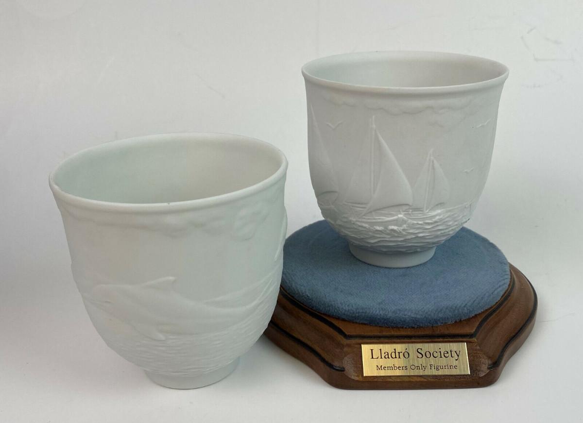 Excellent condition on this pair of Lladro Collectors Society votive candle holders from 1997 and 1998 with one(1) felt covered wooden 5.5" base...The porcelain cups are 3.5" high...Sailing the Seas and Dolphins at Play.