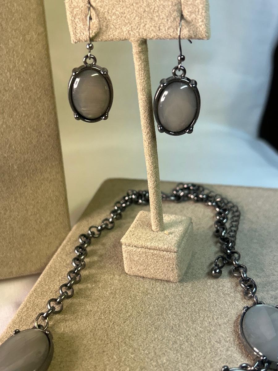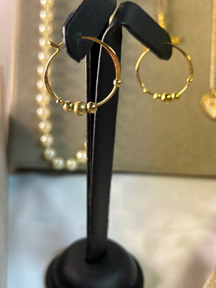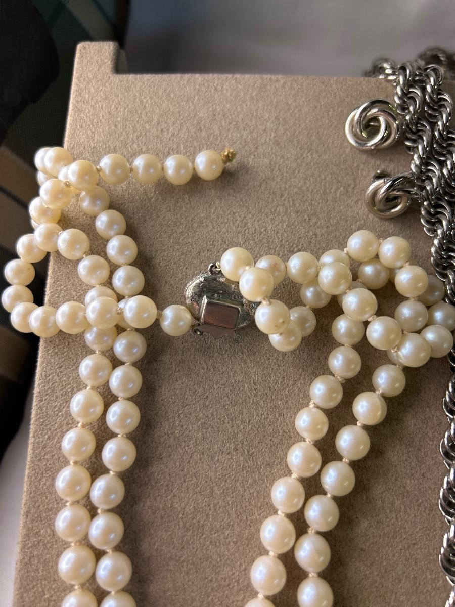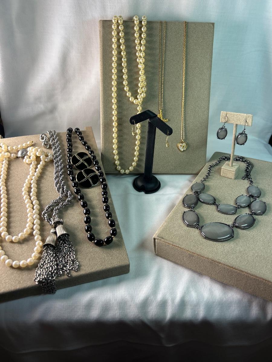7 necklaces, 3 pierced, 1 clip. It looks like the 1st necklace are pearls, 1 strand not attached.