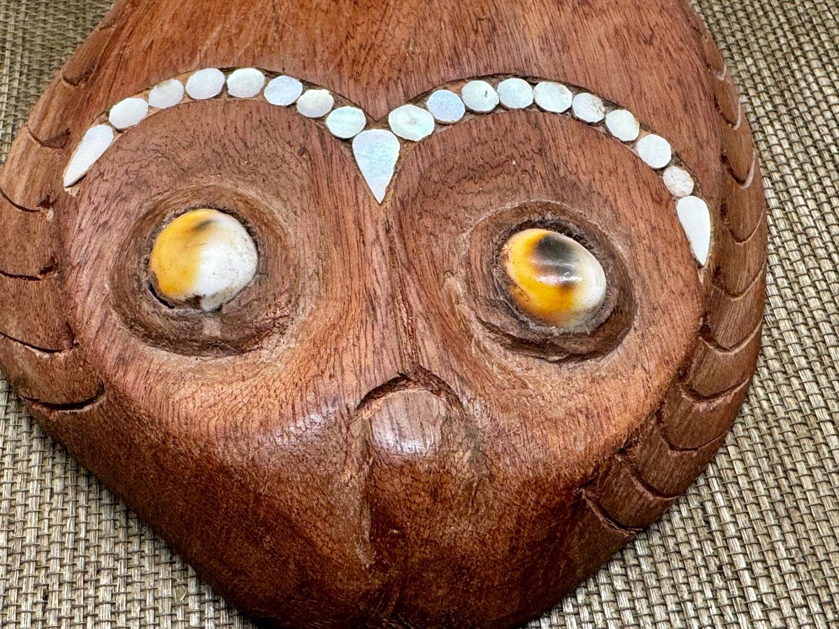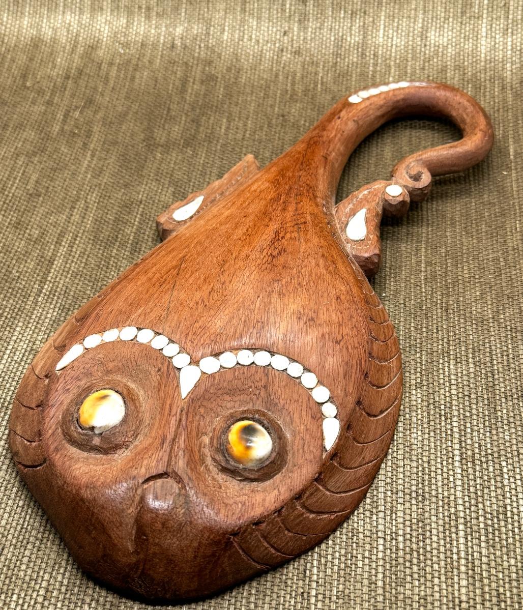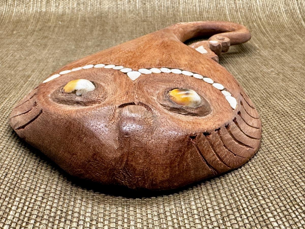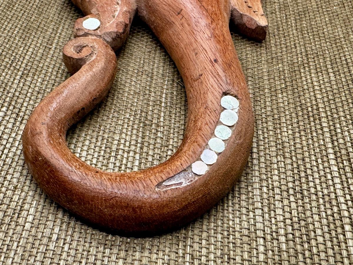 LOT 10 - Wooden Fish Decor Shells. A nice hand carved wooden fish with shell eyes and decor. One bead may be missing from the tail (see photo). This measures 10 inches long and at its widest it is 5 inches. The tail doesn't quite lay flat like the rest of the body. A really pretty piece.