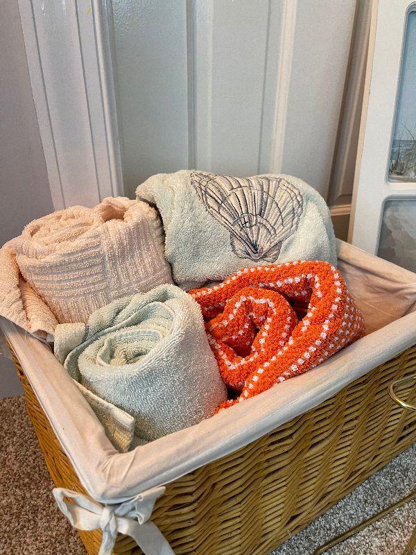 Assorted Bathroom Towels and Decor.