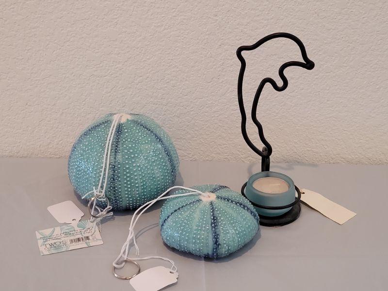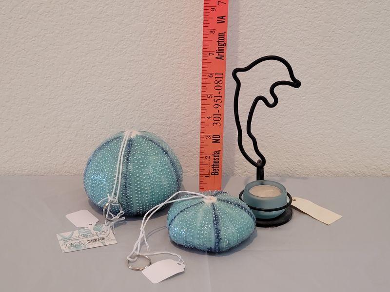 Lot 117: (2) New Sea Urchin Air Plant Holders and Maui Dolphin Candle holder