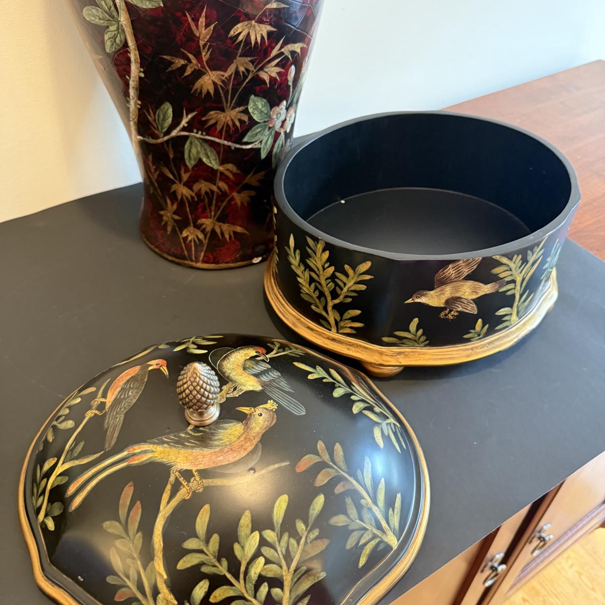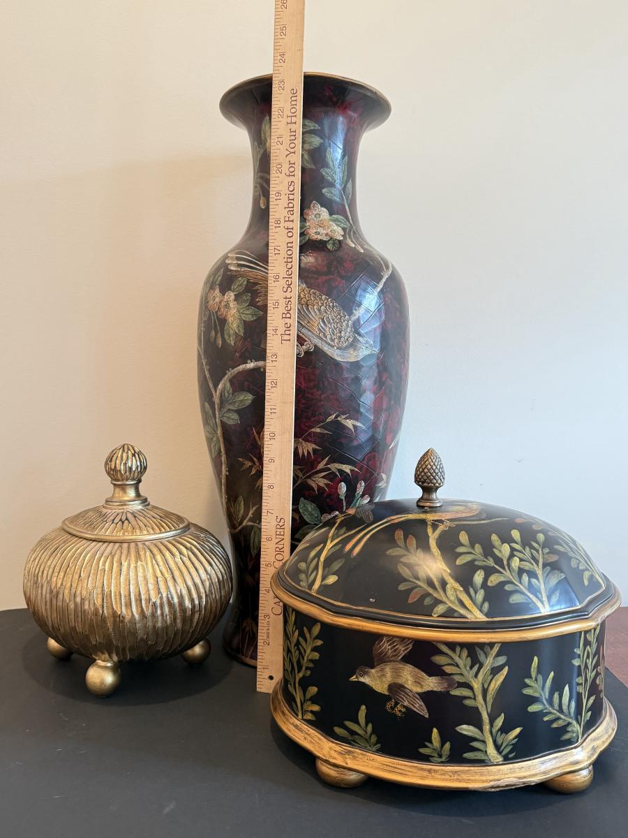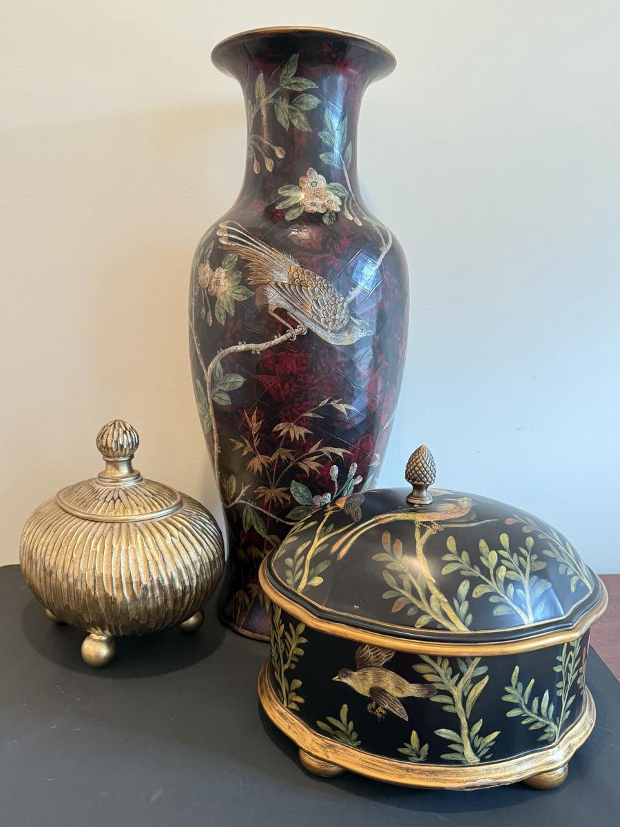 LOT 49D: Tall Bird Motif Vase and 2 Lidded Decor Vessels