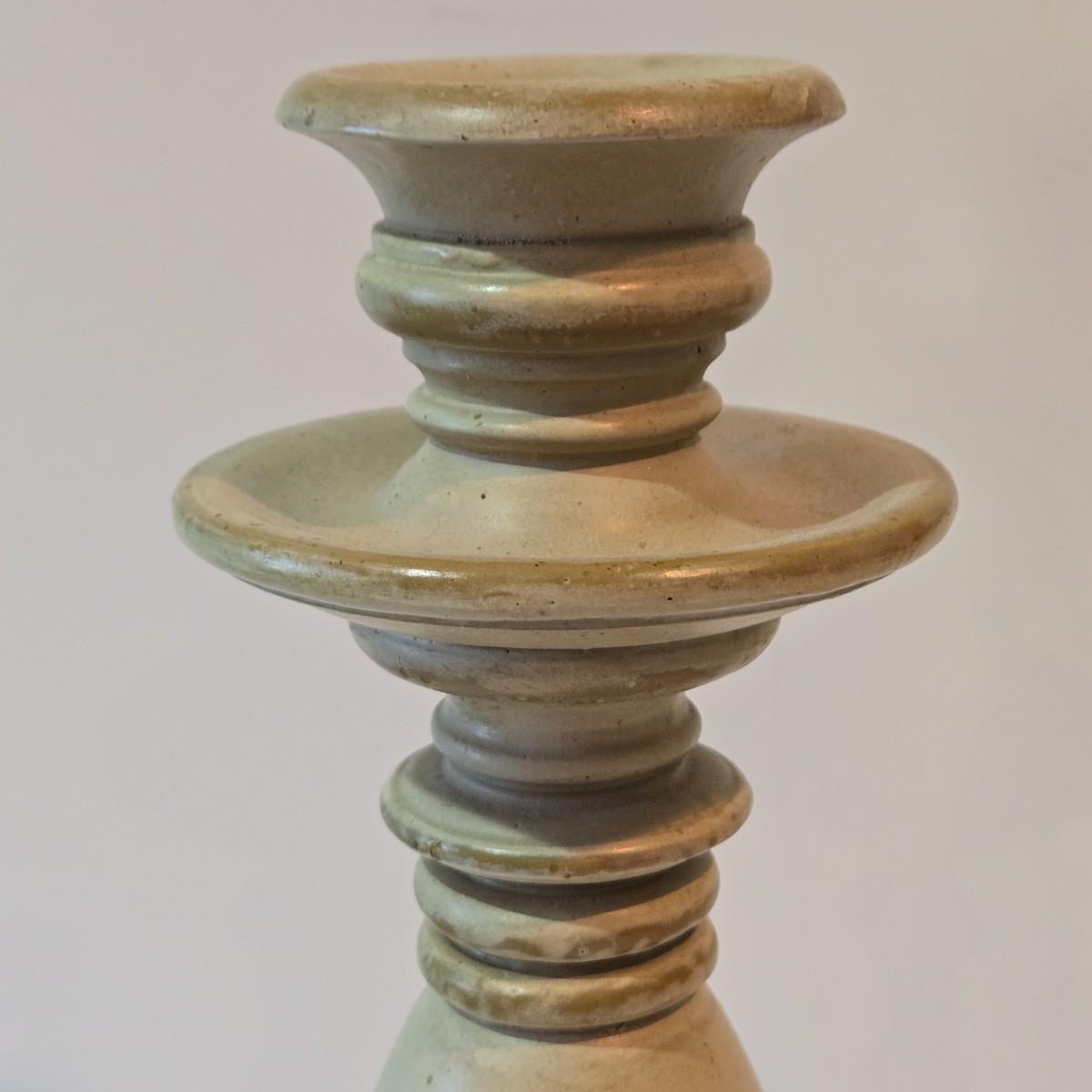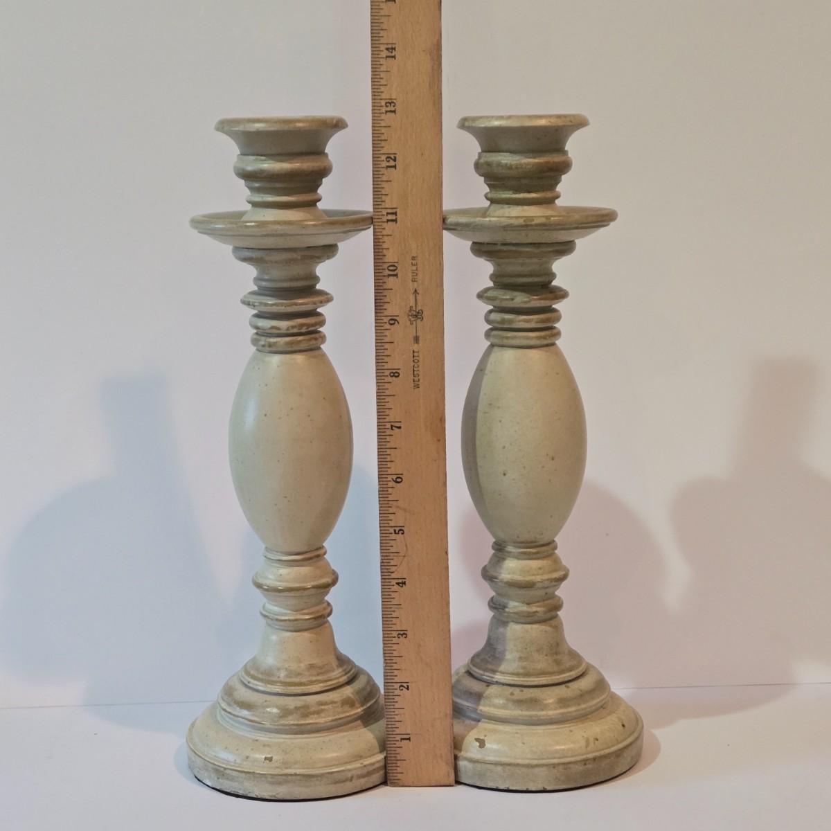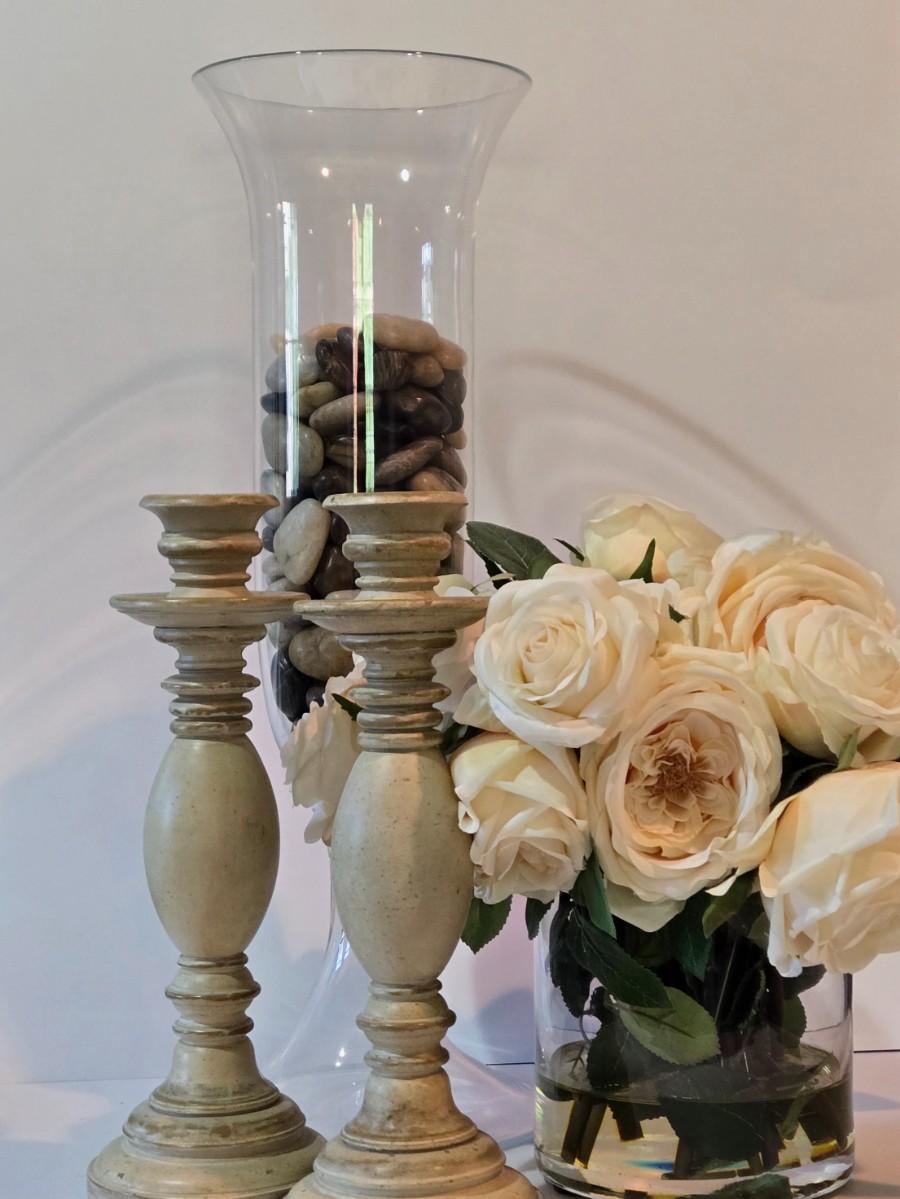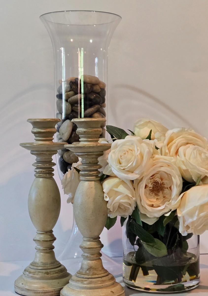 LOT 102Z: Glass Jar with Smooth Stones, Silk Roses in Glass Bowl, and Two Candlesticks