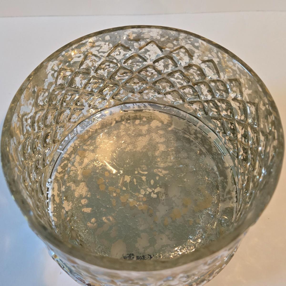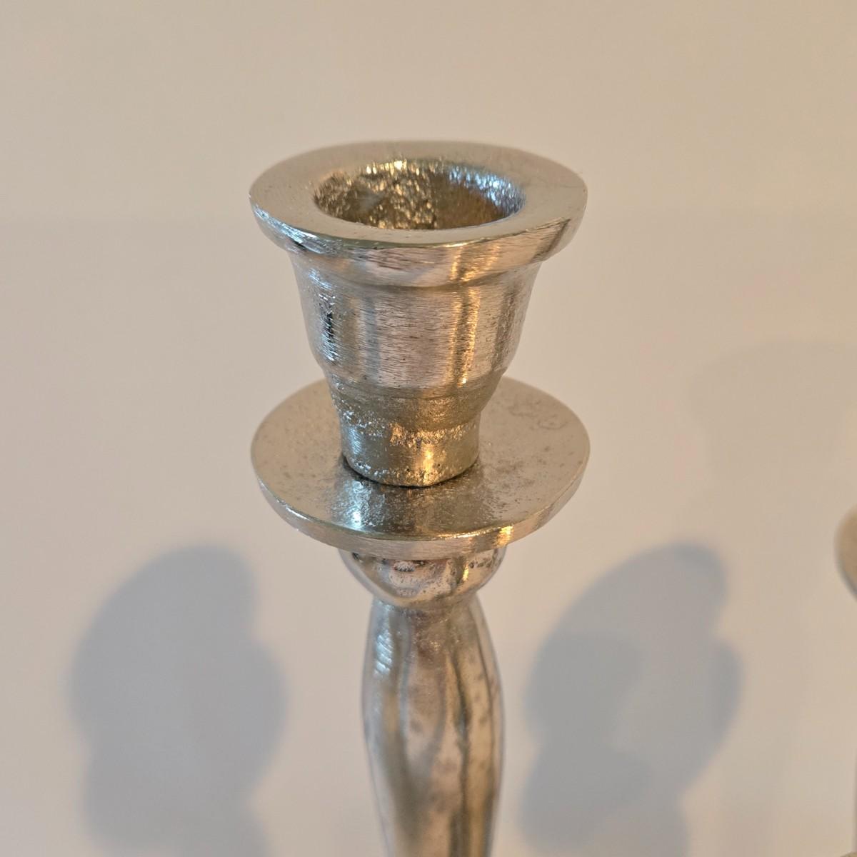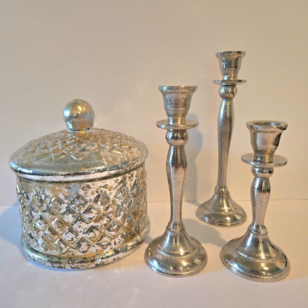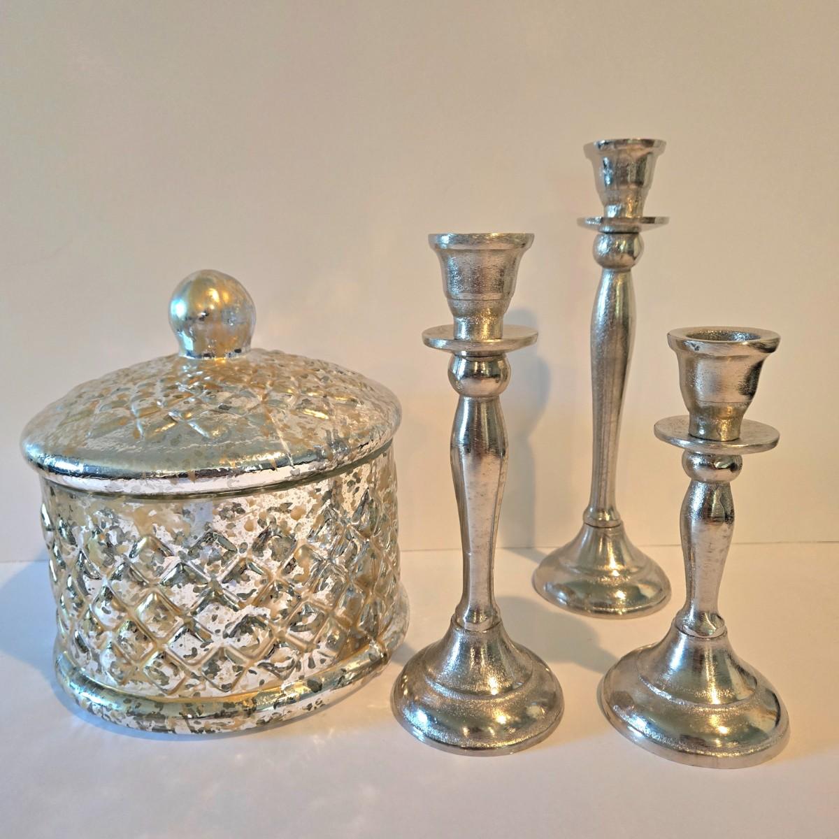 LOT 113Z: Decorative Glass Apothecary Jar and Three Silver-tone Candlesticks
