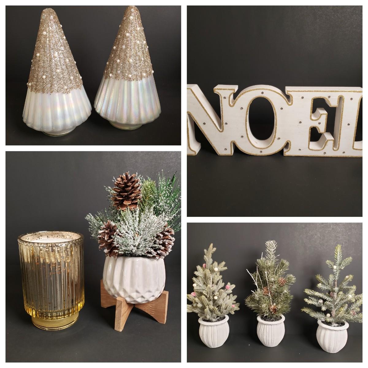 LOT 184B: Holiday Tabletop Decor; Beaded Iridescent Glass Trees, Artificial Potted Pine Trees & More