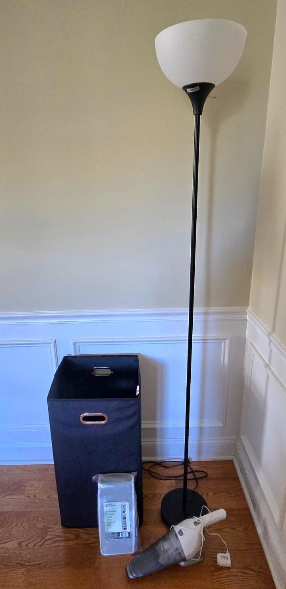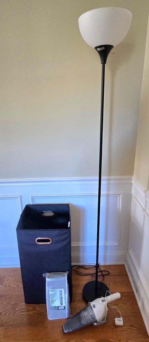 LOT 208H: Dorm Room Essentials/ Floor Lamp, Clothes Hamper, Hanging Shelf Organizer, and Hand Vacuum