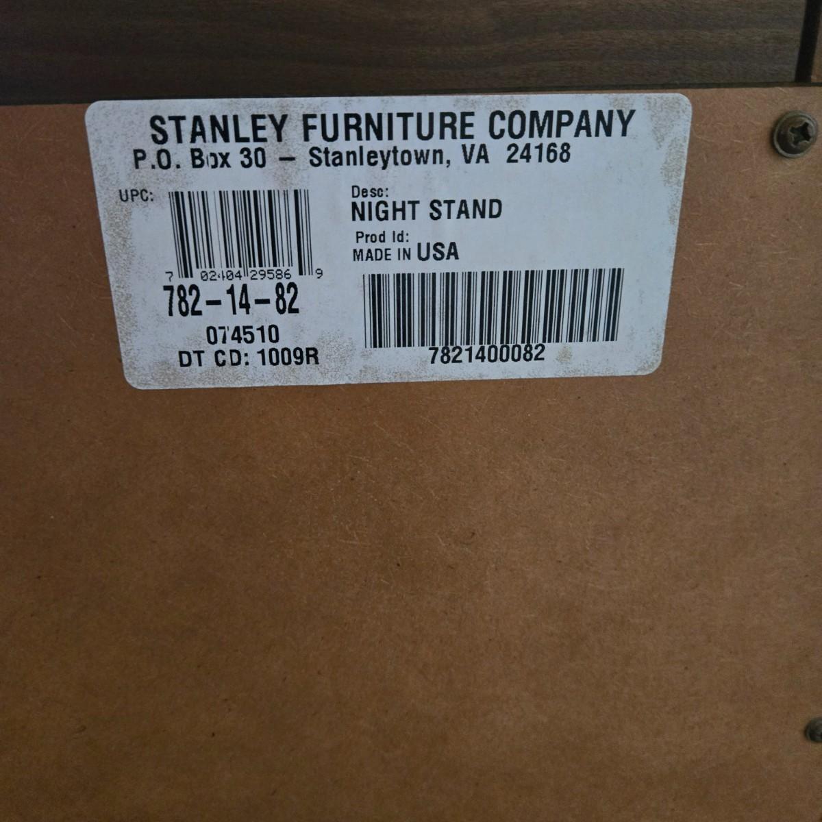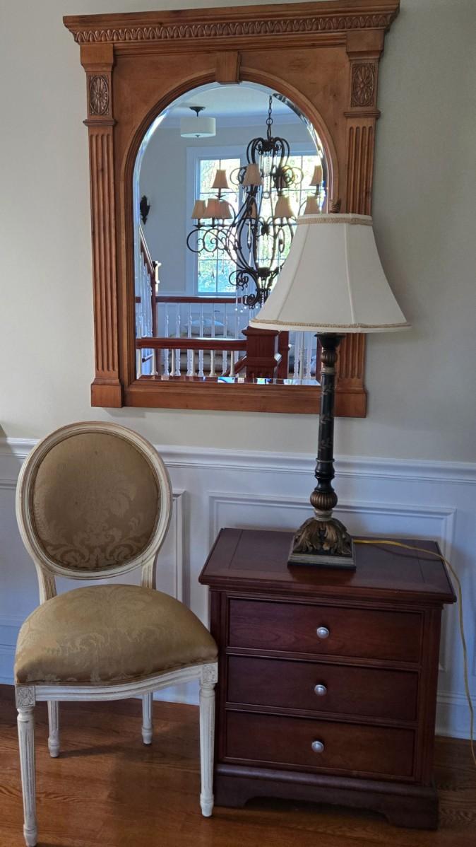 LOT 210H: Stanley Furniture Night Stand, Upholstered Chair, Large Wooden Framed Mirror, and Decorative Lamp