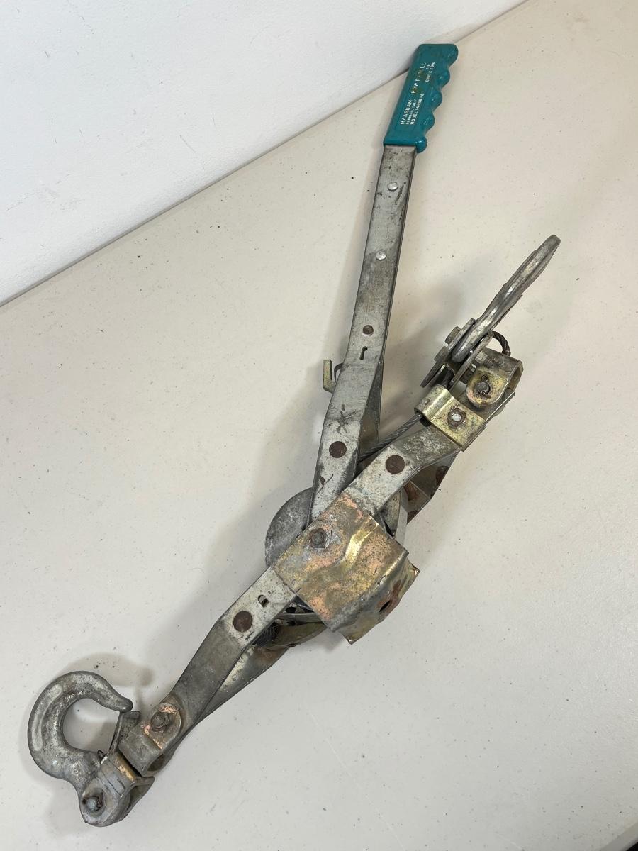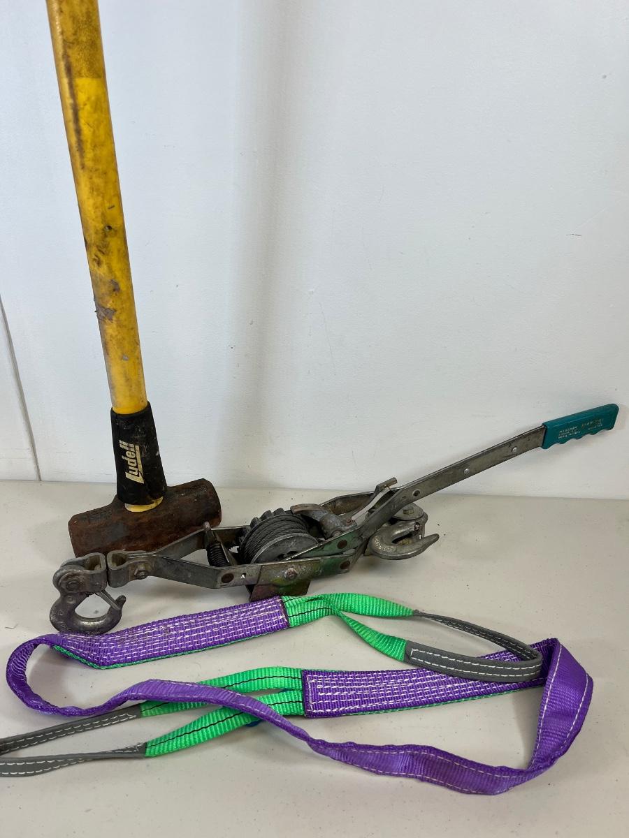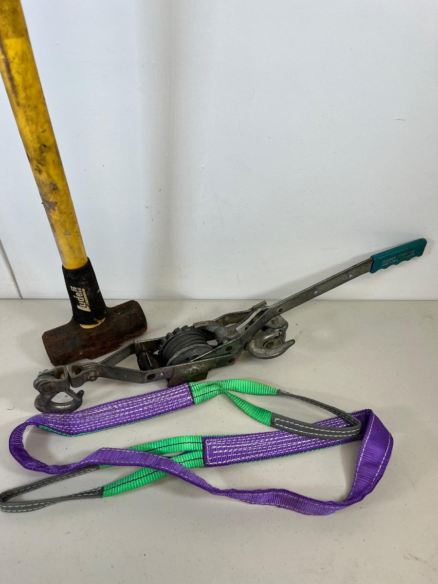 LOT 77: Maasdam Pow'R-Pull Winch, Sledgehammer and Strap